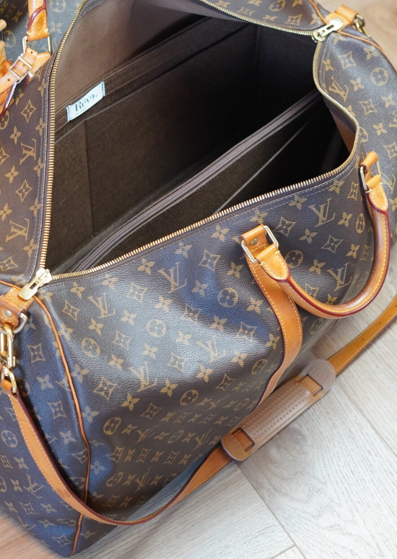 De bag insert is afgewerkt met zilverkleurige hardware en past perfect in Keepall’s of soortgelijke tassen.