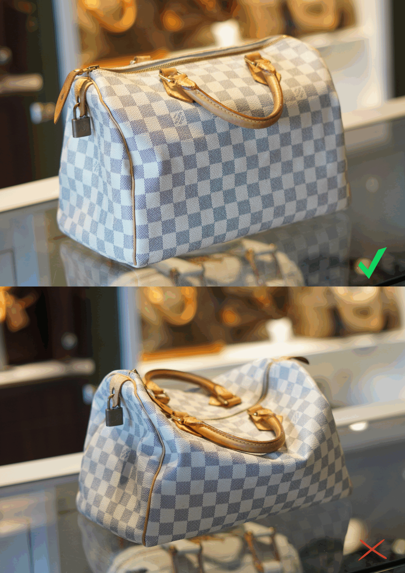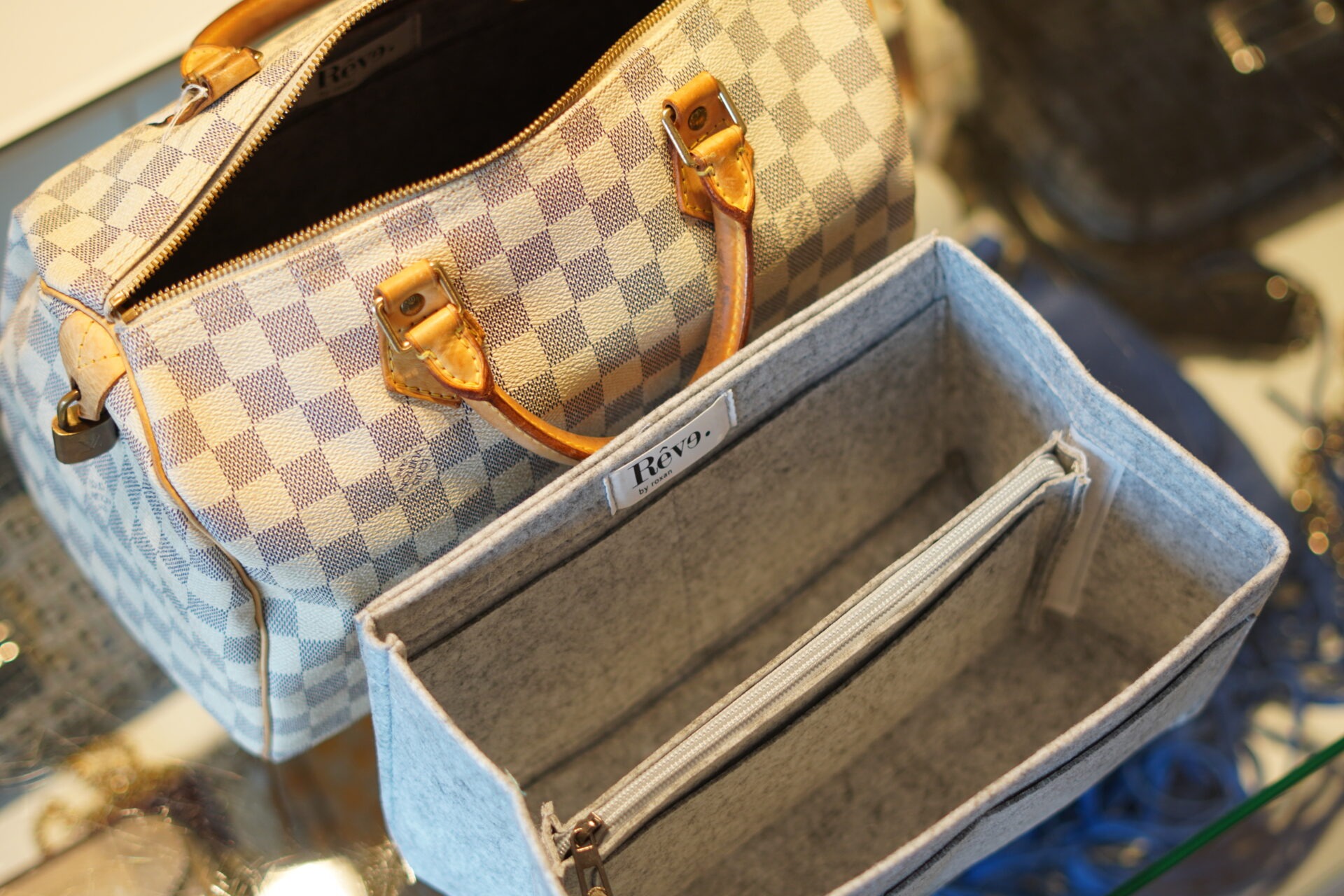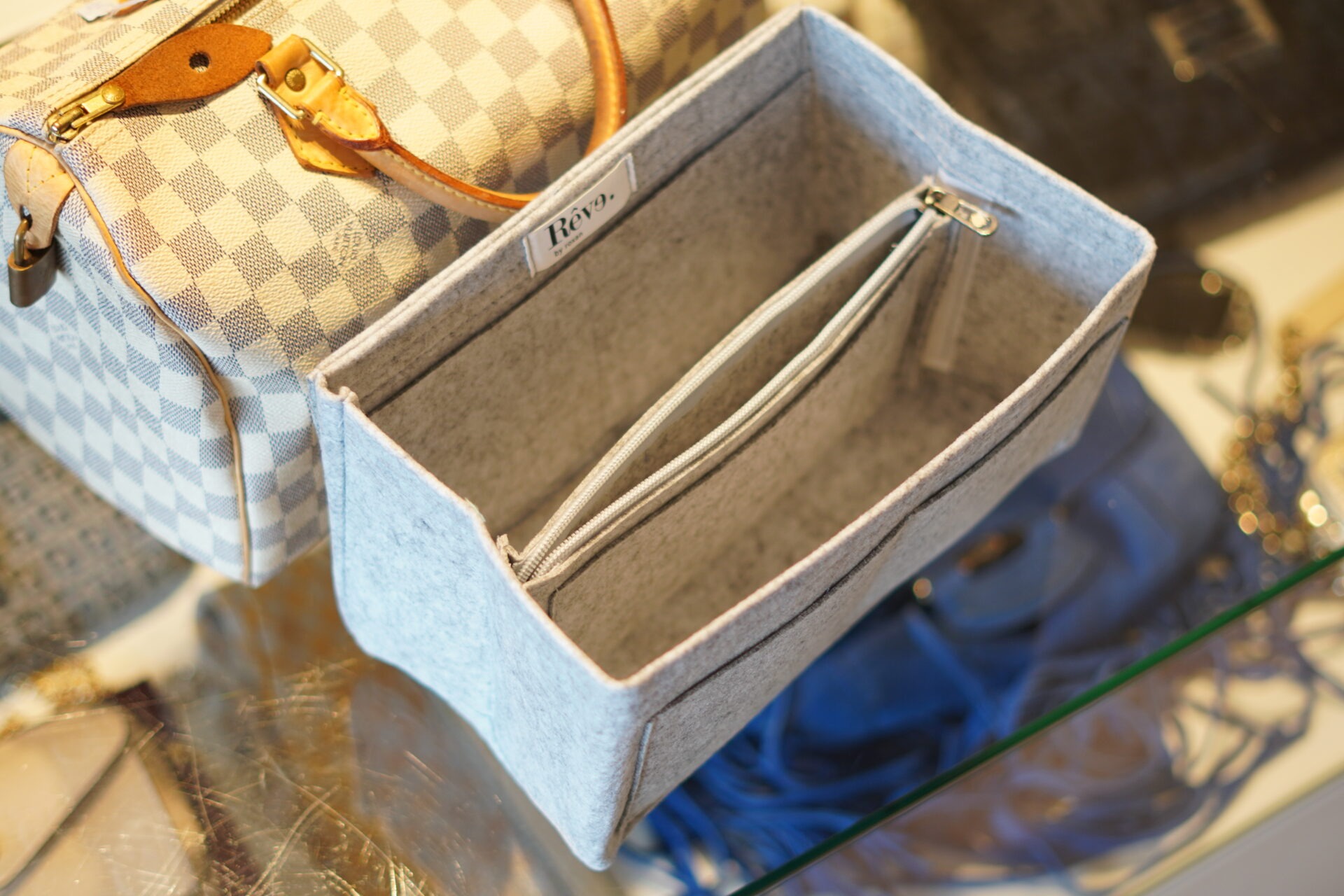 De bag insert is afgewerkt met zilverkleurige hardware en past perfect in een Speedy, Boston of soortgelijke tassen.
