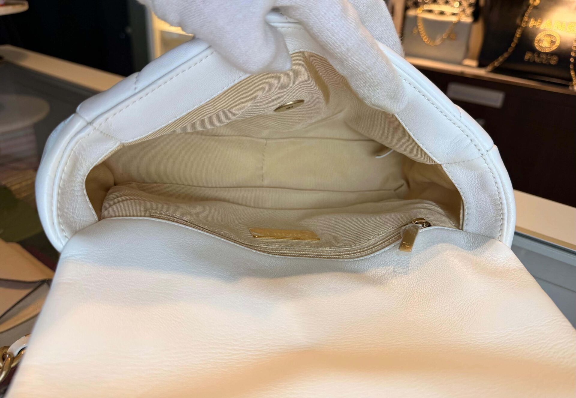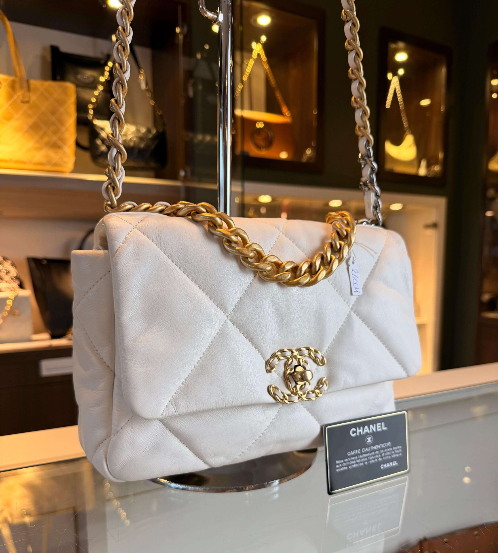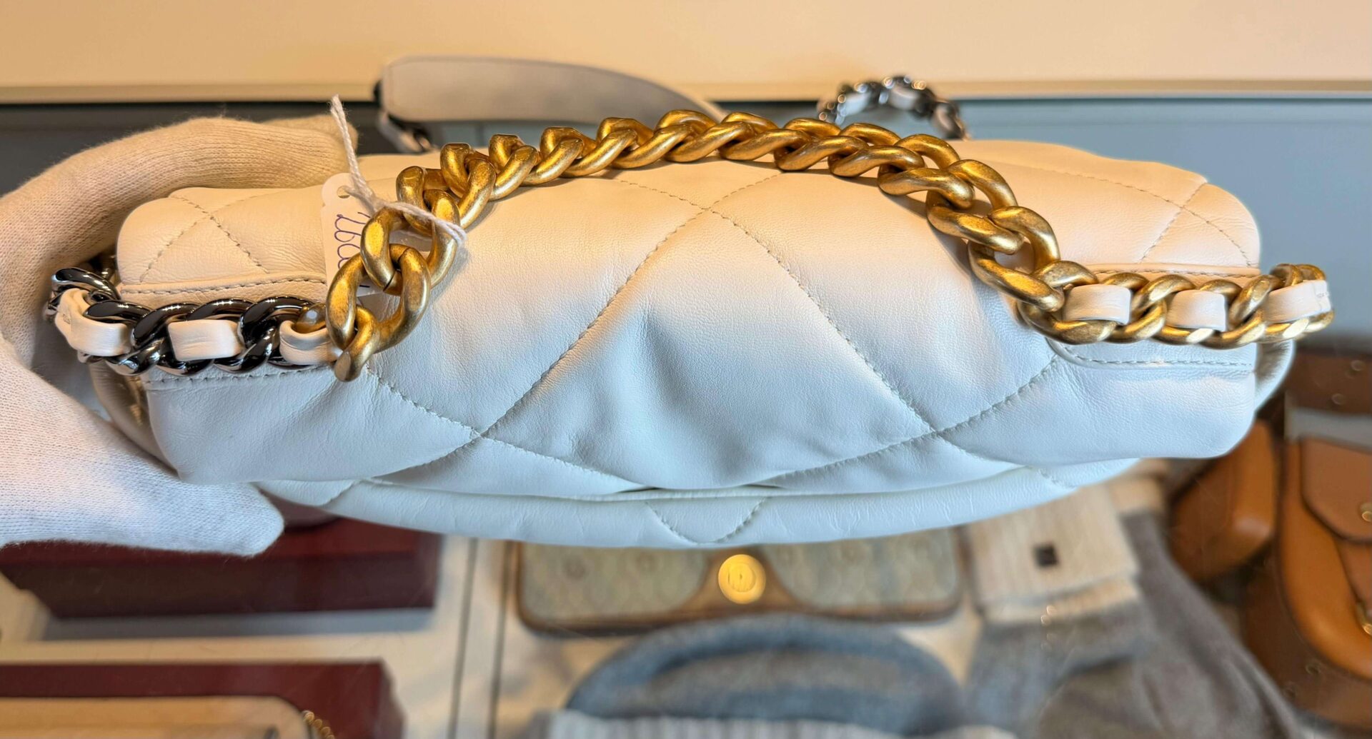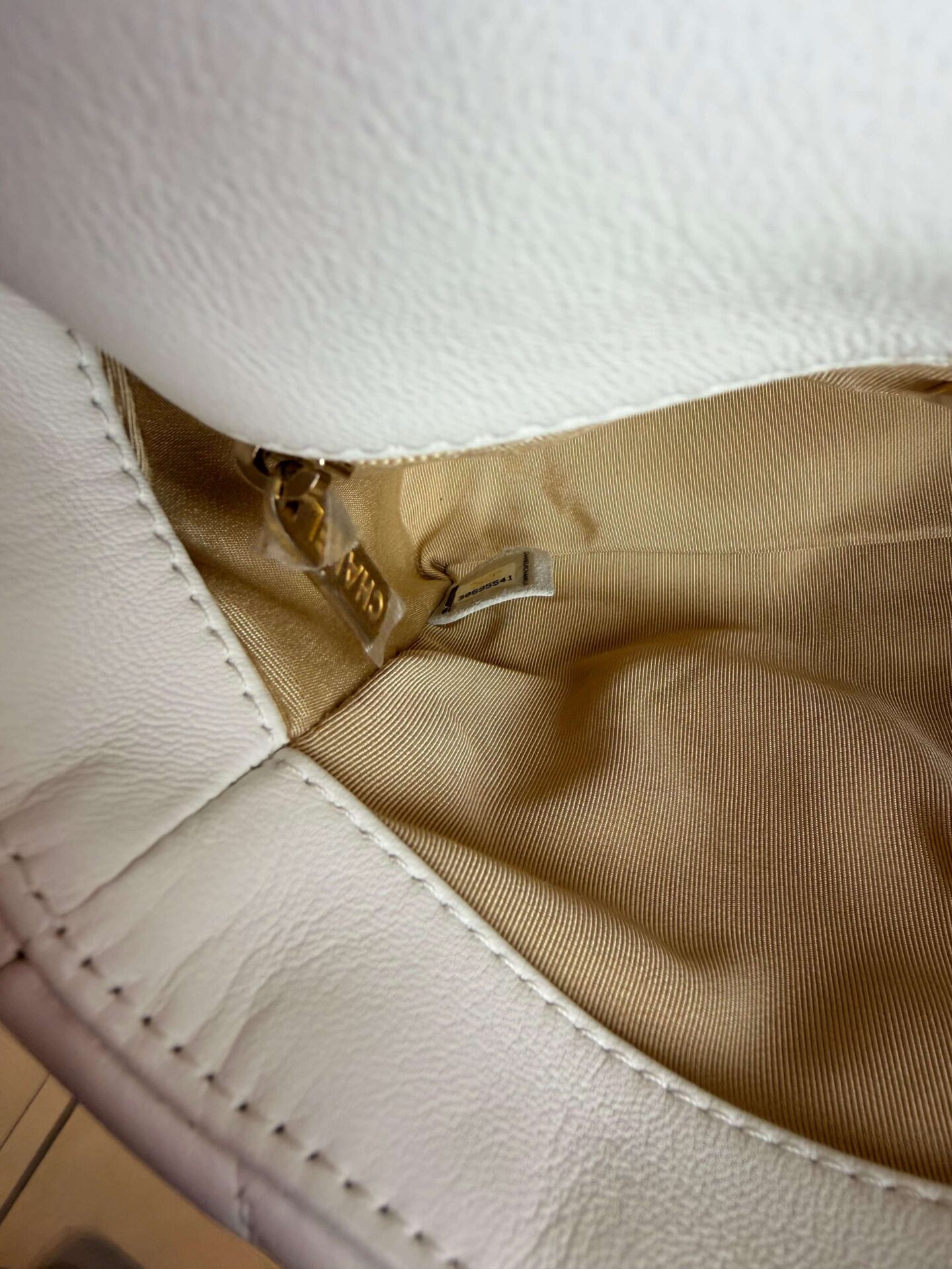 Chanel 19 tas in mooi witleder en bi-color kleurige hardware, namelijk ruthenium en verouderde gouden finishes. Ook heeft ze een dubbele CC sluiting met verweven leer. Ze is in nieuwstaat en een superleuke handtas en crossbody tas! Ze is een 30 serie, wat betekent dat ze uit het jaartal 2020 komt.