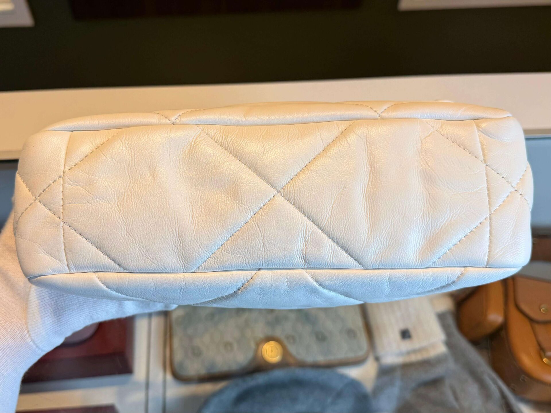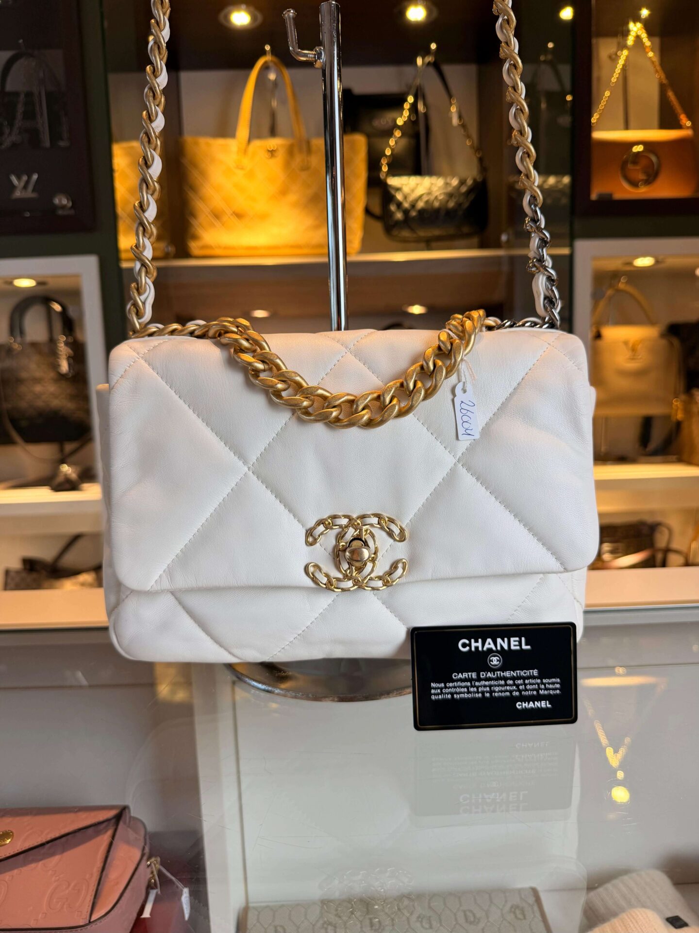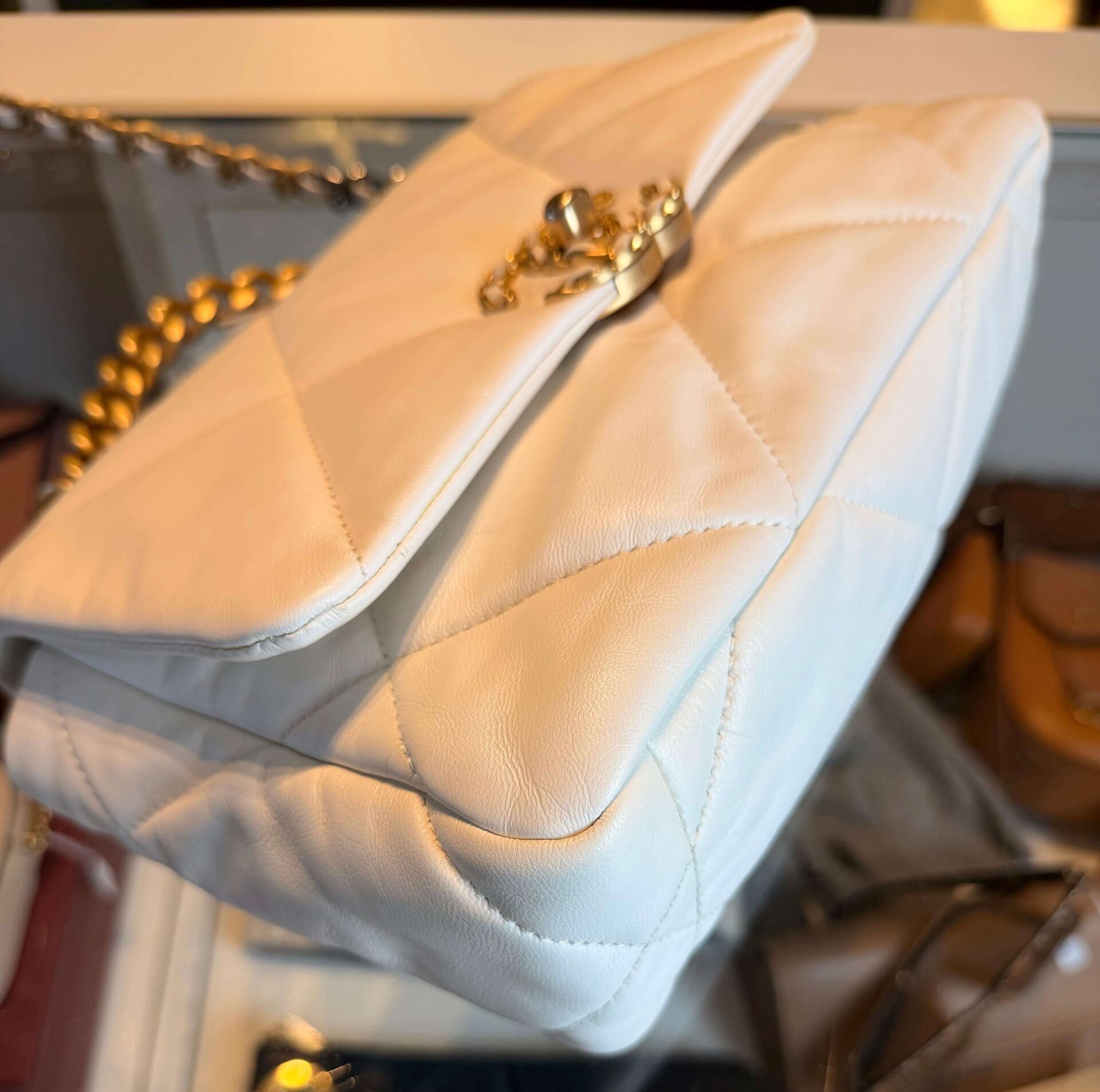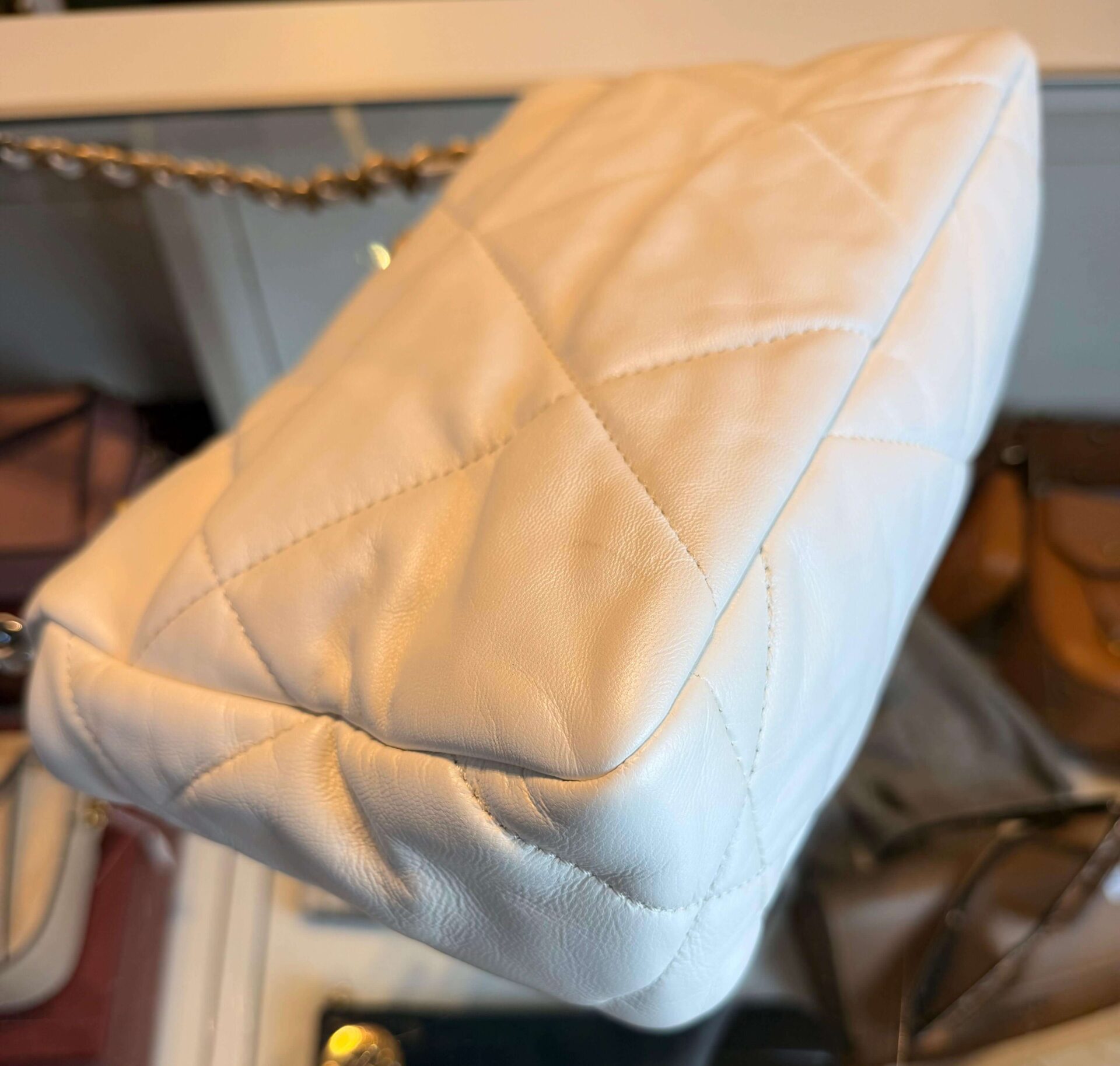 Chanel 19 tas in mooi witleder en bi-color kleurige hardware, namelijk ruthenium en verouderde gouden finishes. Ook heeft ze een dubbele CC sluiting met verweven leer. Ze is in nieuwstaat en een superleuke handtas en crossbody tas! Ze is een 30 serie, wat betekent dat ze uit het jaartal 2020 komt.