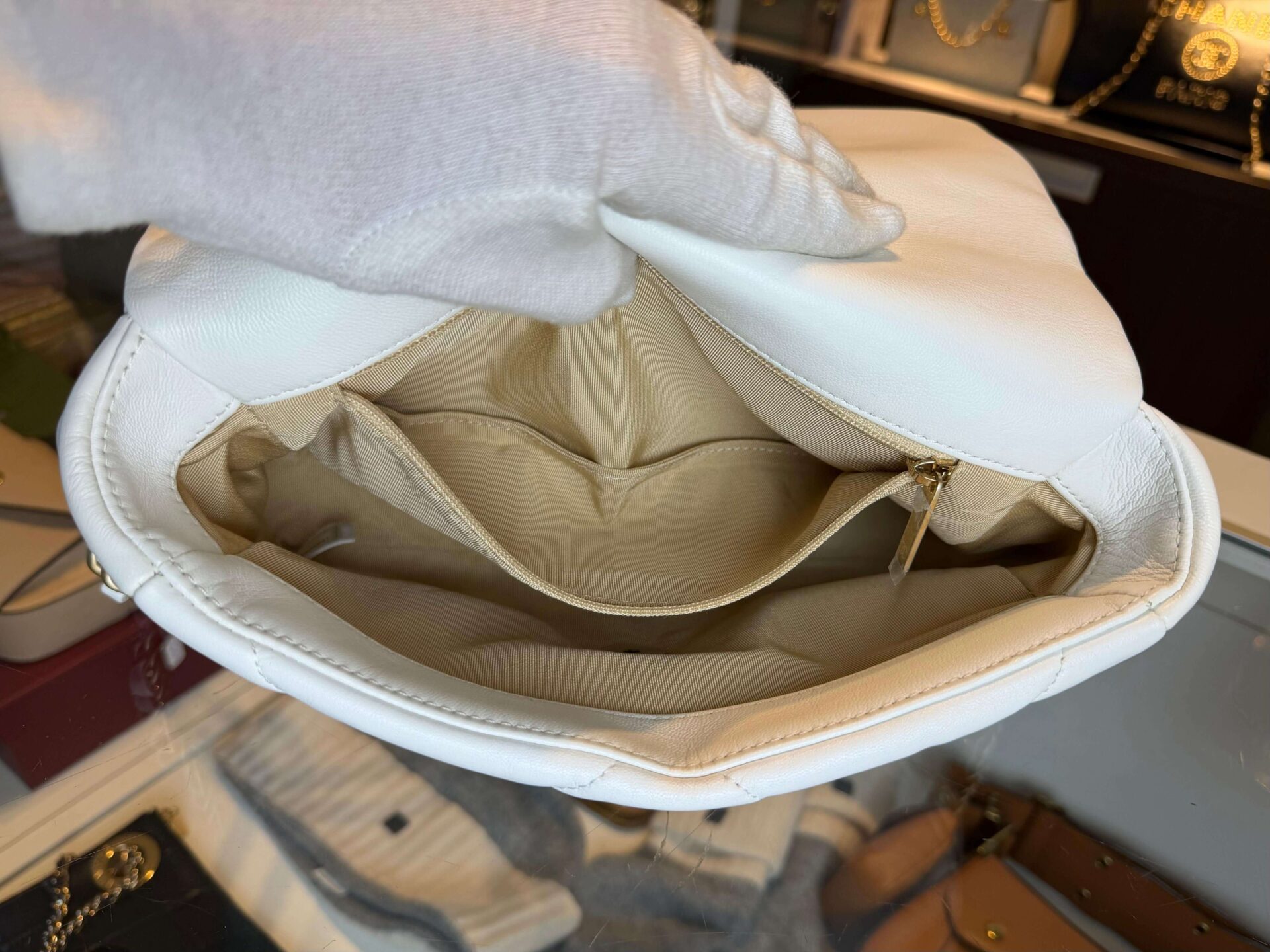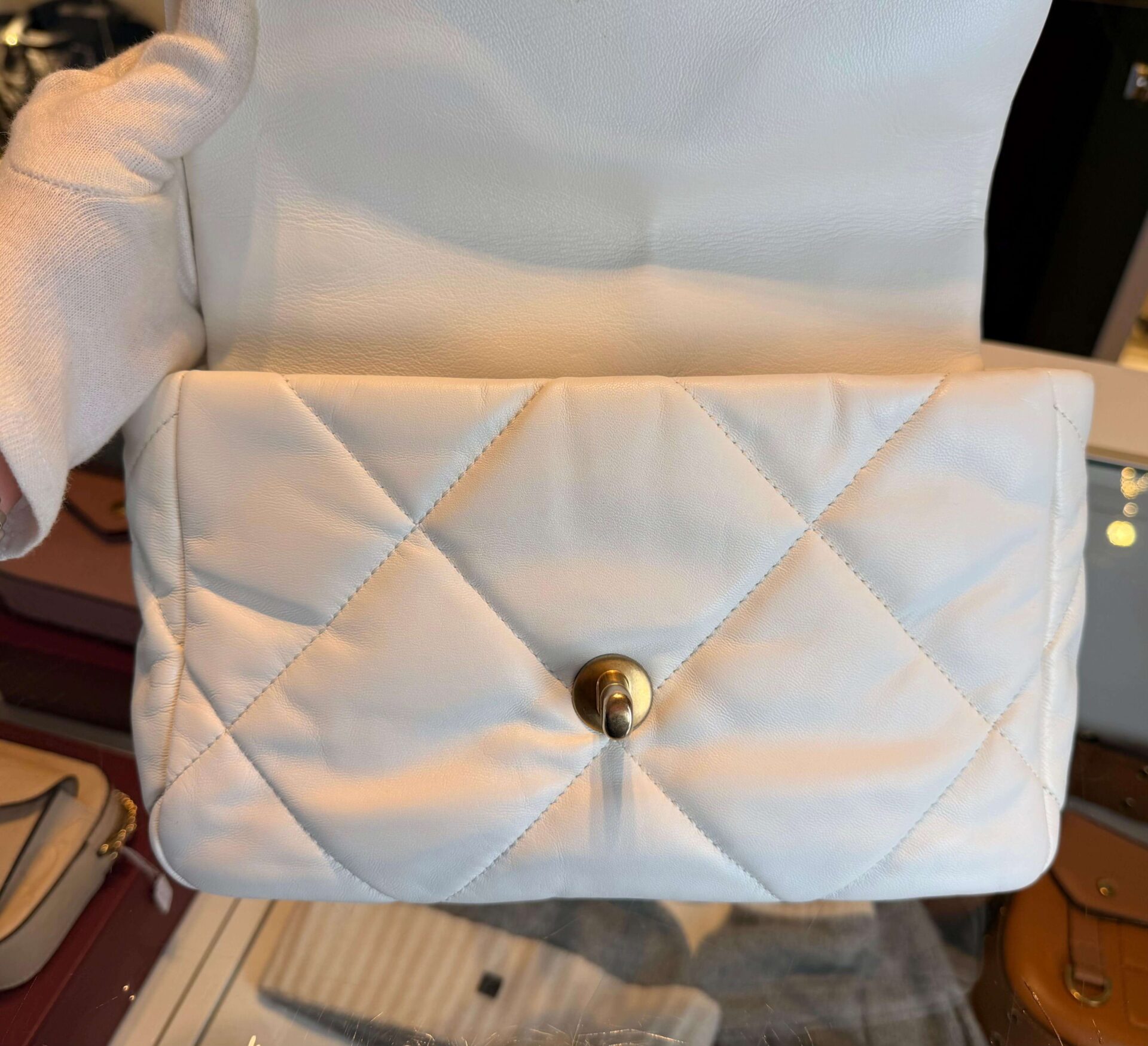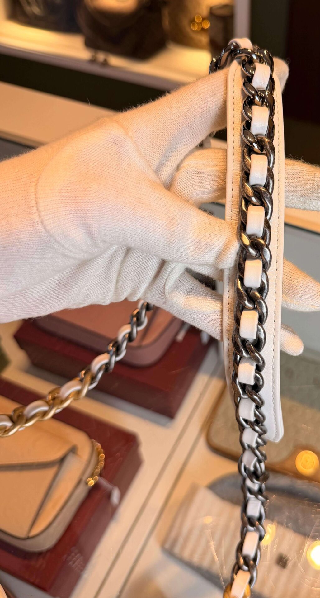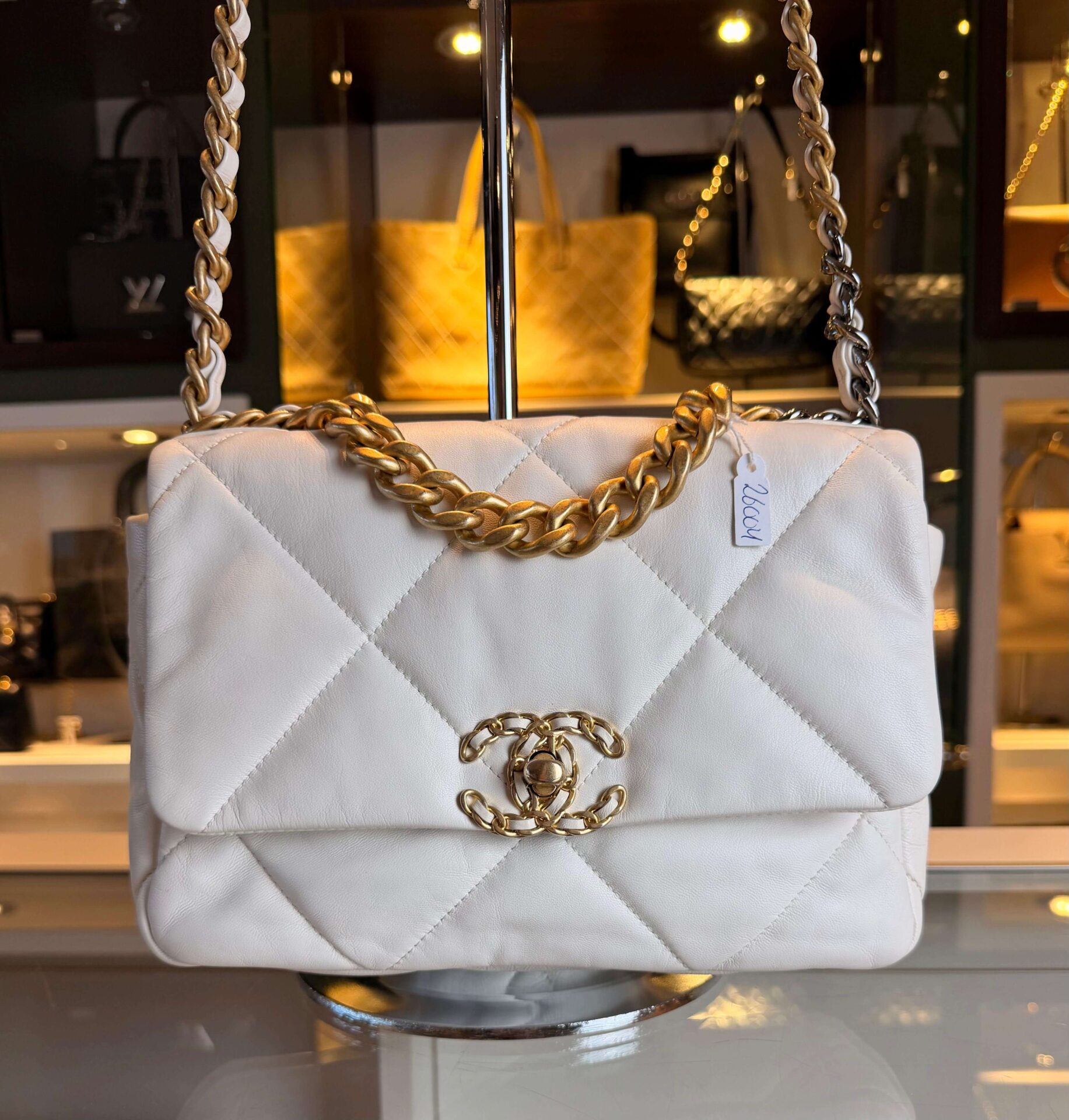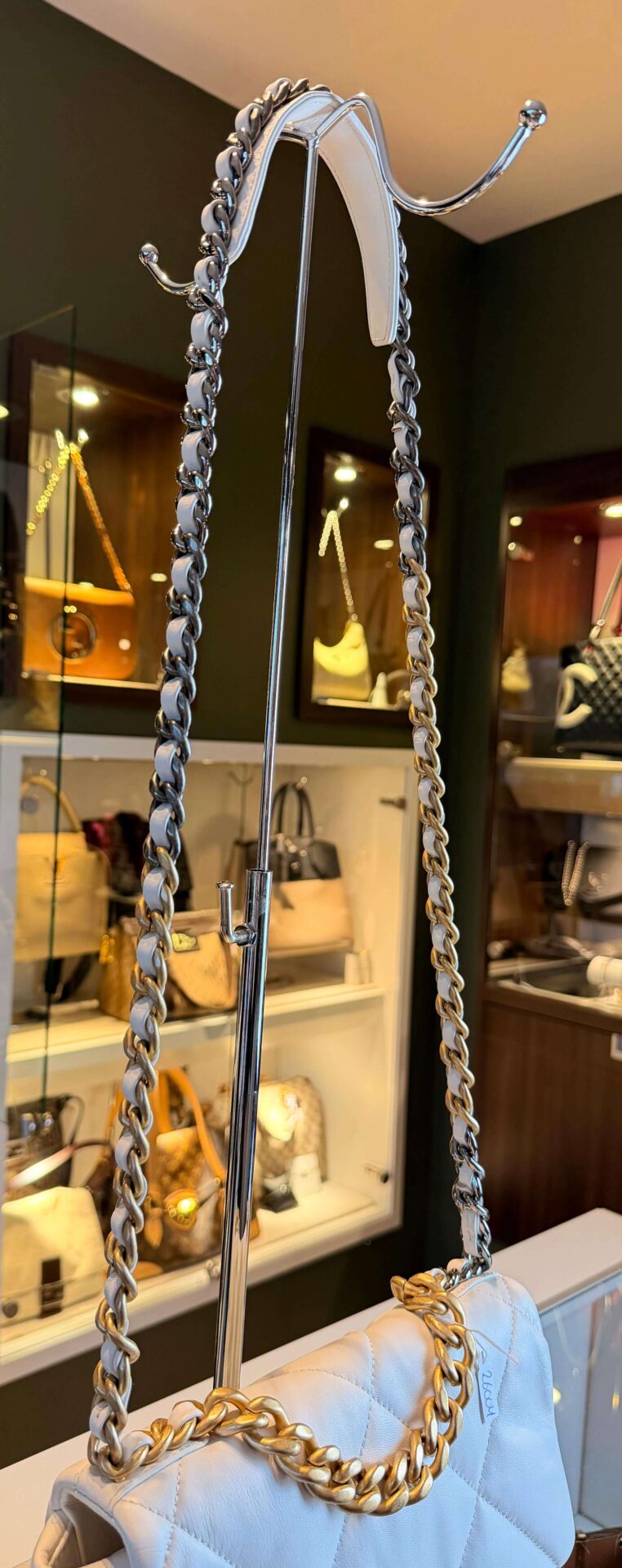 Chanel 19 tas in mooi witleder en bi-color kleurige hardware, namelijk ruthenium en verouderde gouden finishes. Ook heeft ze een dubbele CC sluiting met verweven leer. Ze is in nieuwstaat en een superleuke handtas en crossbody tas! Ze is een 30 serie, wat betekent dat ze uit het jaartal 2020 komt.