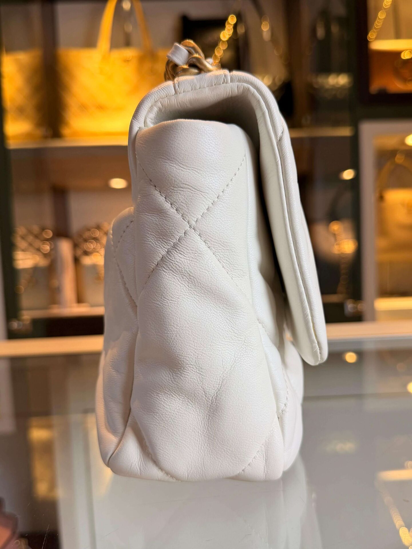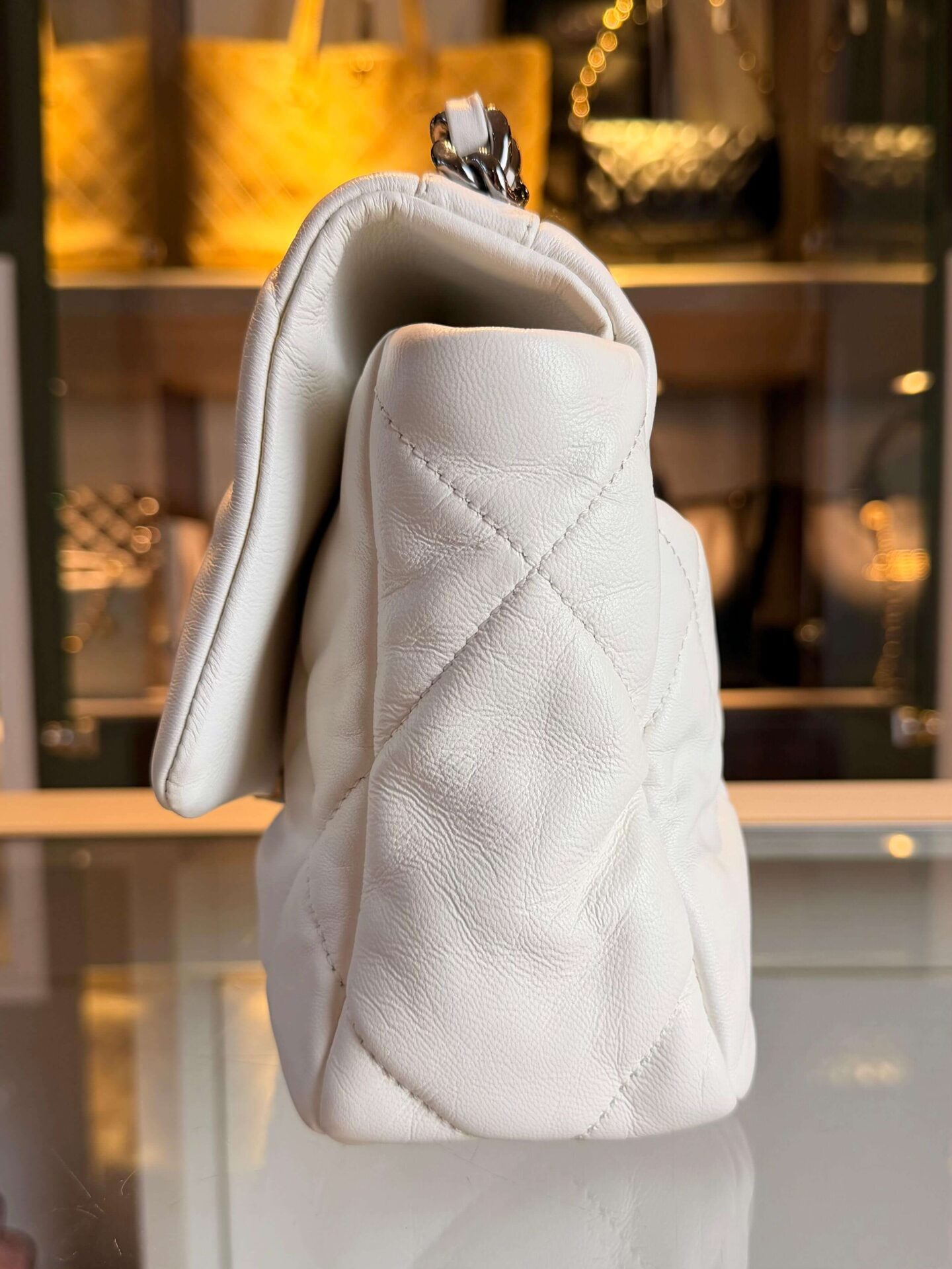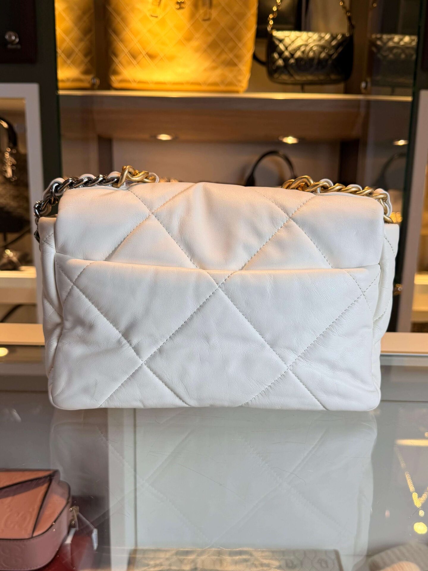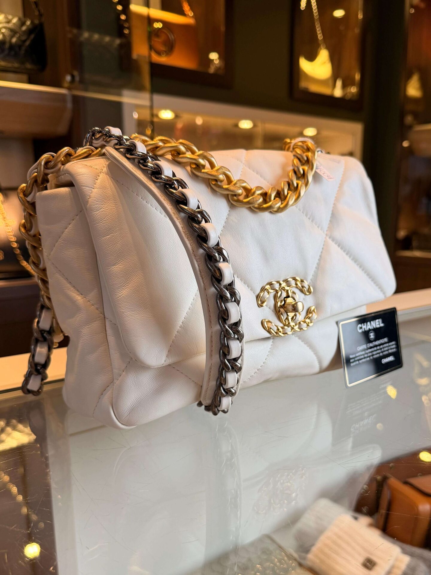 Chanel 19 tas in mooi witleder en bi-color kleurige hardware, namelijk ruthenium en verouderde gouden finishes. Ook heeft ze een dubbele CC sluiting met verweven leer. Ze is in nieuwstaat en een superleuke handtas en crossbody tas! Ze is een 30 serie, wat betekent dat ze uit het jaartal 2020 komt.