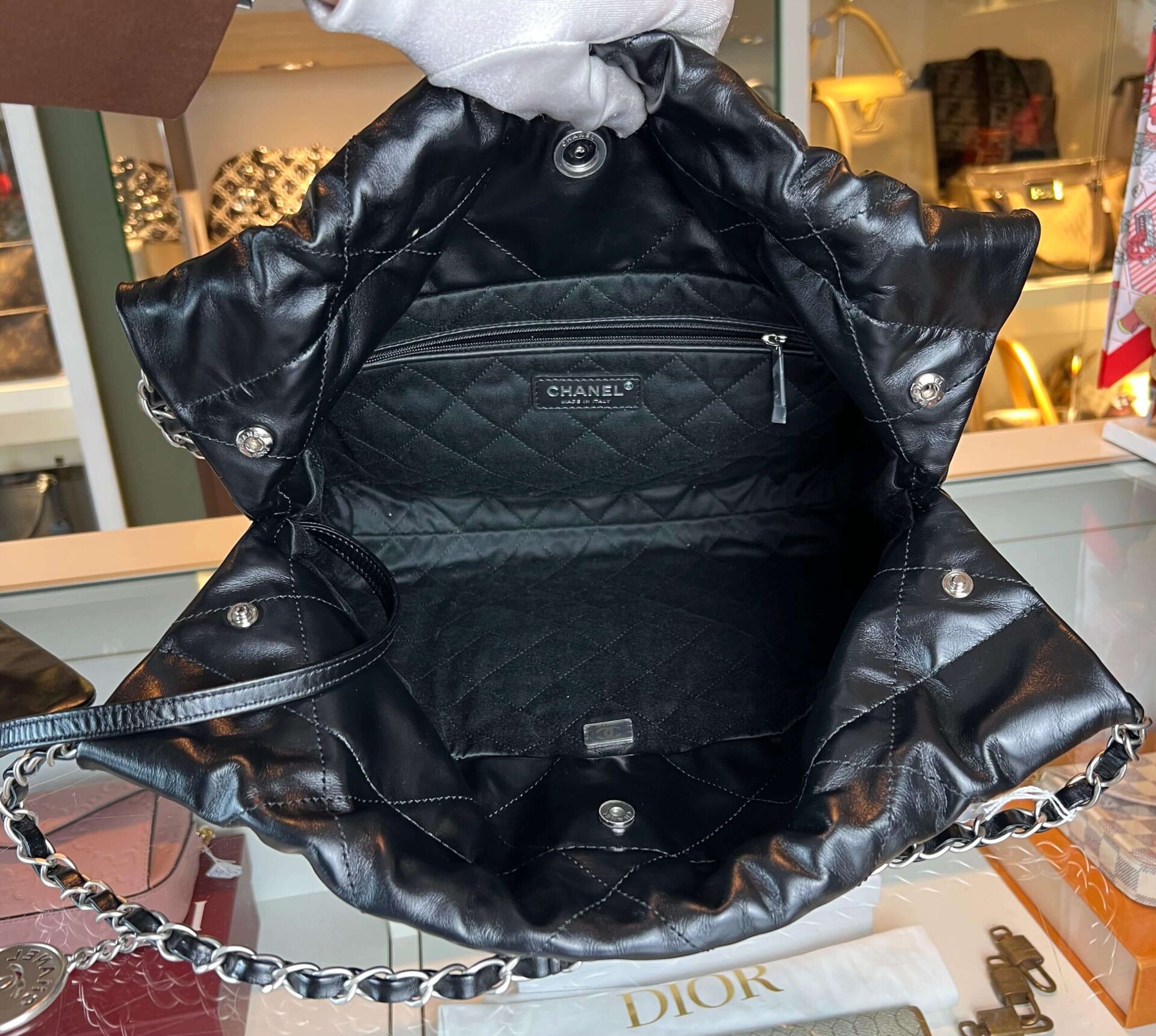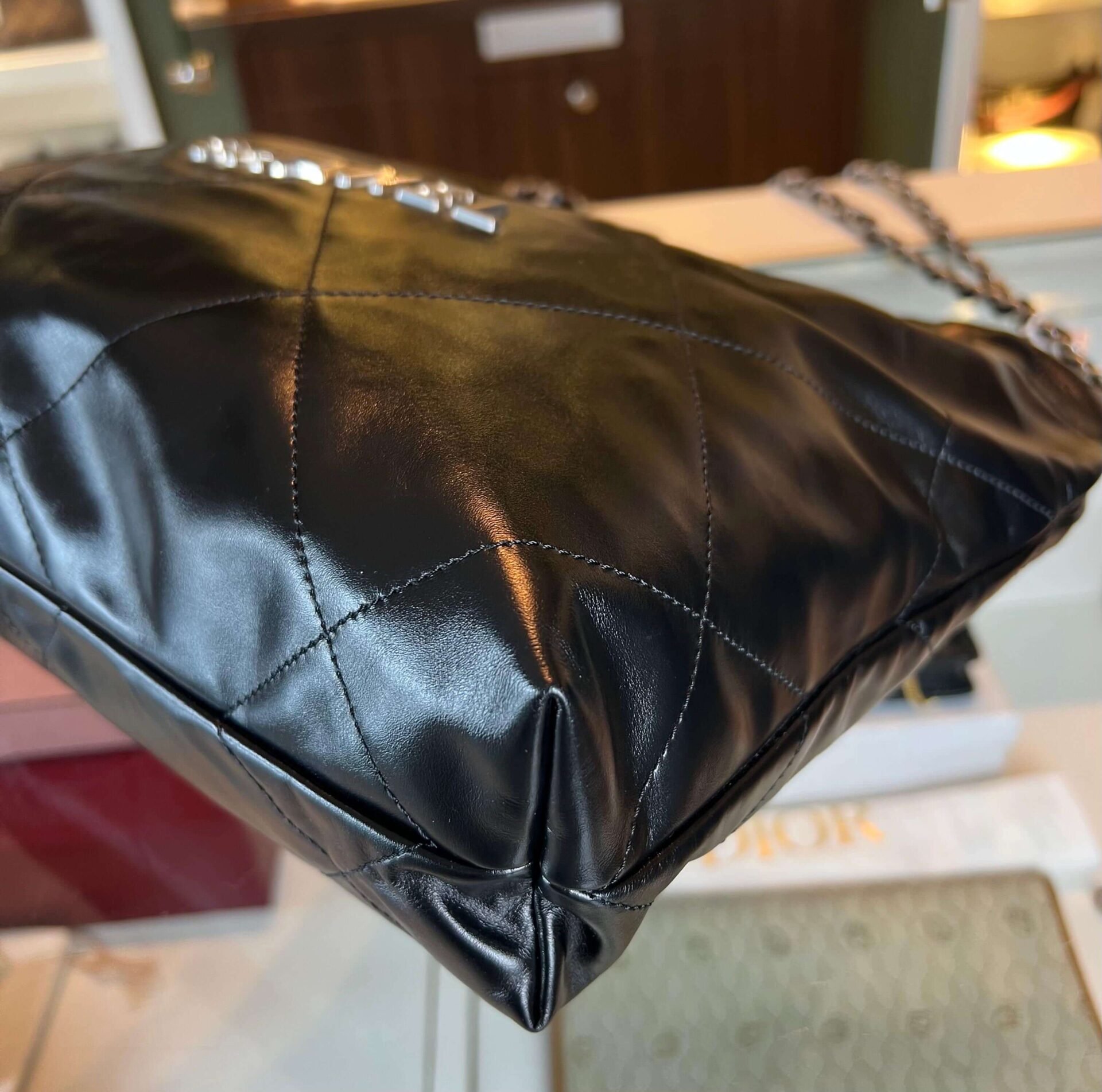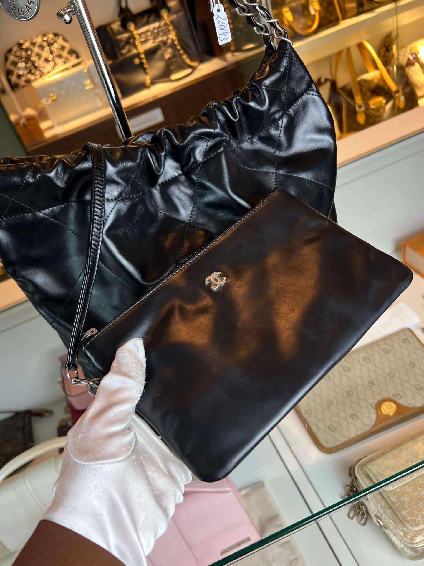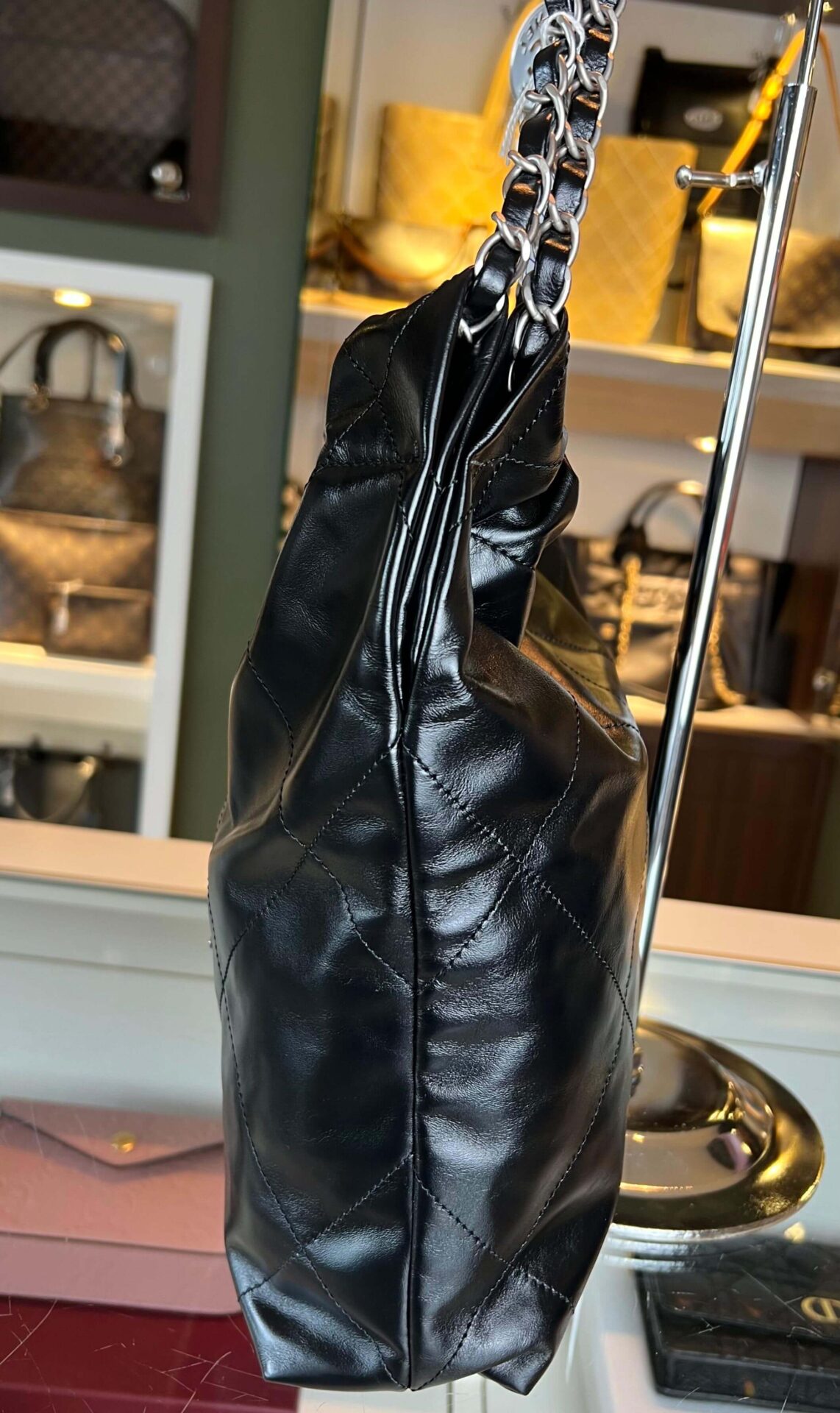 De ontzettend leuke Chanel 22 Hobo Small in mooi glanzend kalfsleder met zilveren hardware in nieuwstaat! Alle stickers zitten nog op de hardware. Ze komt uit 2024 in een volledig full set met Entrupy certificaat.