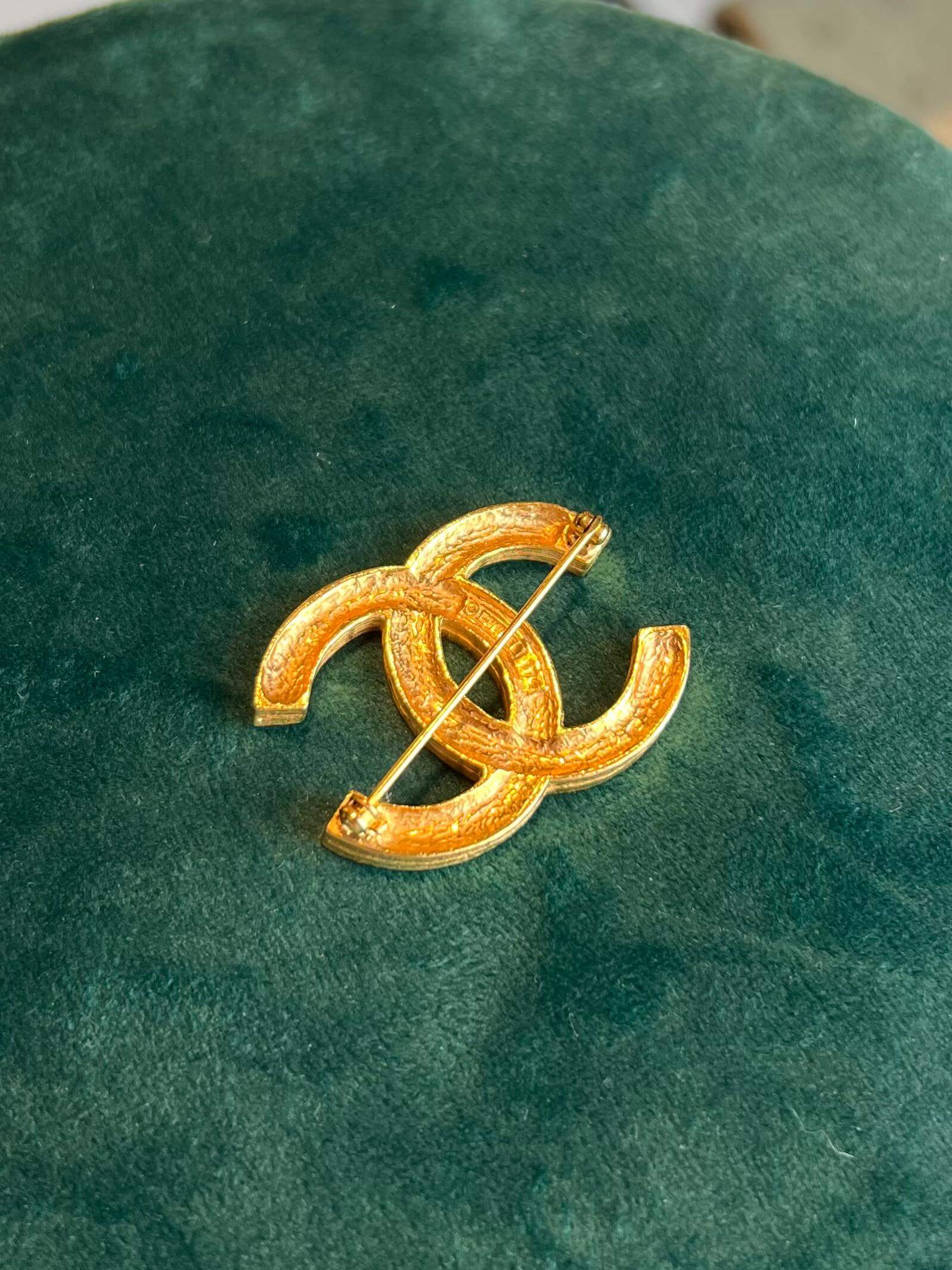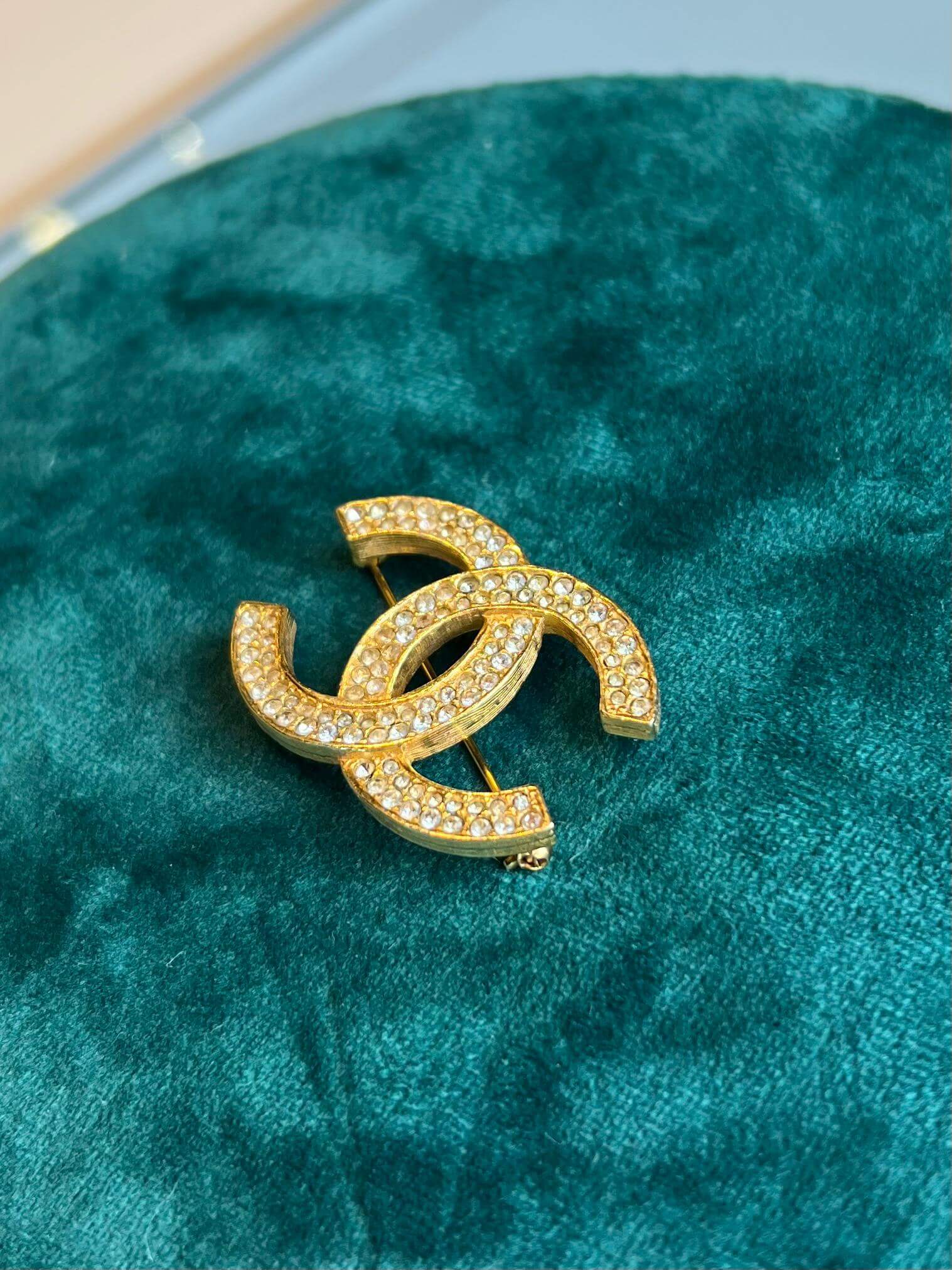 Mooie Vintage Chanel broche CC Coco Mark Zirkonia uit de jaren 90. Ze is gold-plated met zirkonia steentjes, zonder doos, 4,5 x 3 cm. Het is een broche met pin.