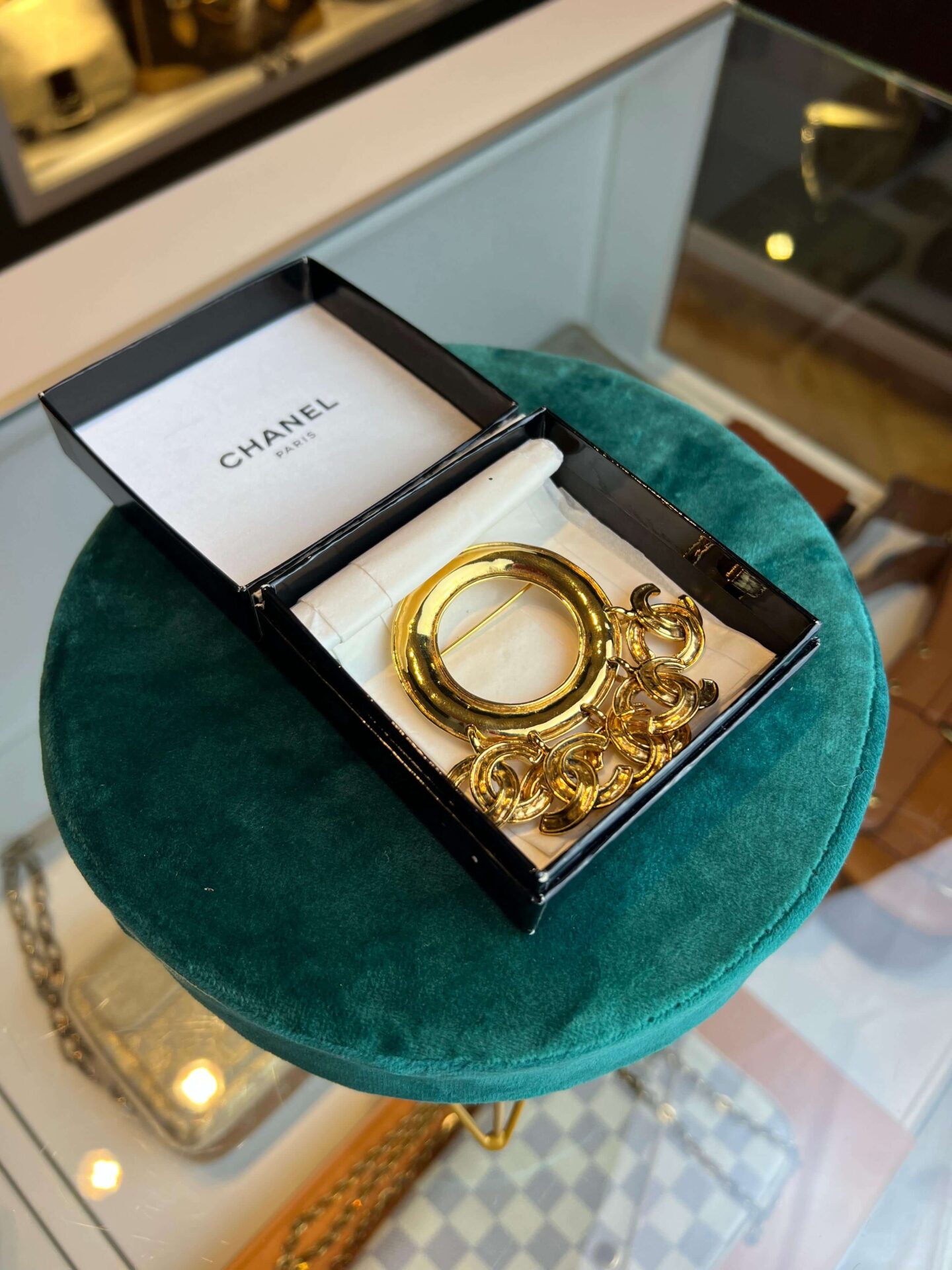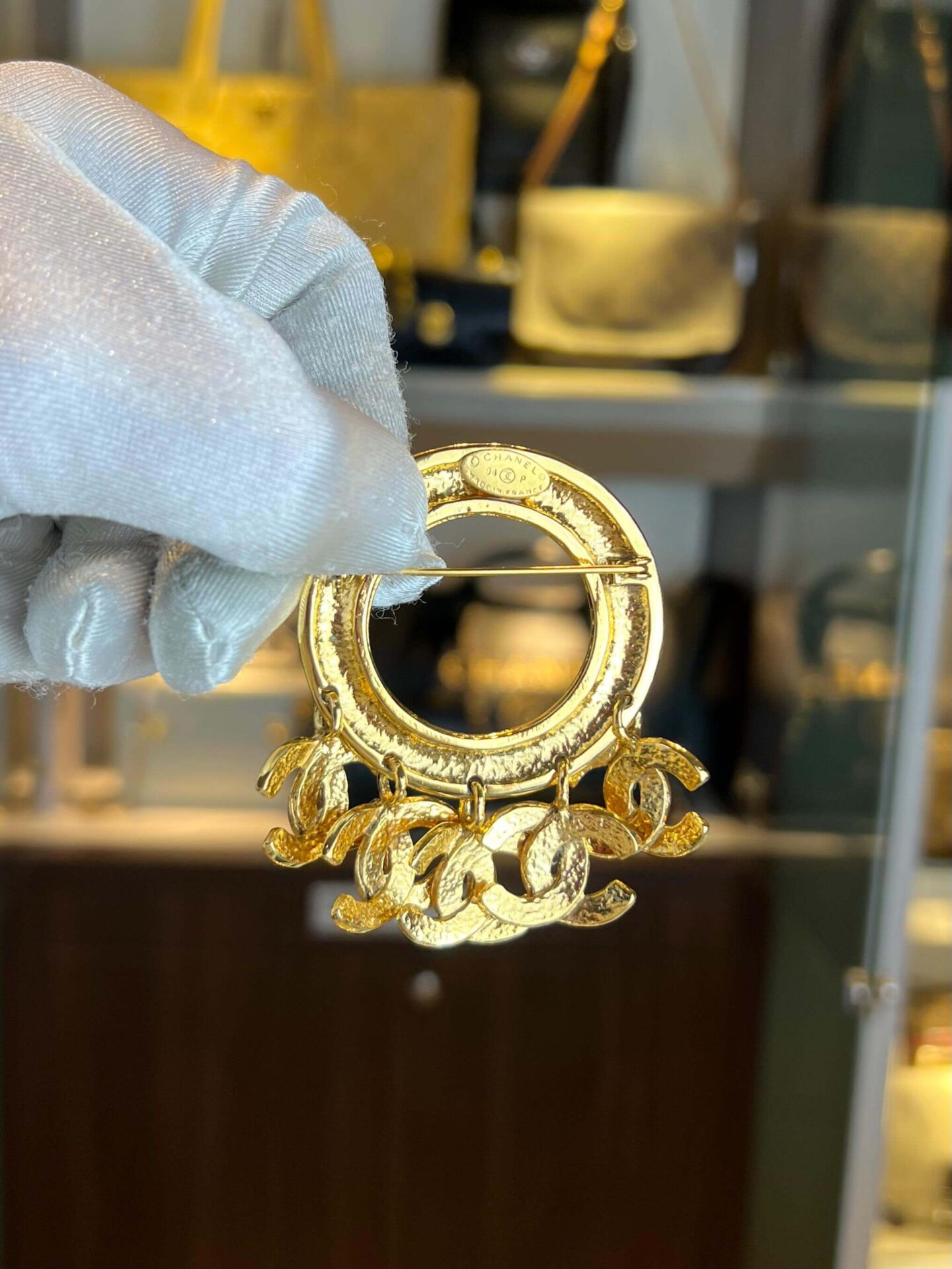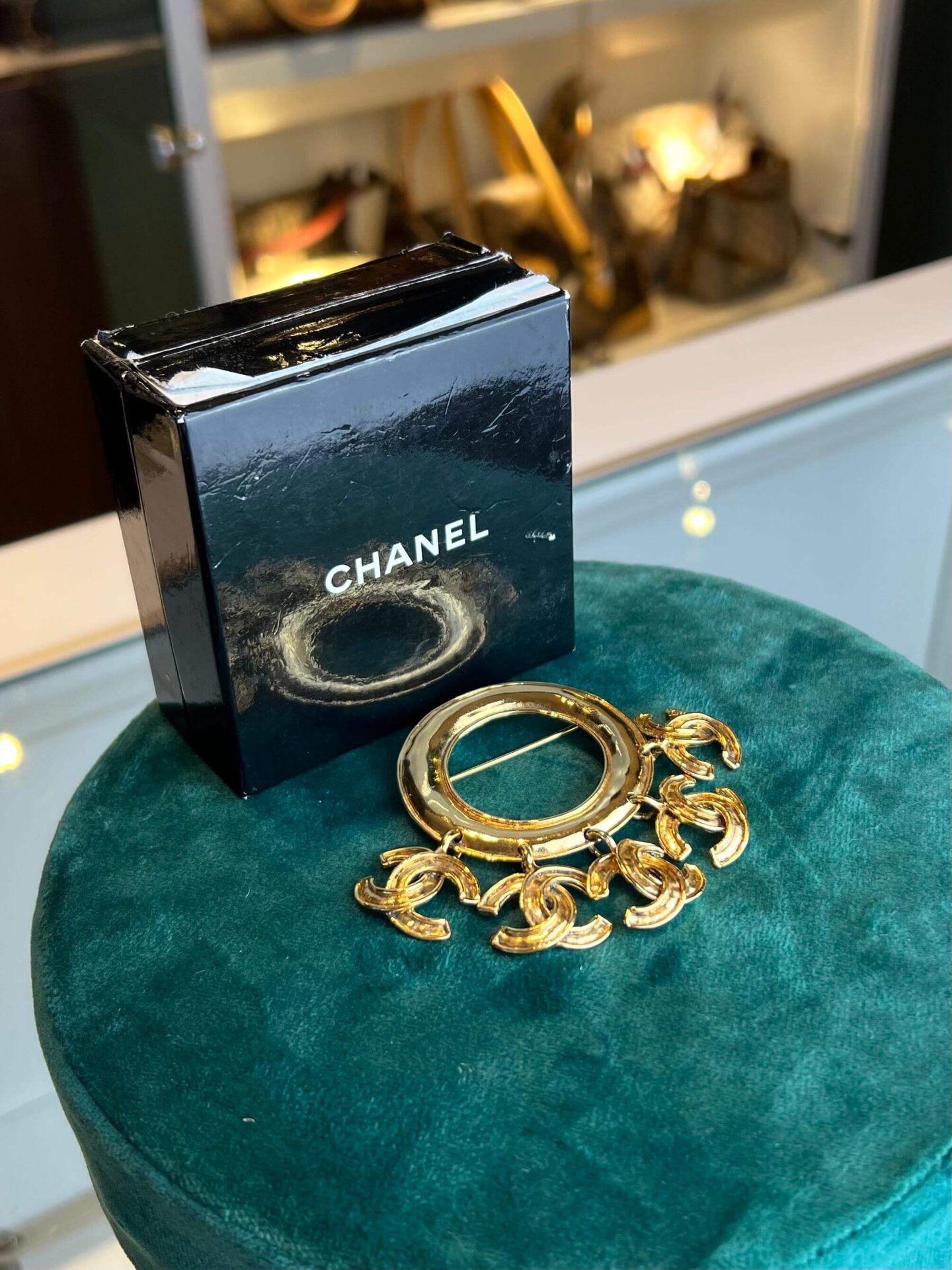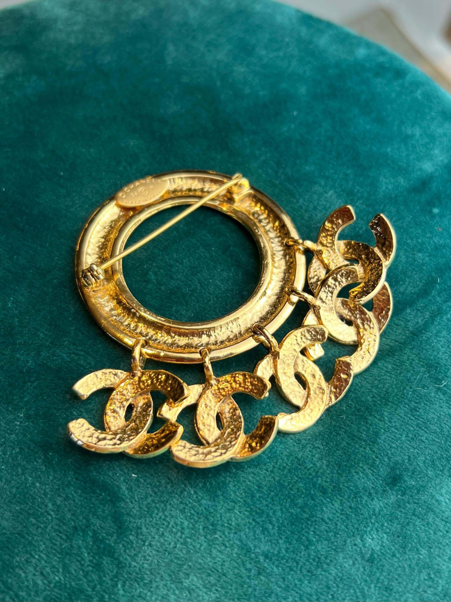 Chanel broche Icon Series 5x mini CC uit 1994, in zeer goede staat! Ze is gold-plated met doos. Het gouden rondje is 5×5 cm. De Mini CC bangles zijn 2×2 cm.