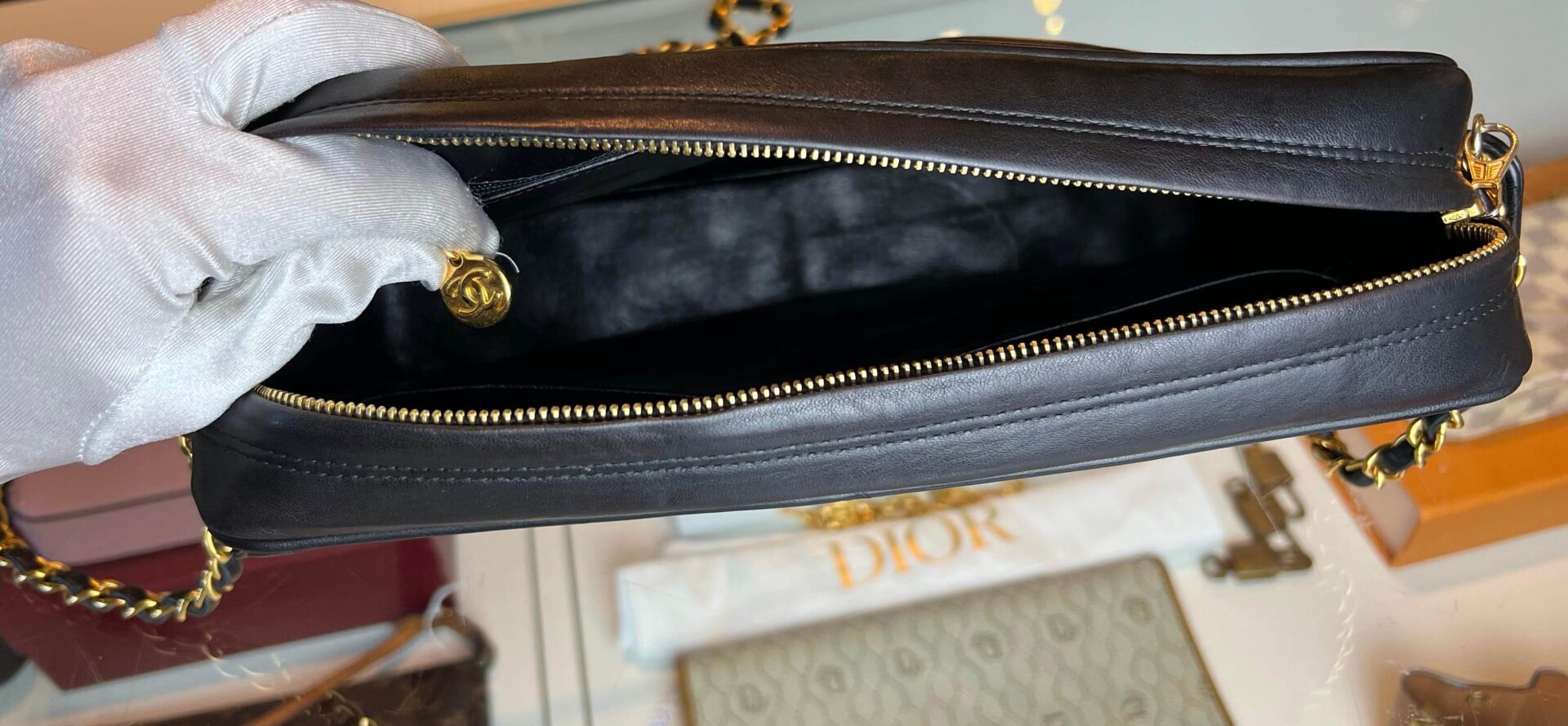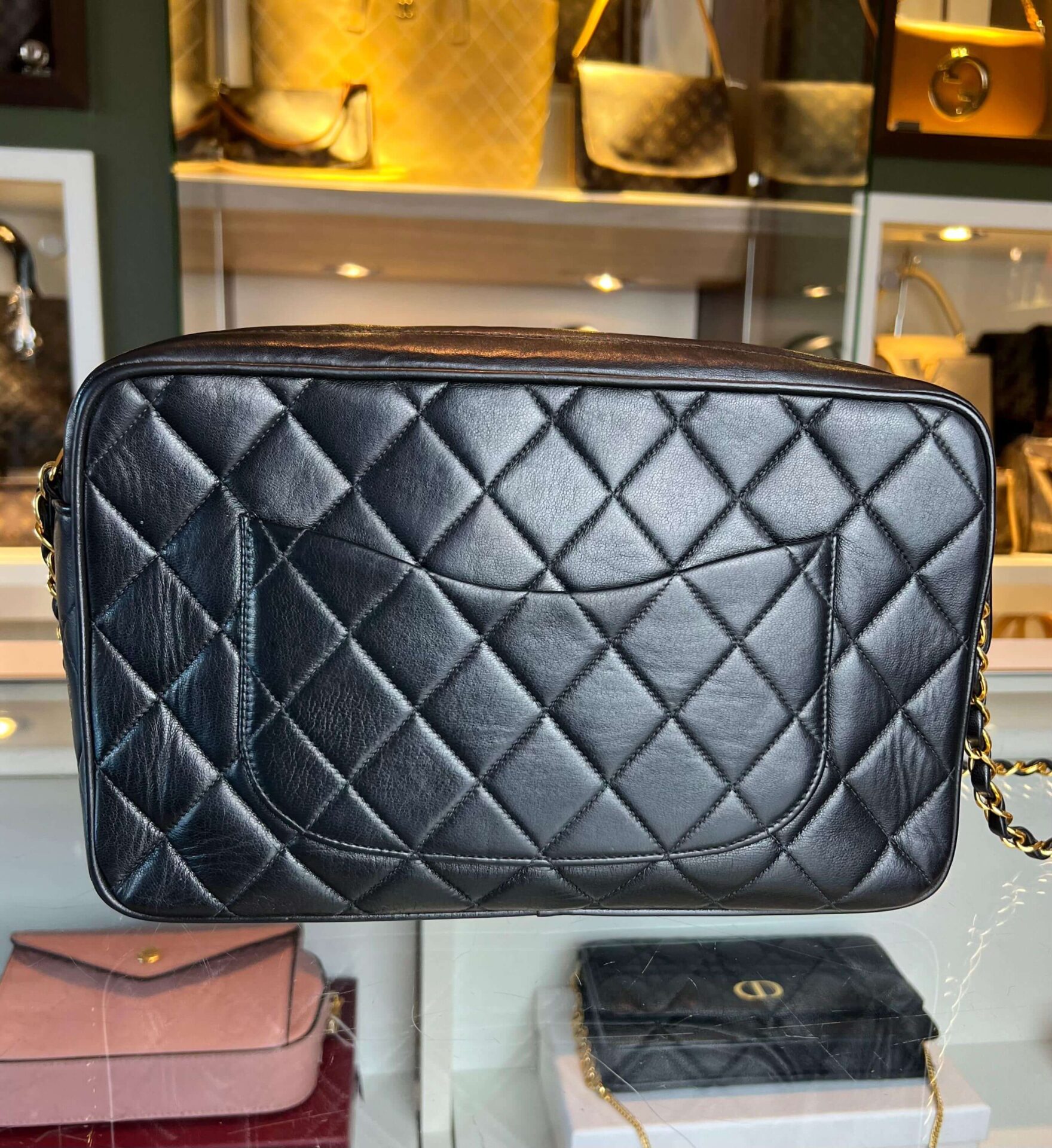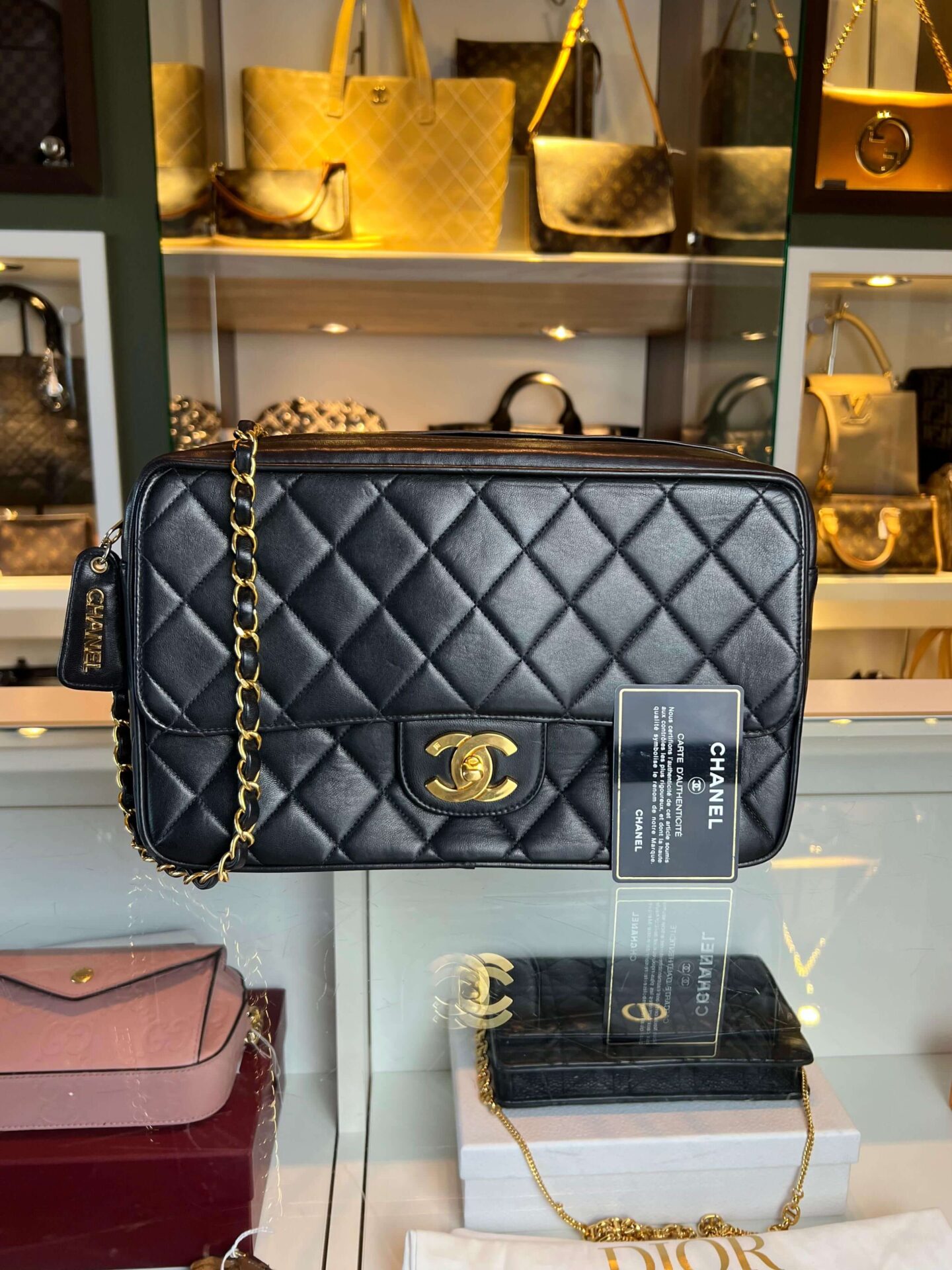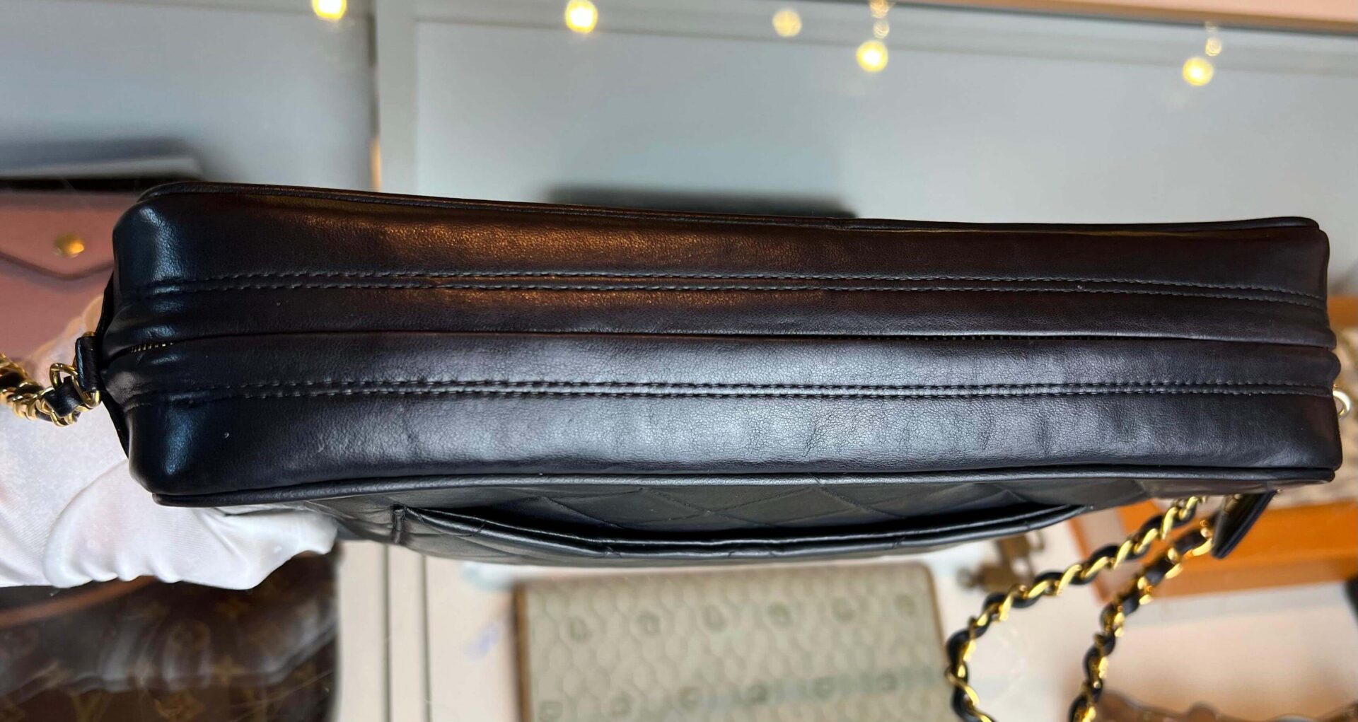 Chanel CC Camera Flap Bag in zwart lamsleder en 24k verguld gouden hardware. Het is een crossbody tas in de maat large, ze heeft een voorvak welk geopend kan worden met de CC lock, en 1 hoofd compartiment achter de rits. Ze komt met authenticiteit kaart (3 serie) en Entrupy certificaat!