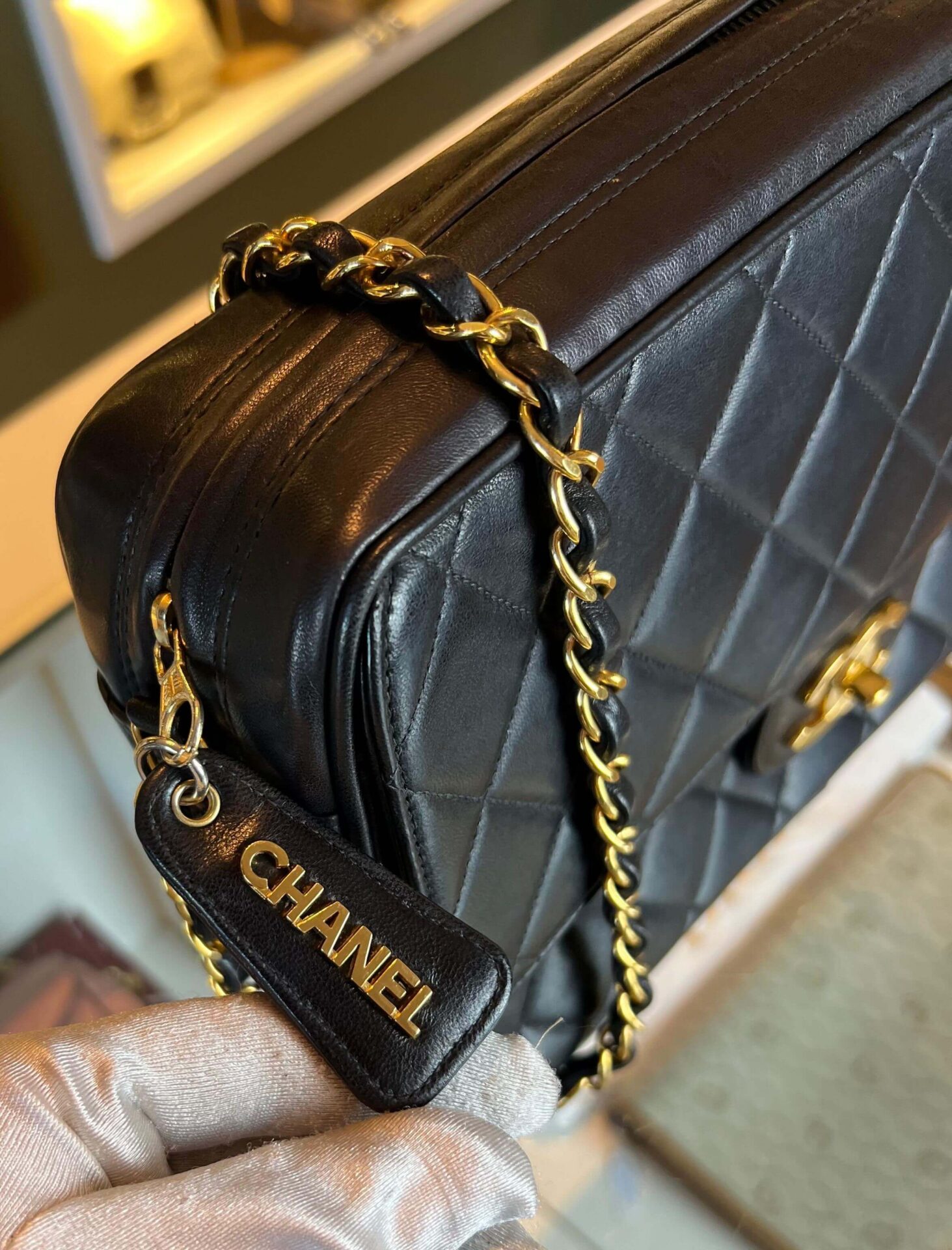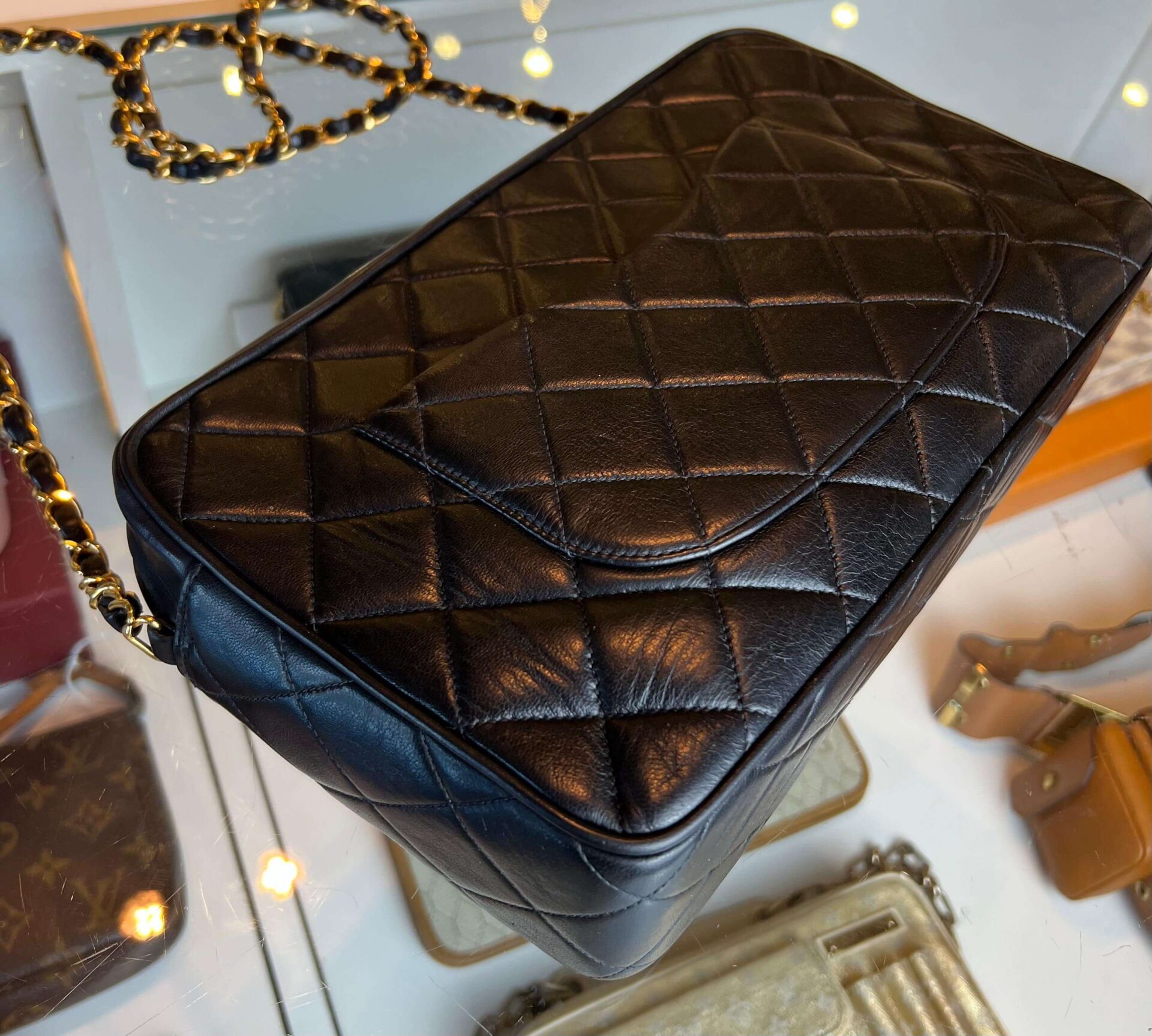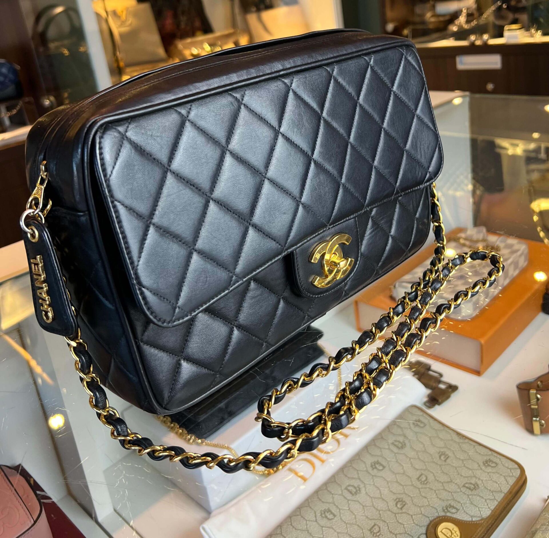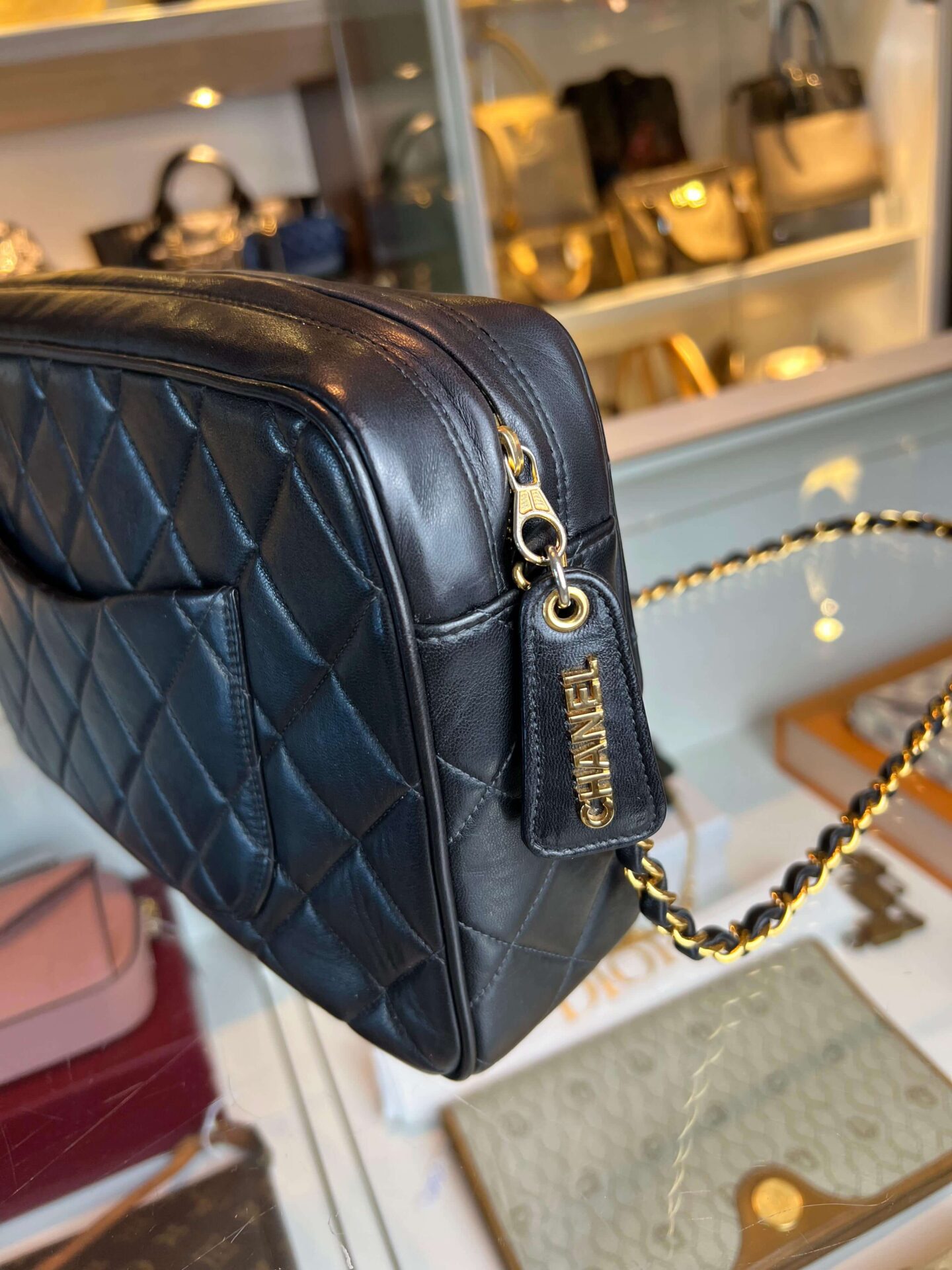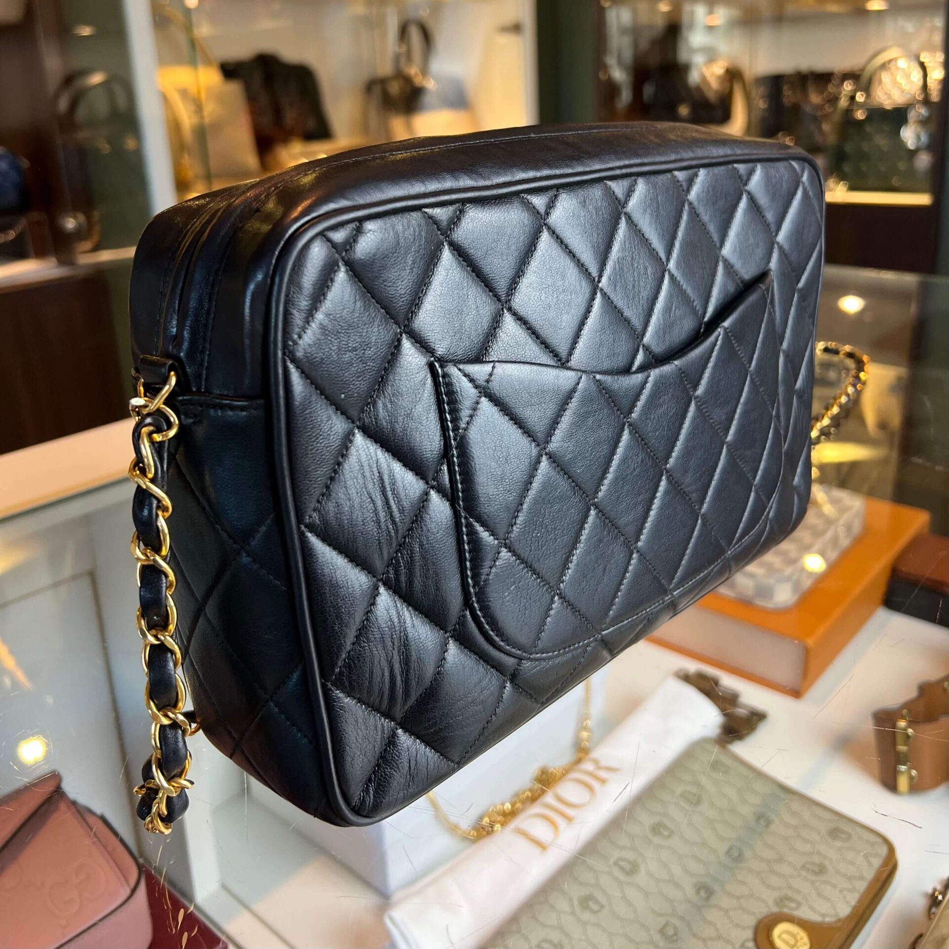 Chanel CC Camera Flap Bag in zwart lamsleder en 24k verguld gouden hardware. Het is een crossbody tas in de maat large, ze heeft een voorvak welk geopend kan worden met de CC lock, en 1 hoofd compartiment achter de rits. Ze komt met authenticiteit kaart (3 serie) en Entrupy certificaat!