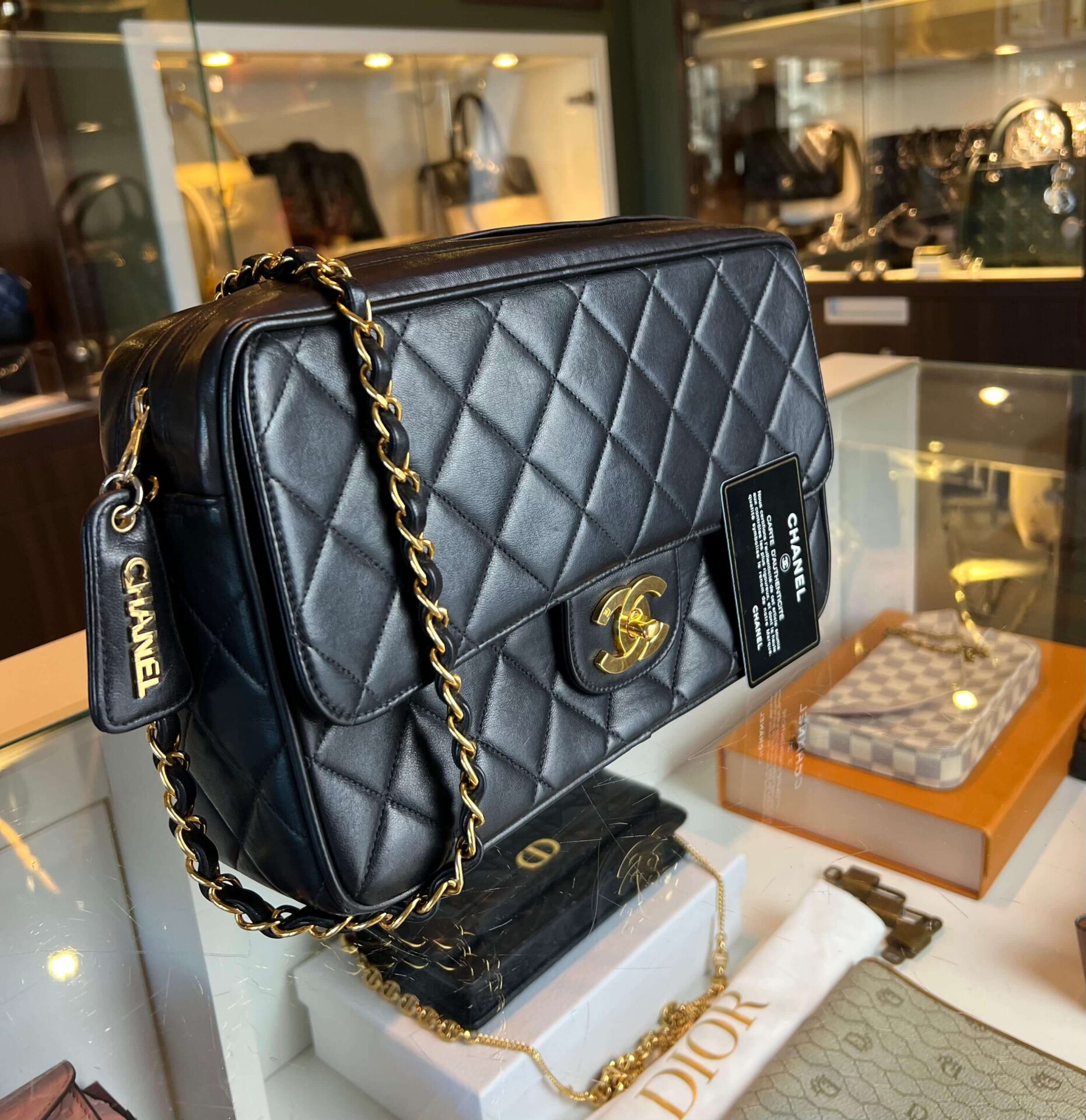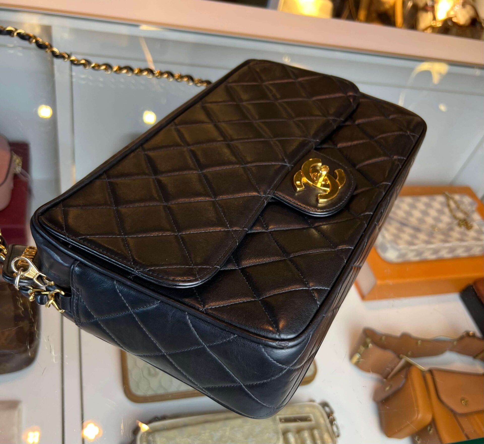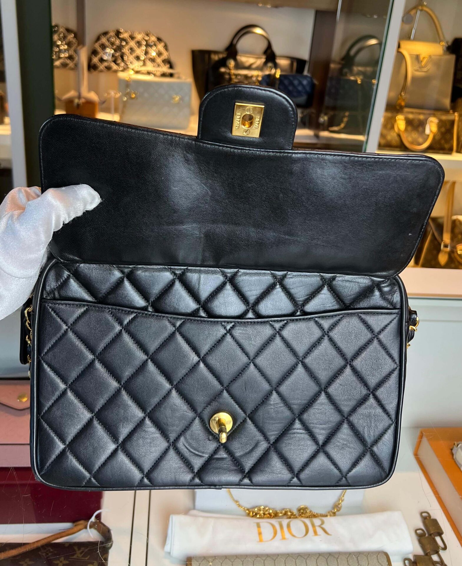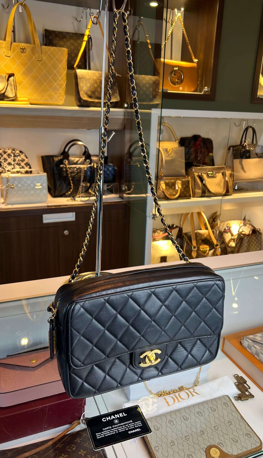 Chanel CC Camera Flap Bag in zwart lamsleder en 24k verguld gouden hardware. Het is een crossbody tas in de maat large, ze heeft een voorvak welk geopend kan worden met de CC lock, en 1 hoofd compartiment achter de rits. Ze komt met authenticiteit kaart (3 serie) en Entrupy certificaat!