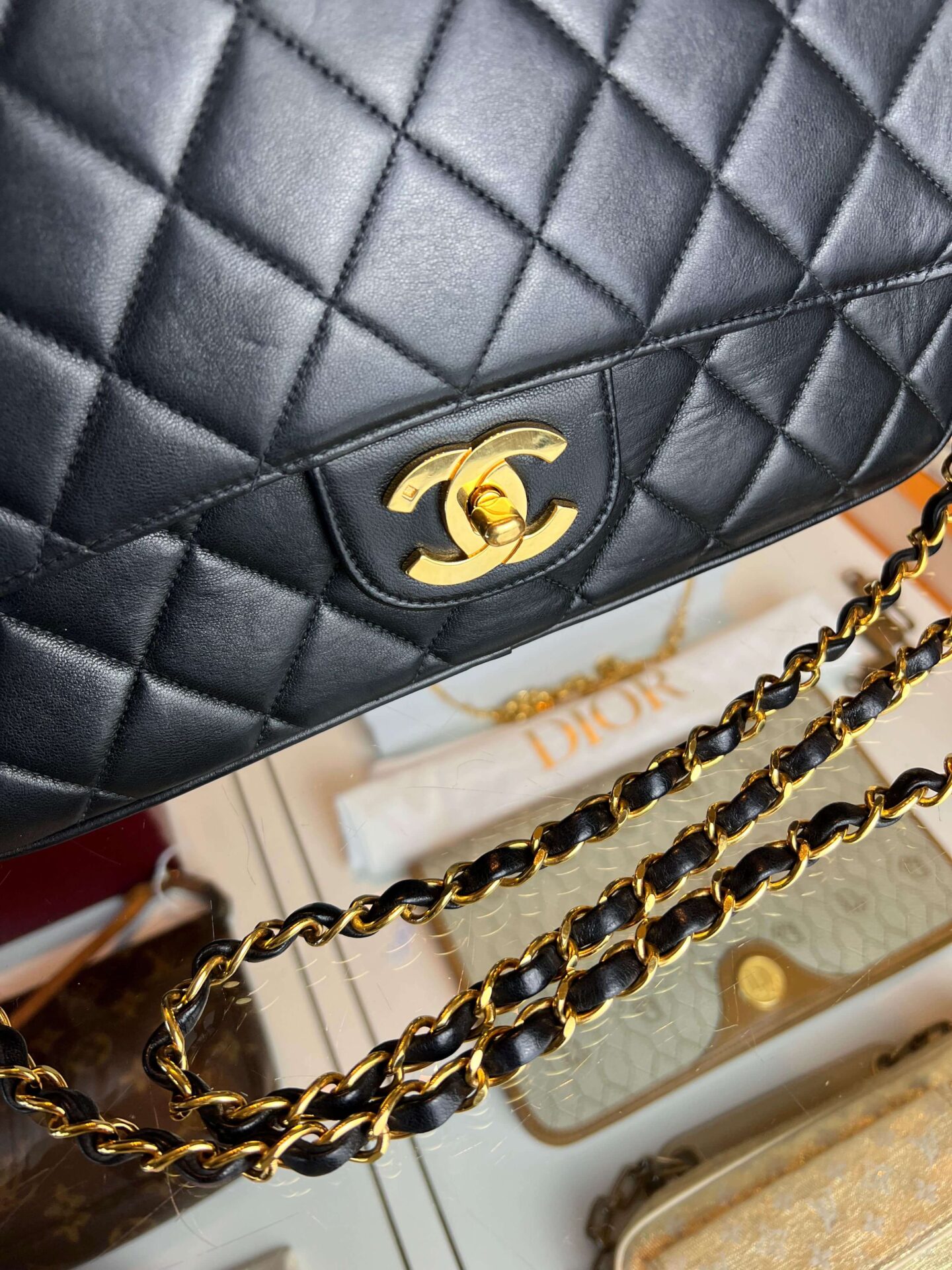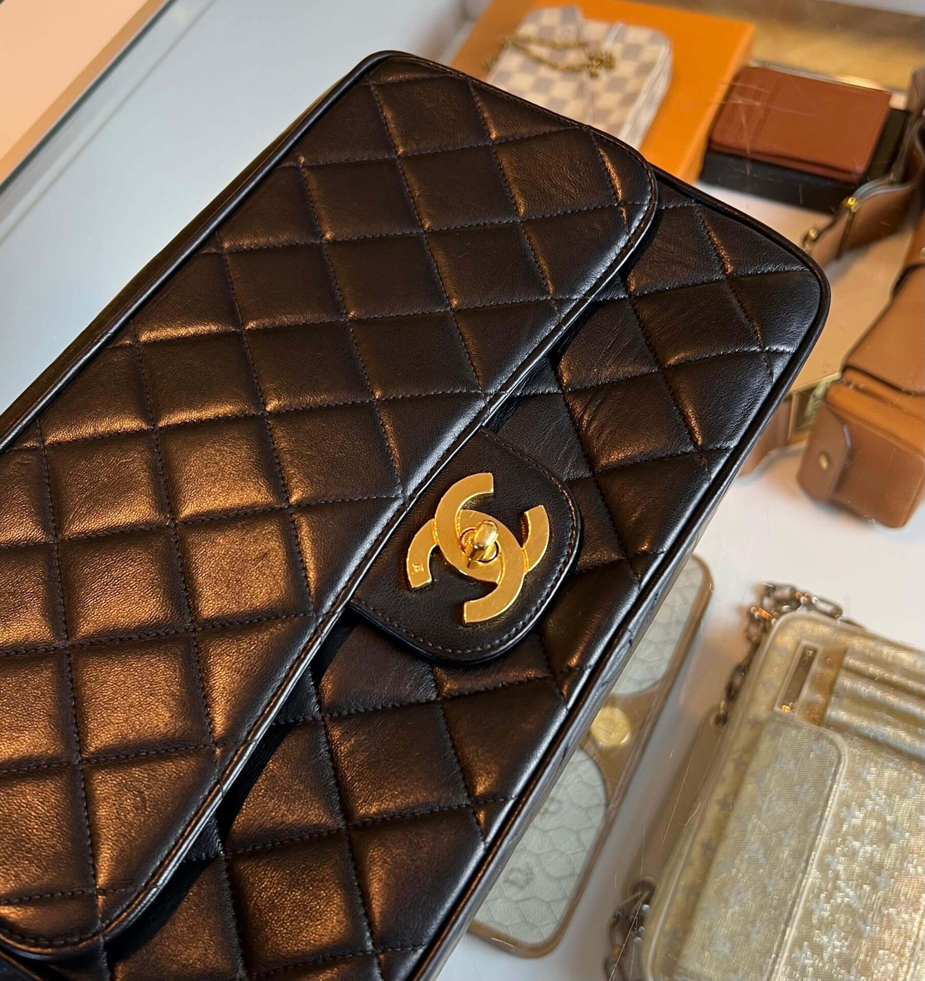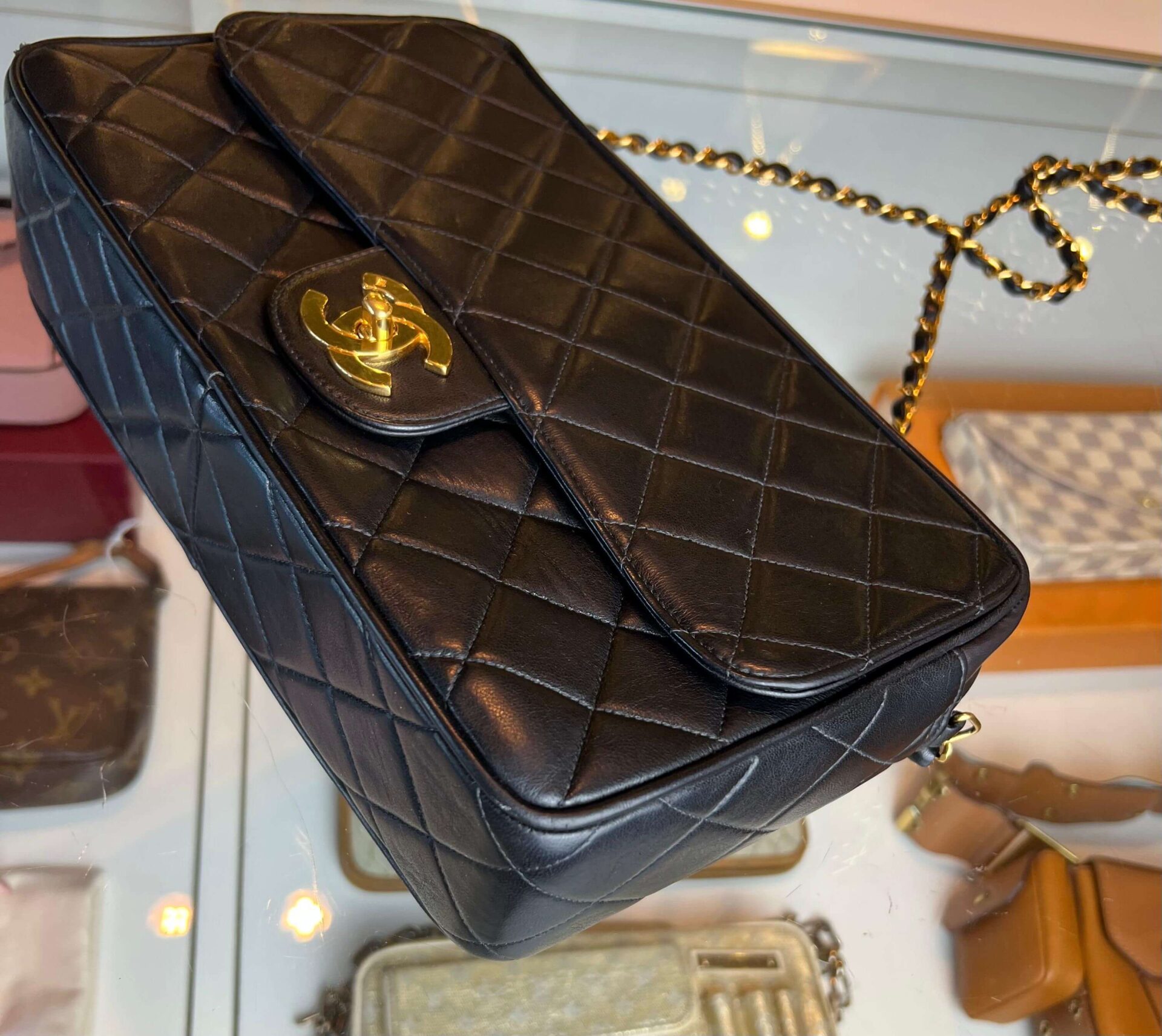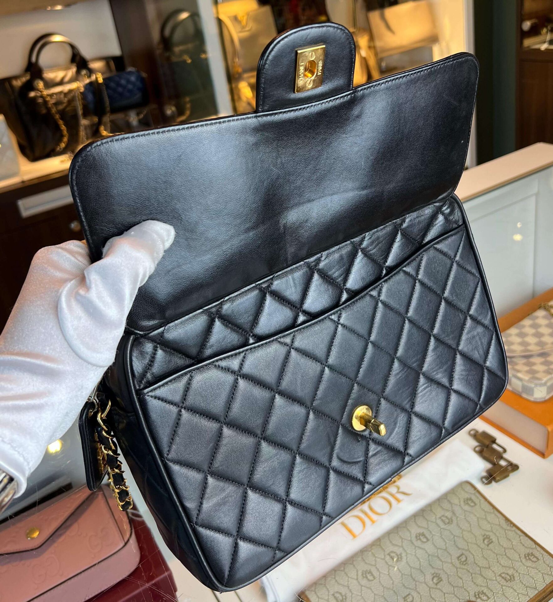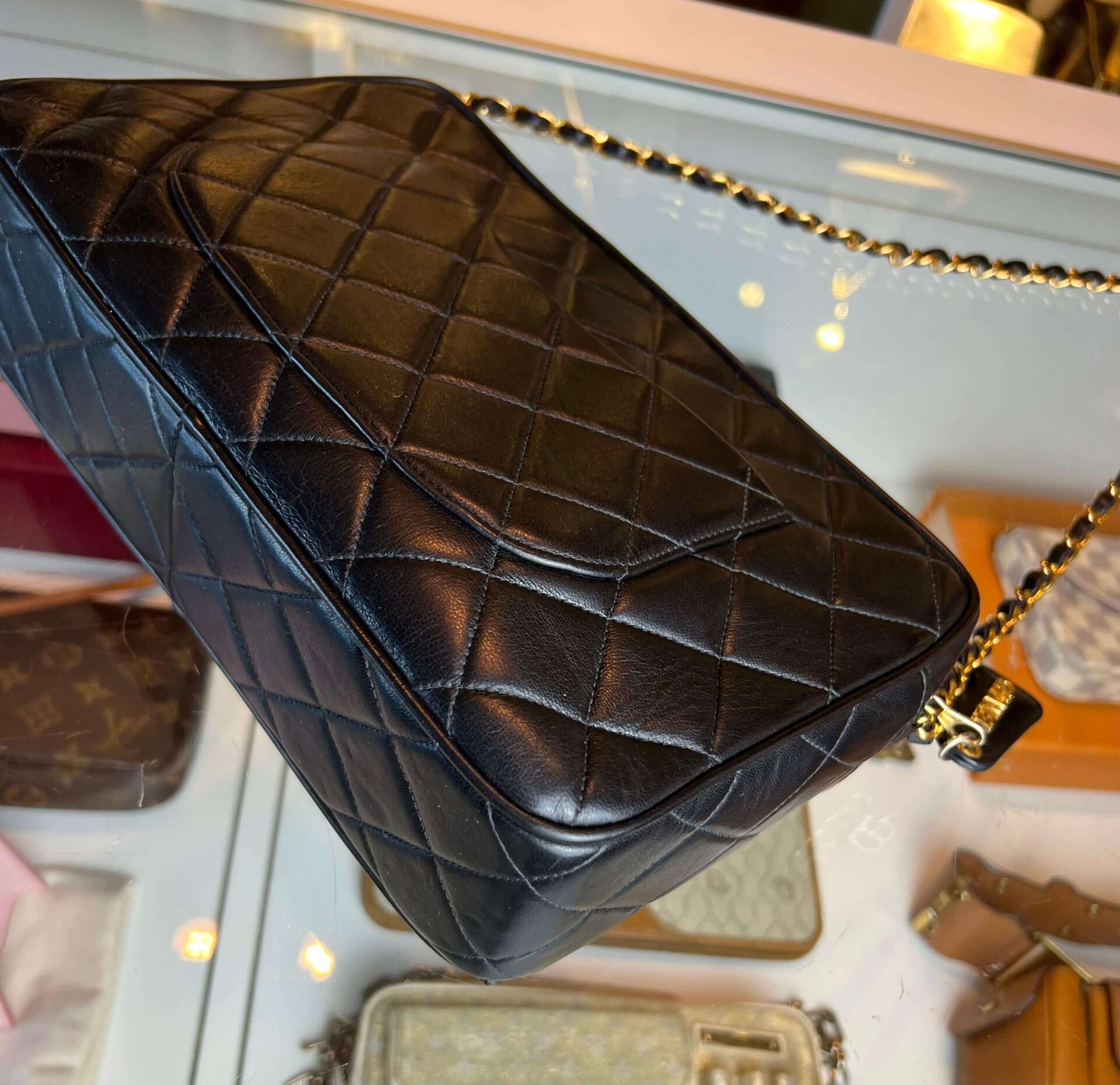 Chanel CC Camera Flap Bag in zwart lamsleder en 24k verguld gouden hardware. Het is een crossbody tas in de maat large, ze heeft een voorvak welk geopend kan worden met de CC lock, en 1 hoofd compartiment achter de rits. Ze komt met authenticiteit kaart (3 serie) en Entrupy certificaat!