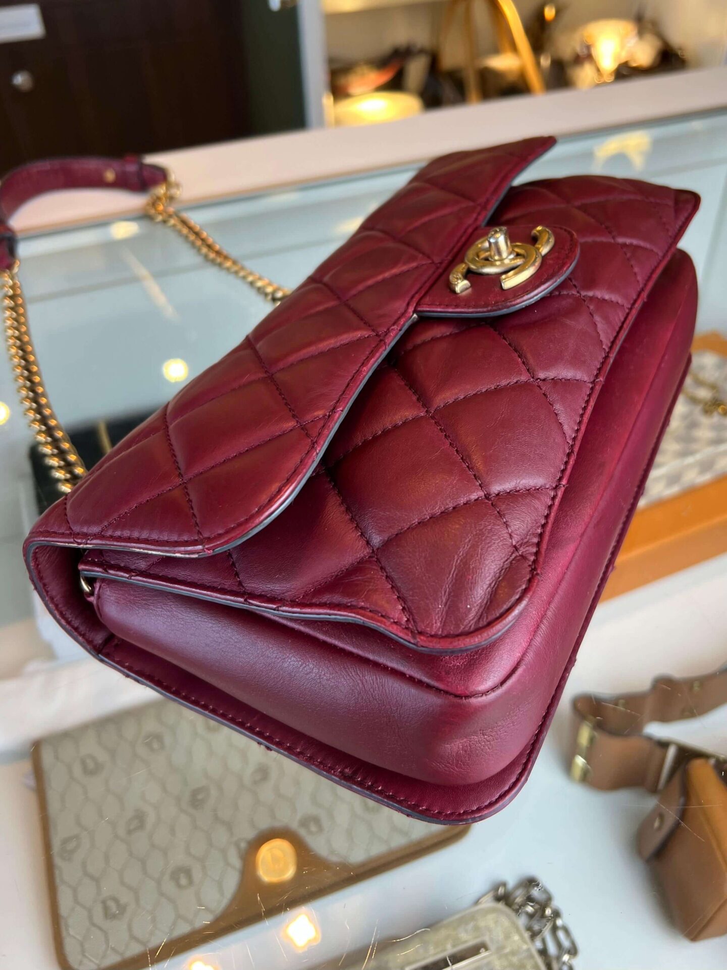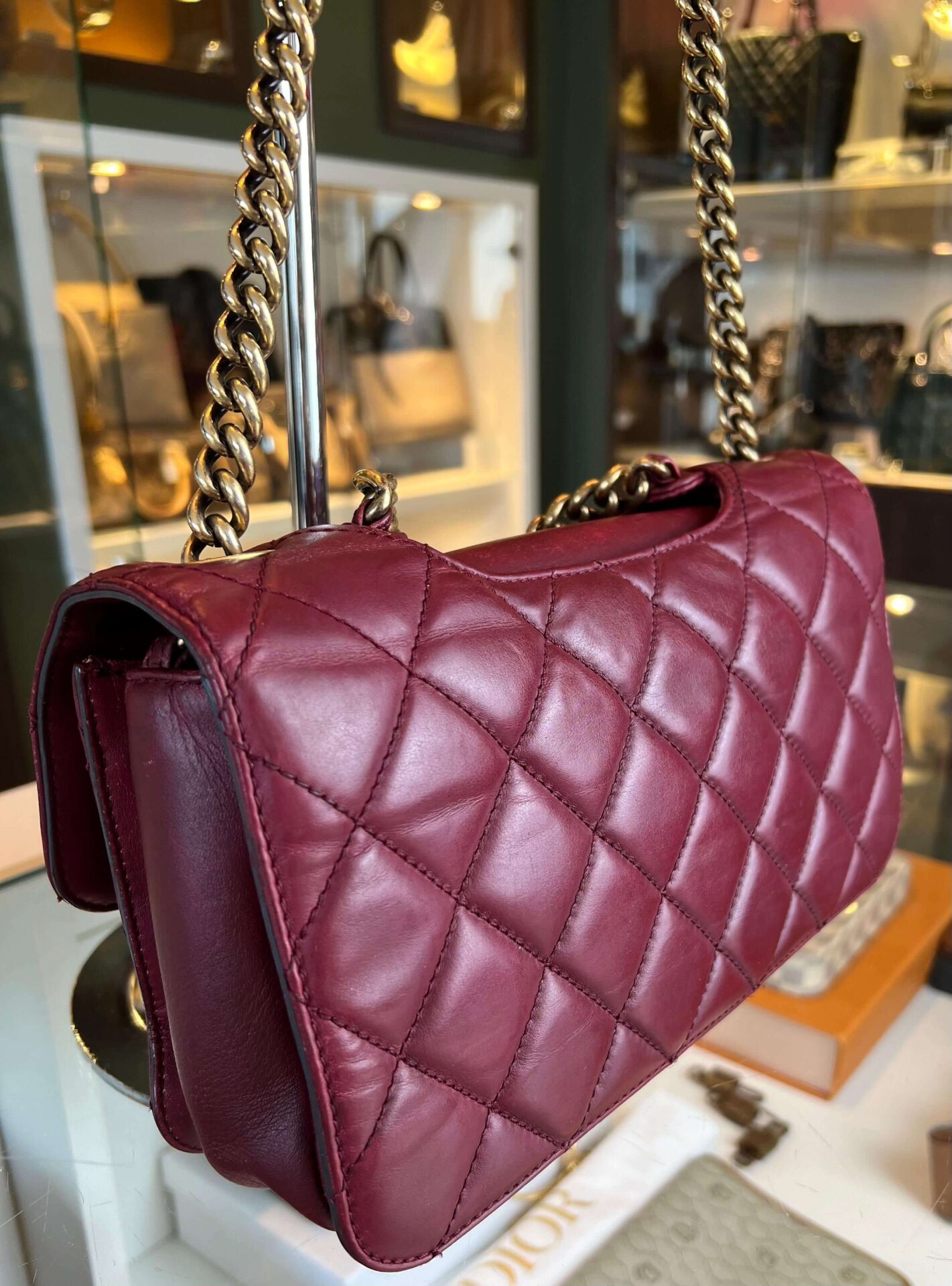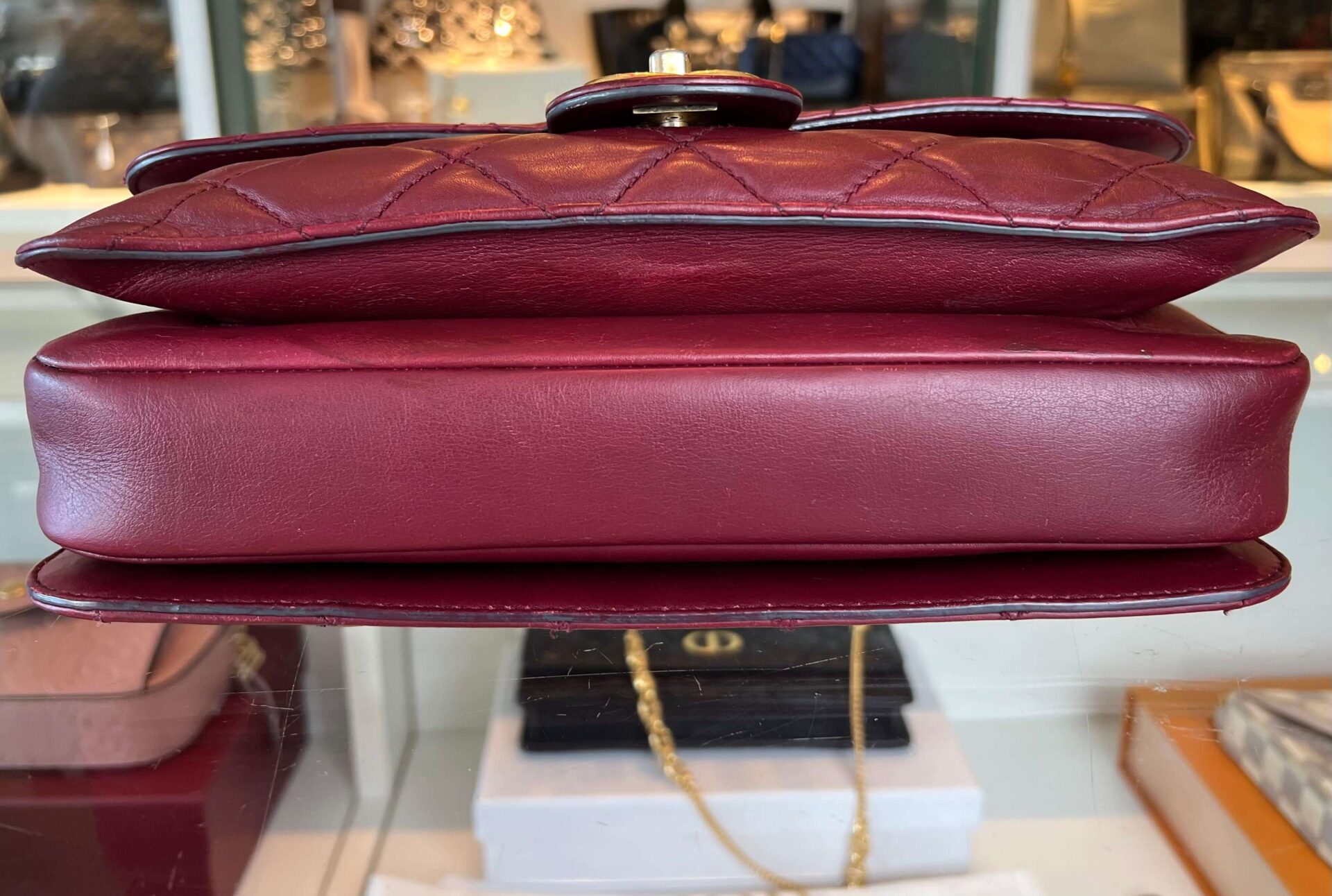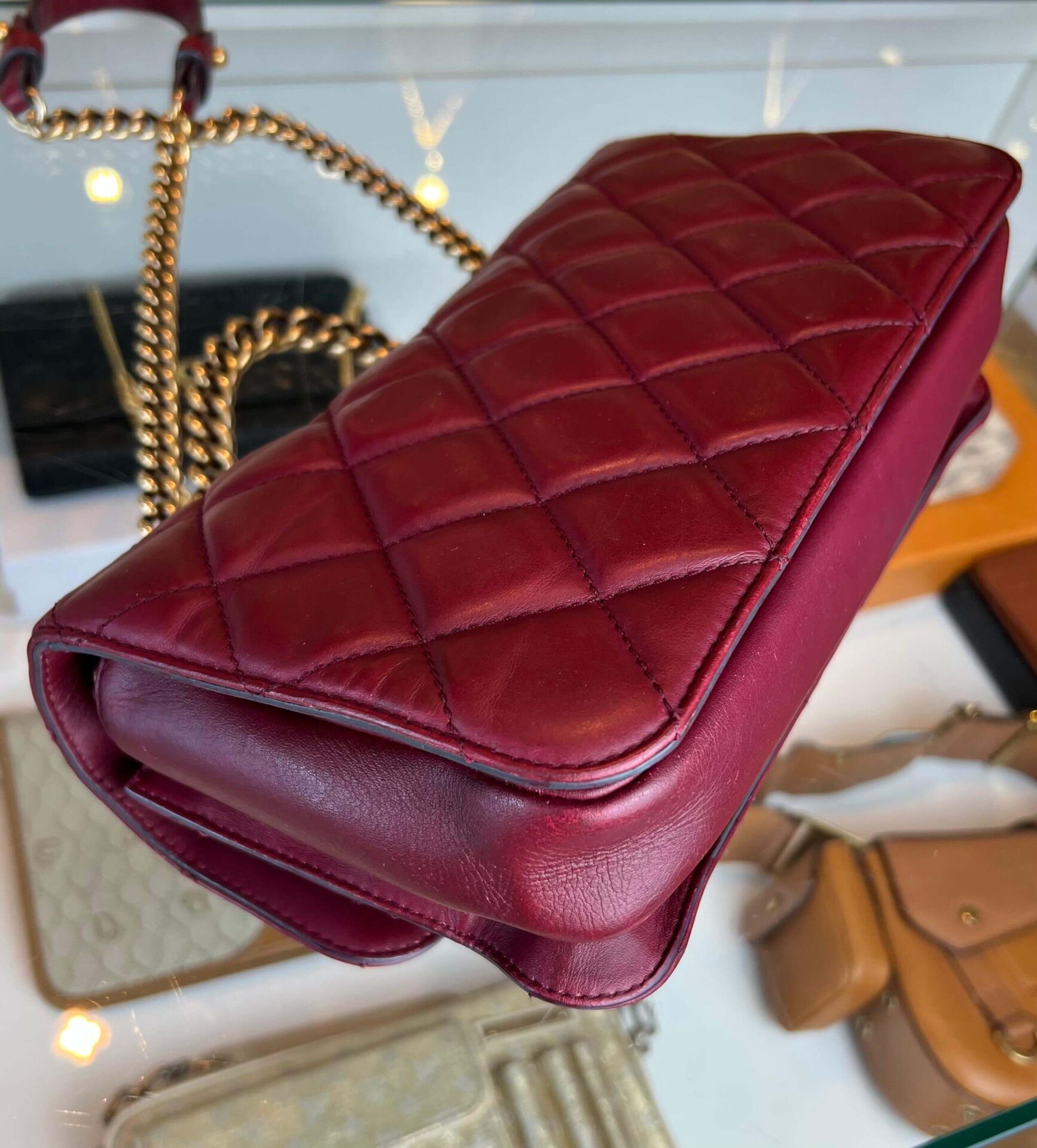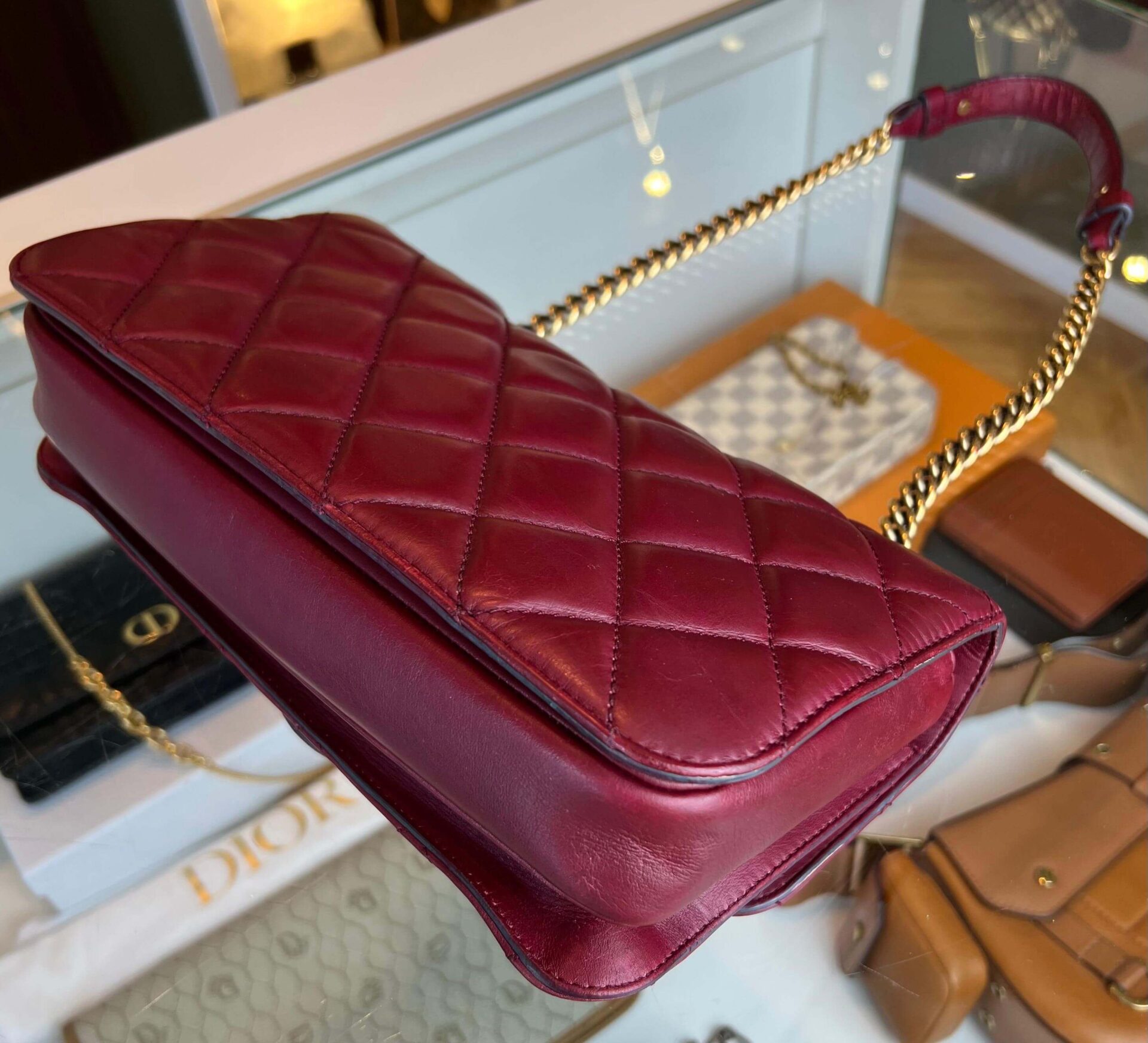 Chanel CC Flap Bag in het bordeaux rood met gouden hardware. Ze is een 17 serie, wat staat voor jaartal 2012/2013. Het betreft een Flap Bag met 2 vakken. Serienummer is aanwezig, authenticiteit kaart & Entrupy certificaat. Ze is een schouder én handtas. Haar staat is goed, enkele gebruikerssporen op het leder.