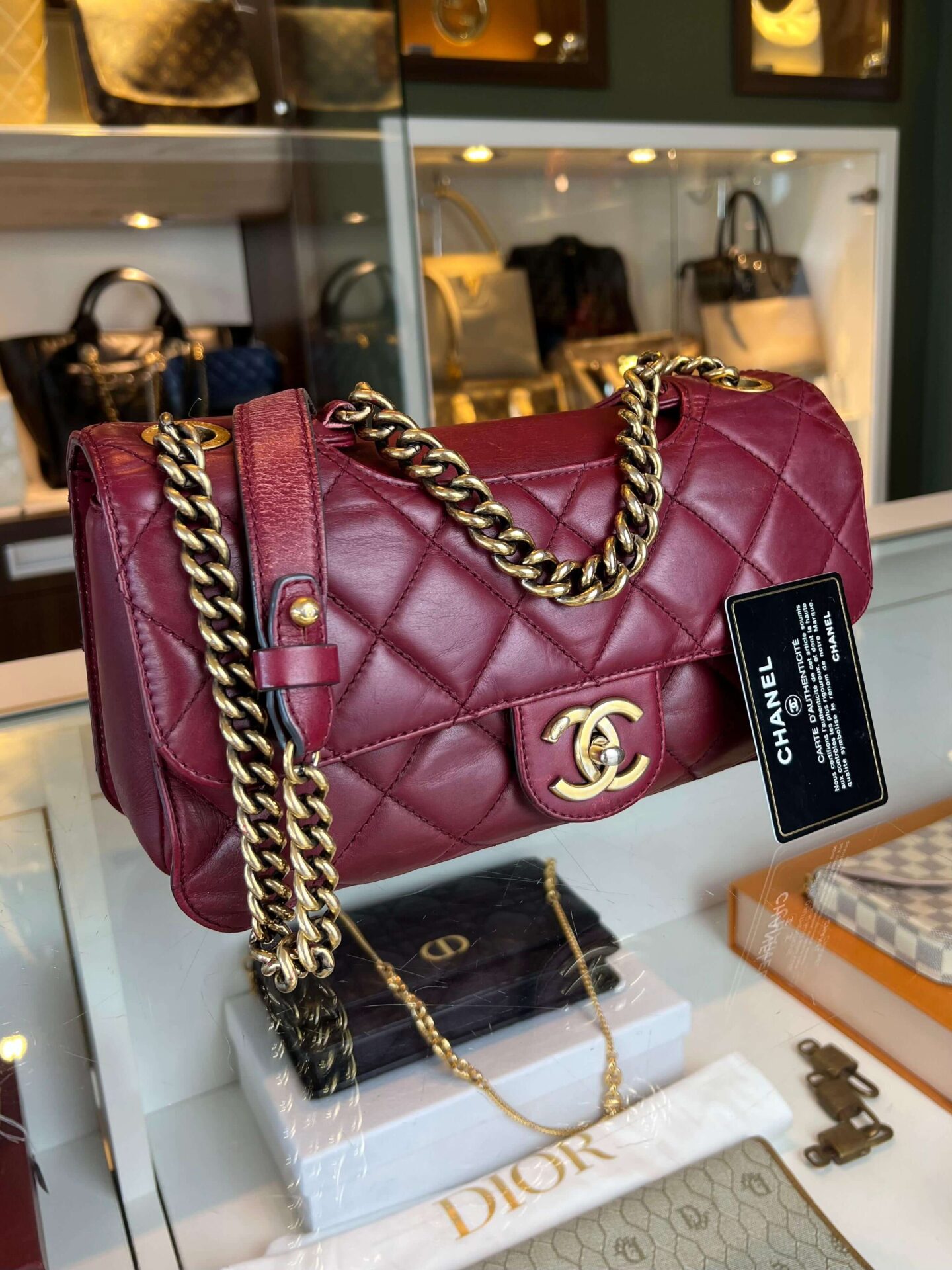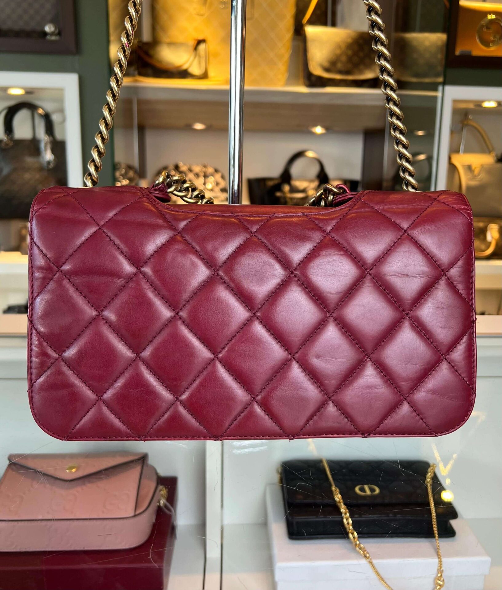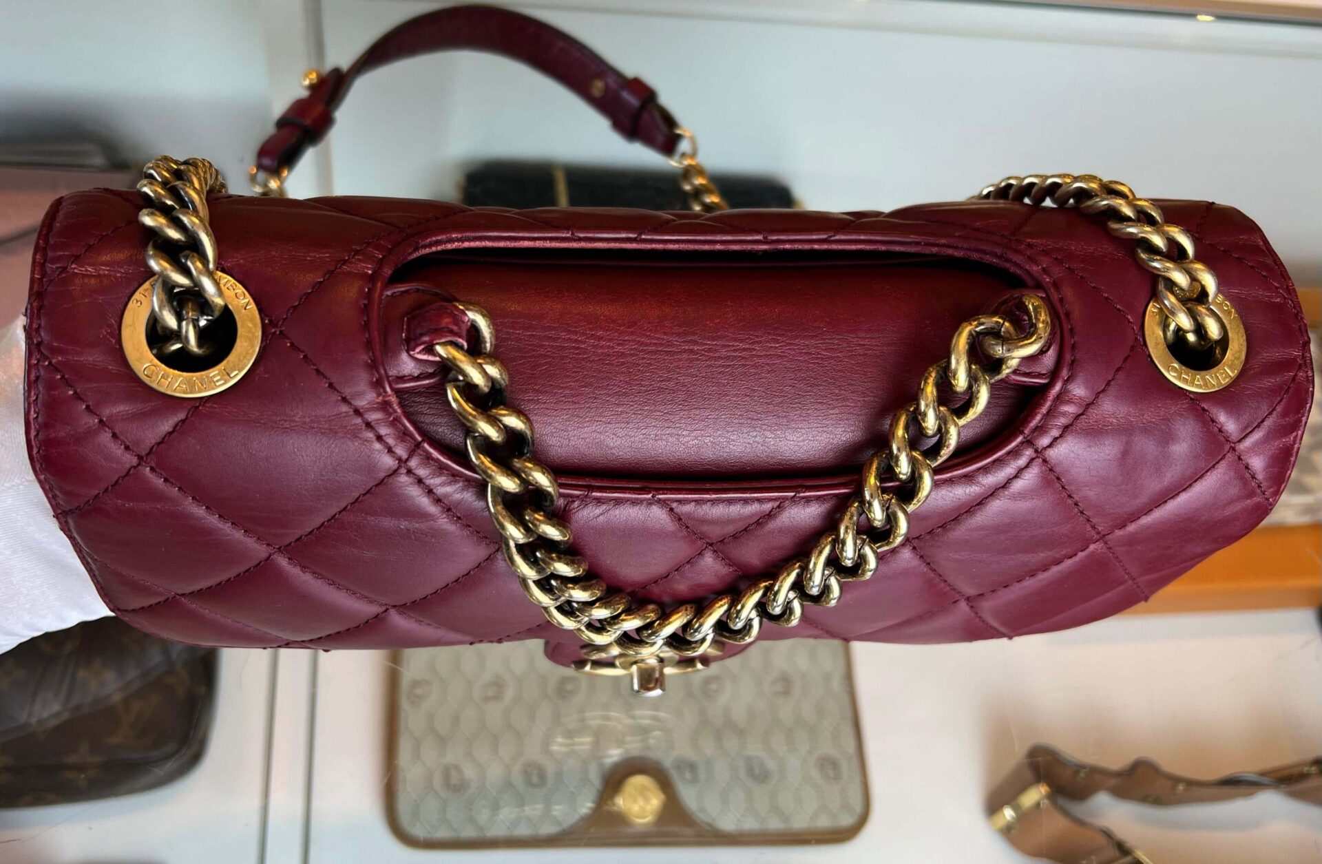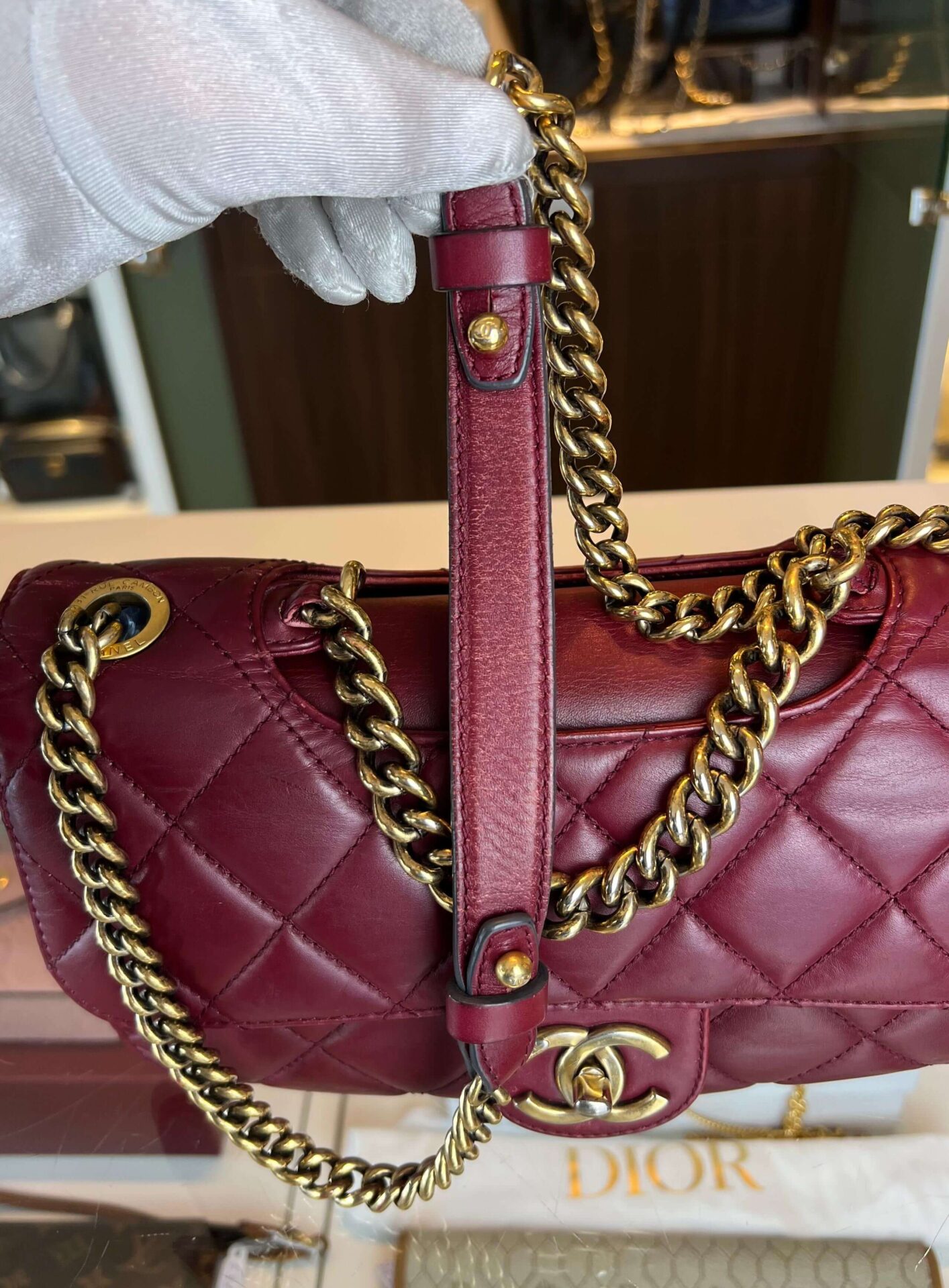 Chanel CC Flap Bag in het bordeaux rood met gouden hardware. Ze is een 17 serie, wat staat voor jaartal 2012/2013. Het betreft een Flap Bag met 2 vakken. Serienummer is aanwezig, authenticiteit kaart & Entrupy certificaat. Ze is een schouder én handtas. Haar staat is goed, enkele gebruikerssporen op het leder.