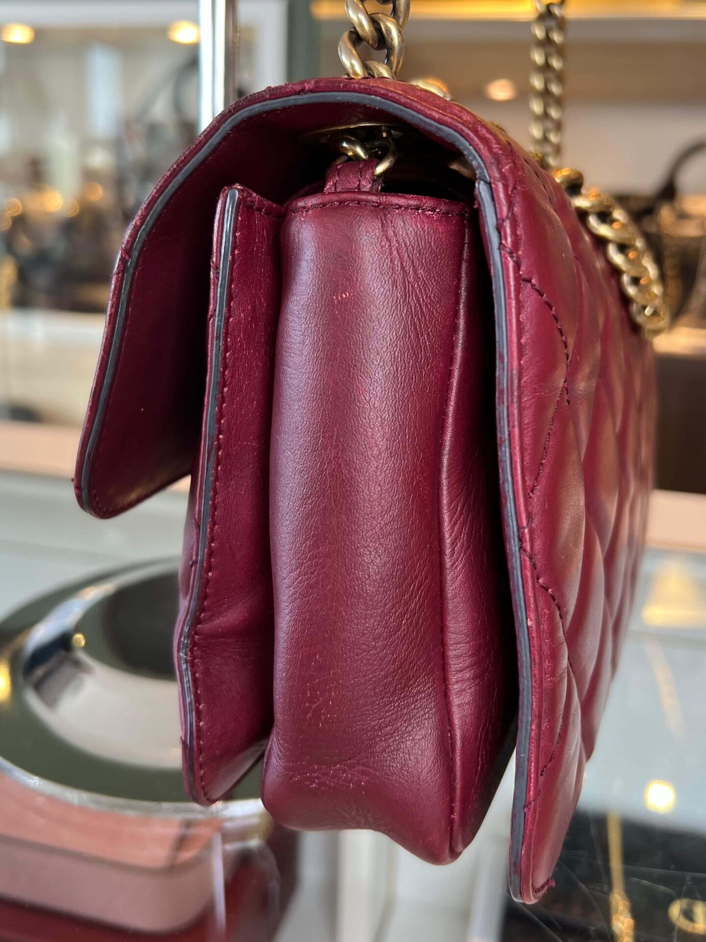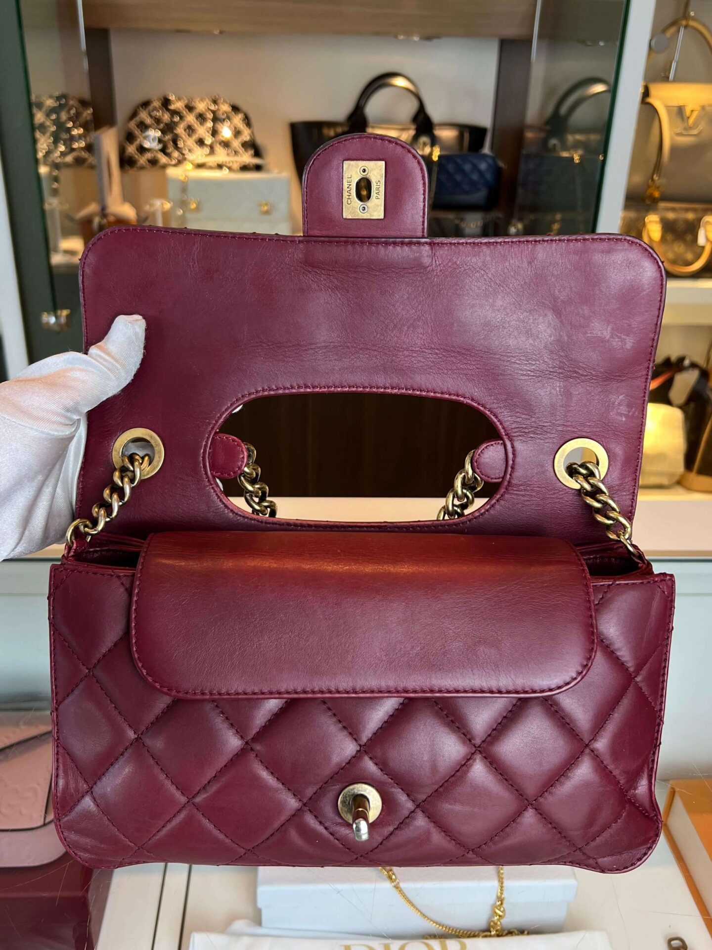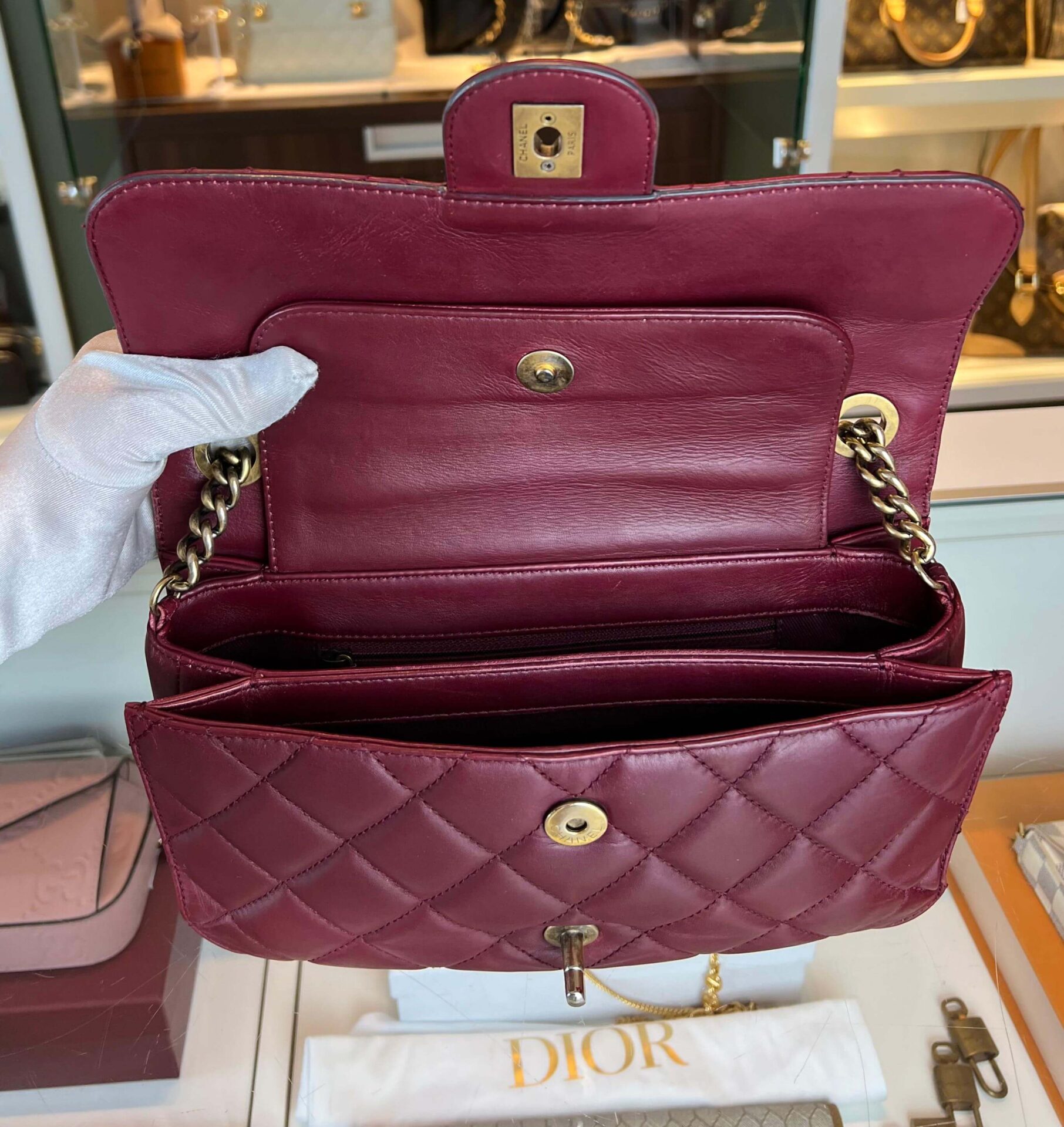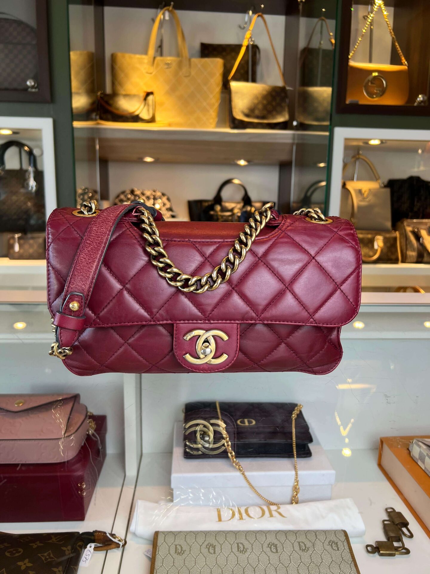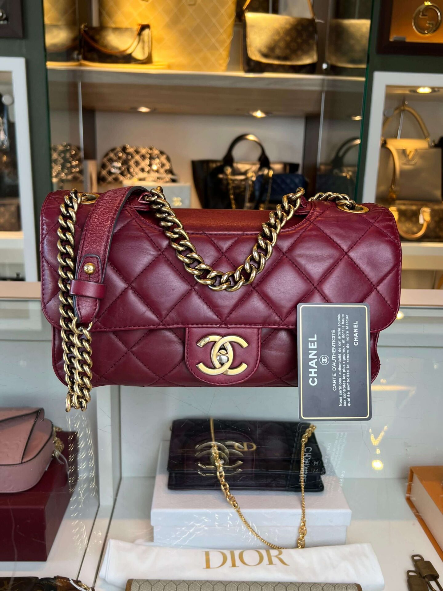 Chanel CC Flap Bag in het bordeaux rood met gouden hardware. Ze is een 17 serie, wat staat voor jaartal 2012/2013. Het betreft een Flap Bag met 2 vakken. Serienummer is aanwezig, authenticiteit kaart & Entrupy certificaat. Ze is een schouder én handtas. Haar staat is goed, enkele gebruikerssporen op het leder.