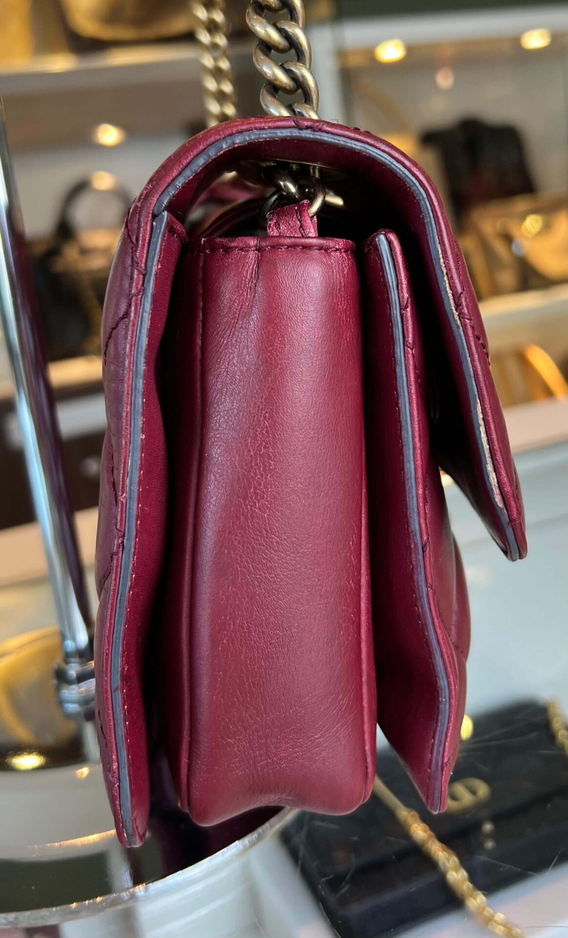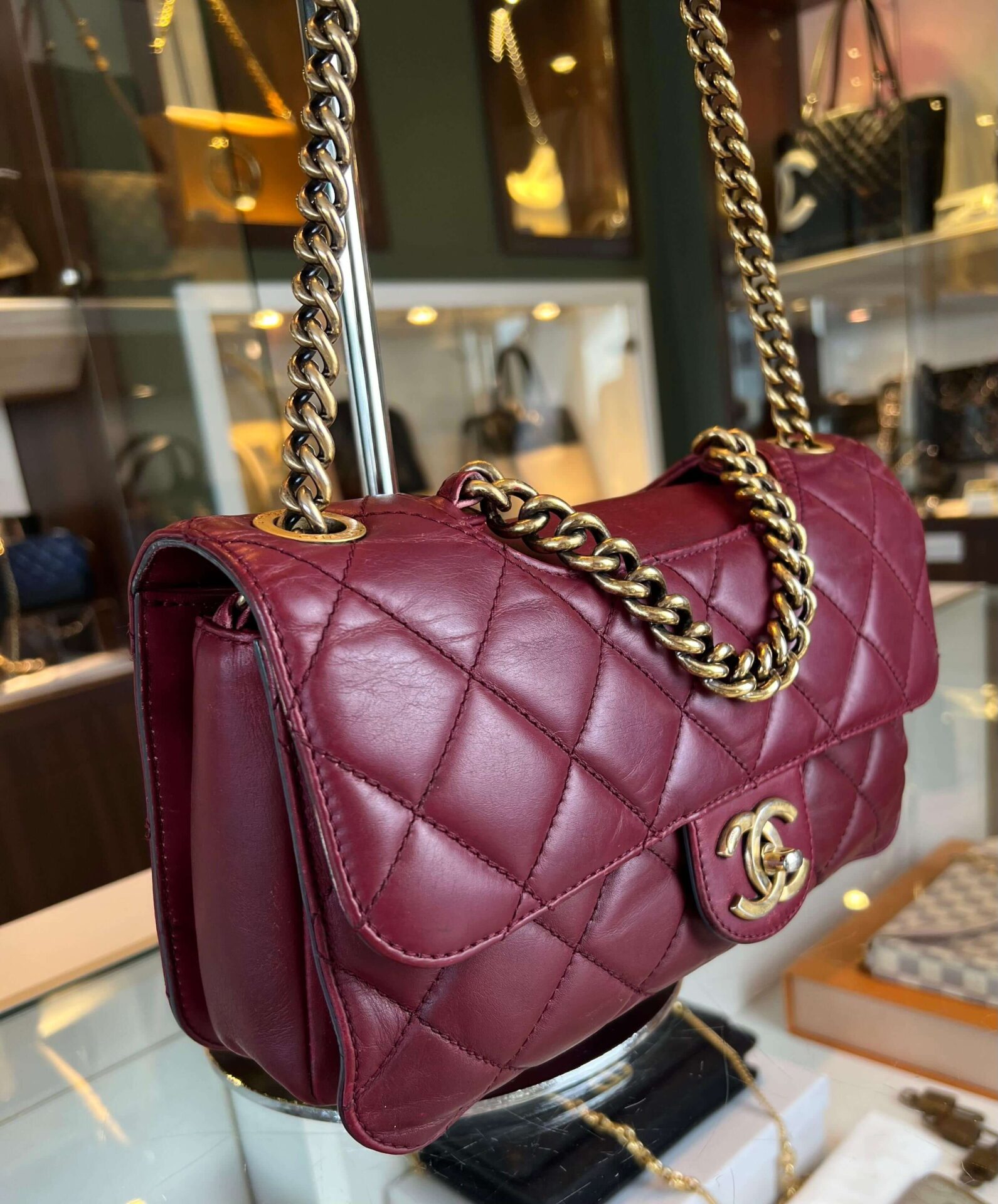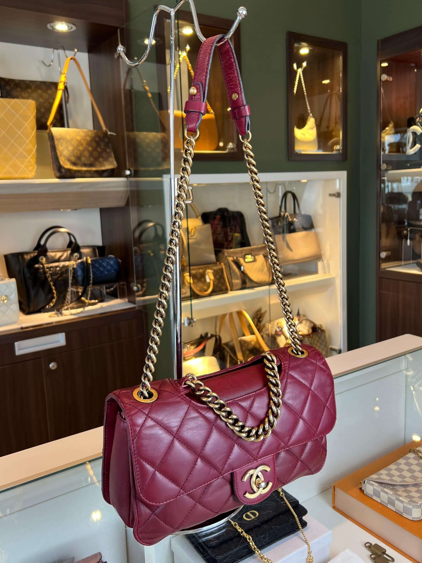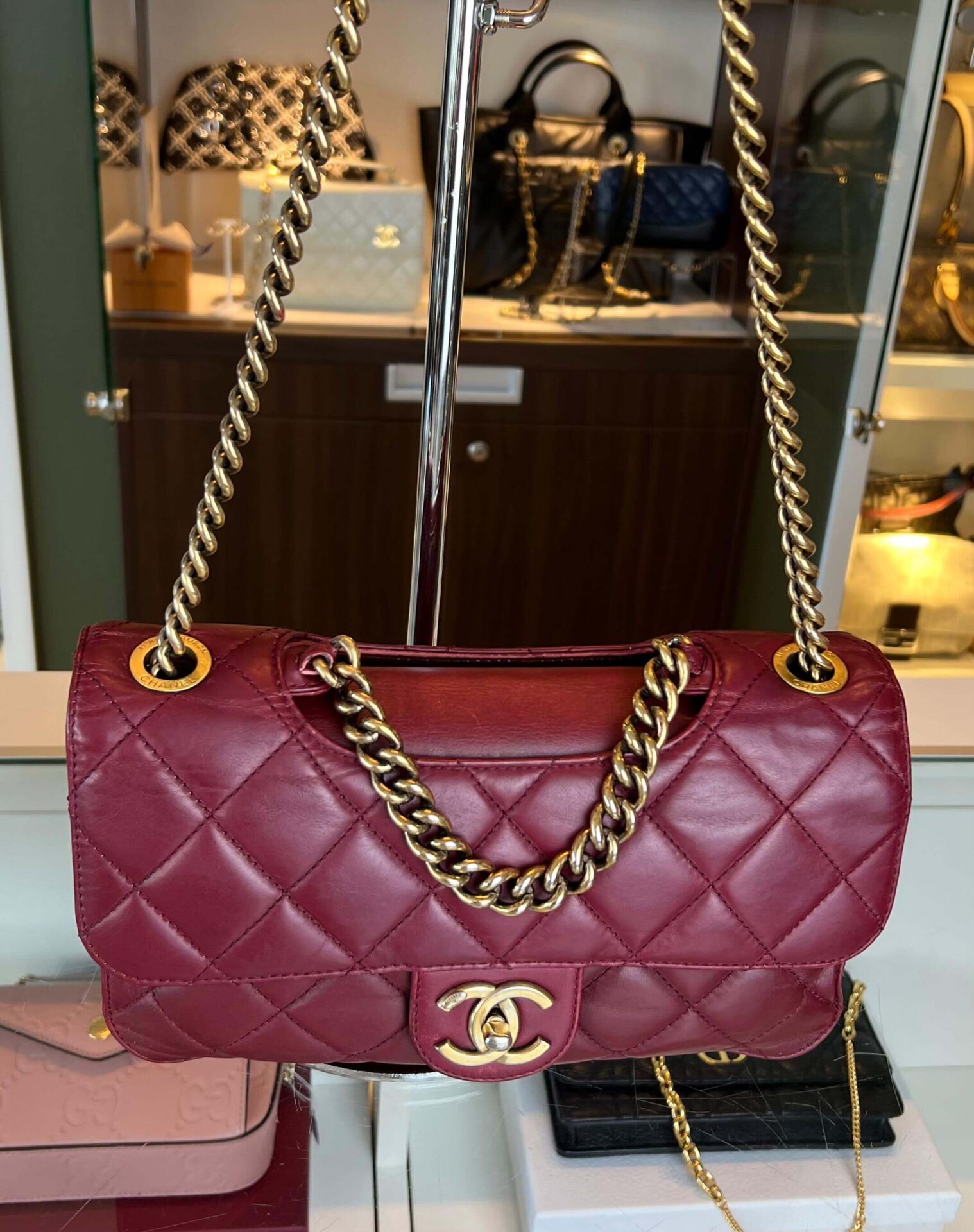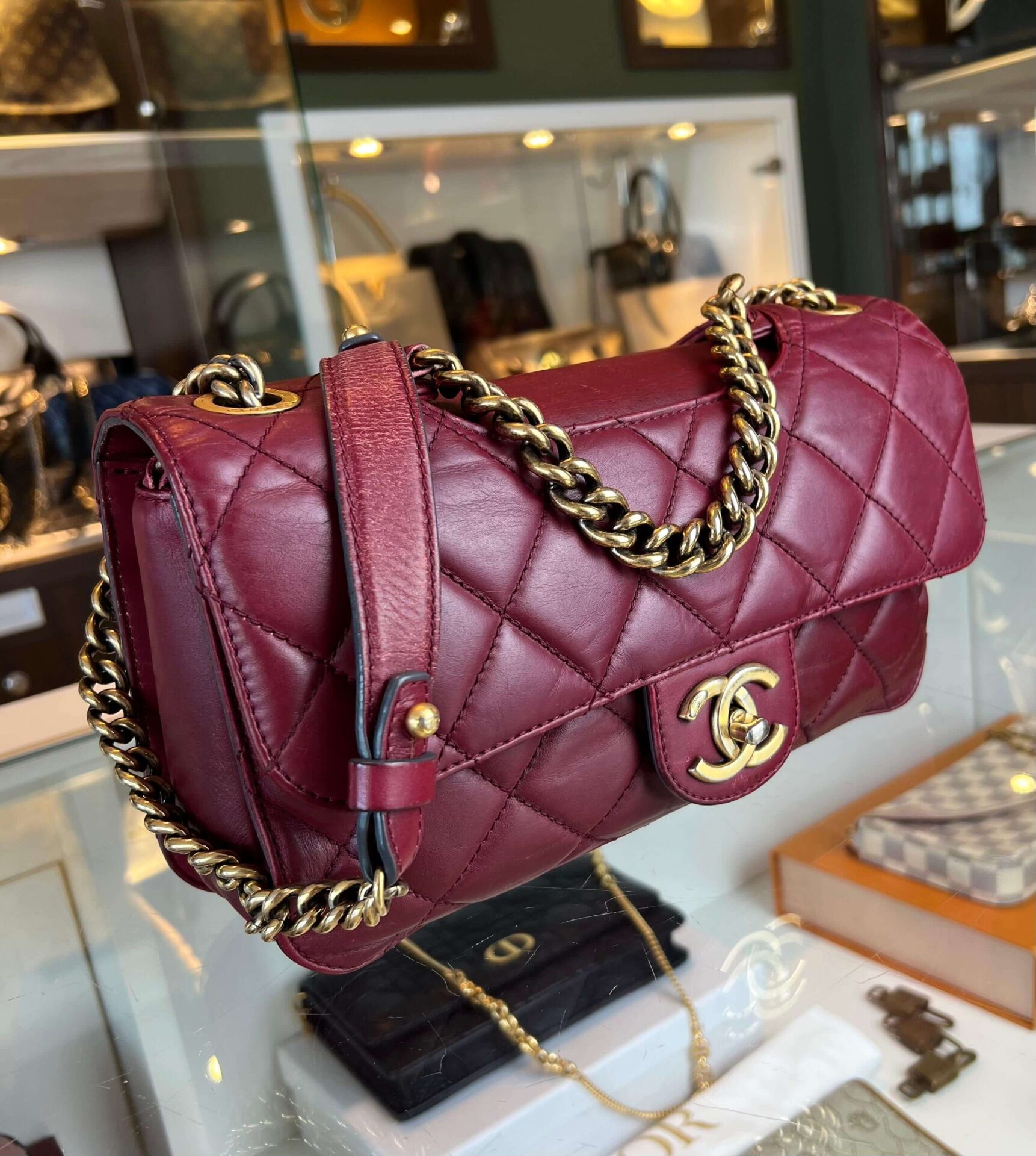Chanel CC Flap Bag in het bordeaux rood met gouden hardware. Ze is een 17 serie, wat staat voor jaartal 2012/2013. Het betreft een Flap Bag met 2 vakken. Serienummer is aanwezig, authenticiteit kaart & Entrupy certificaat. Ze is een schouder én handtas. Haar staat is goed, enkele gebruikerssporen op het leder.