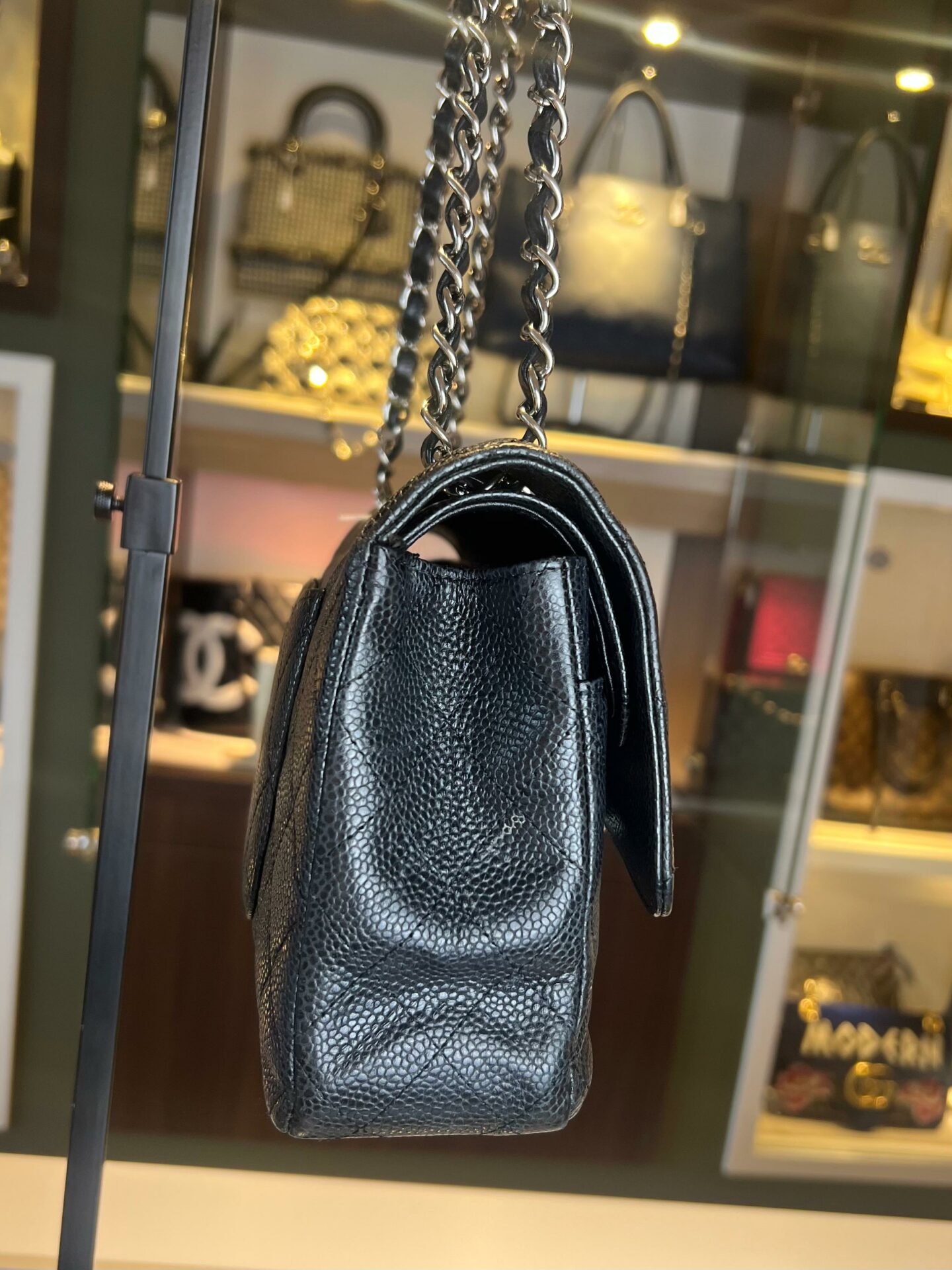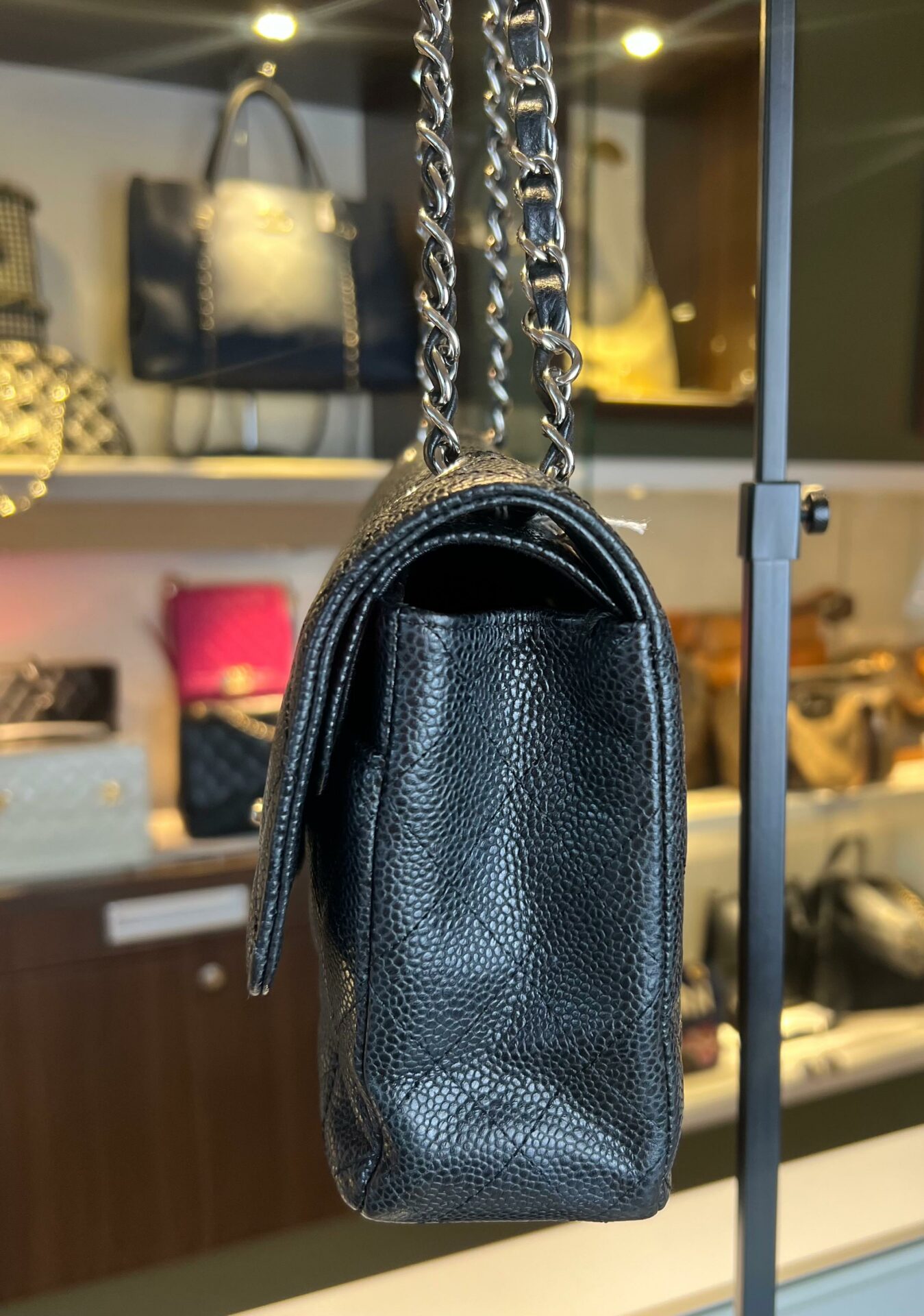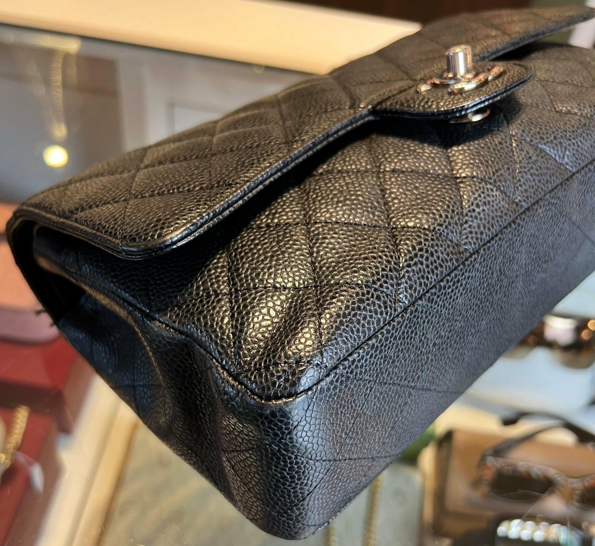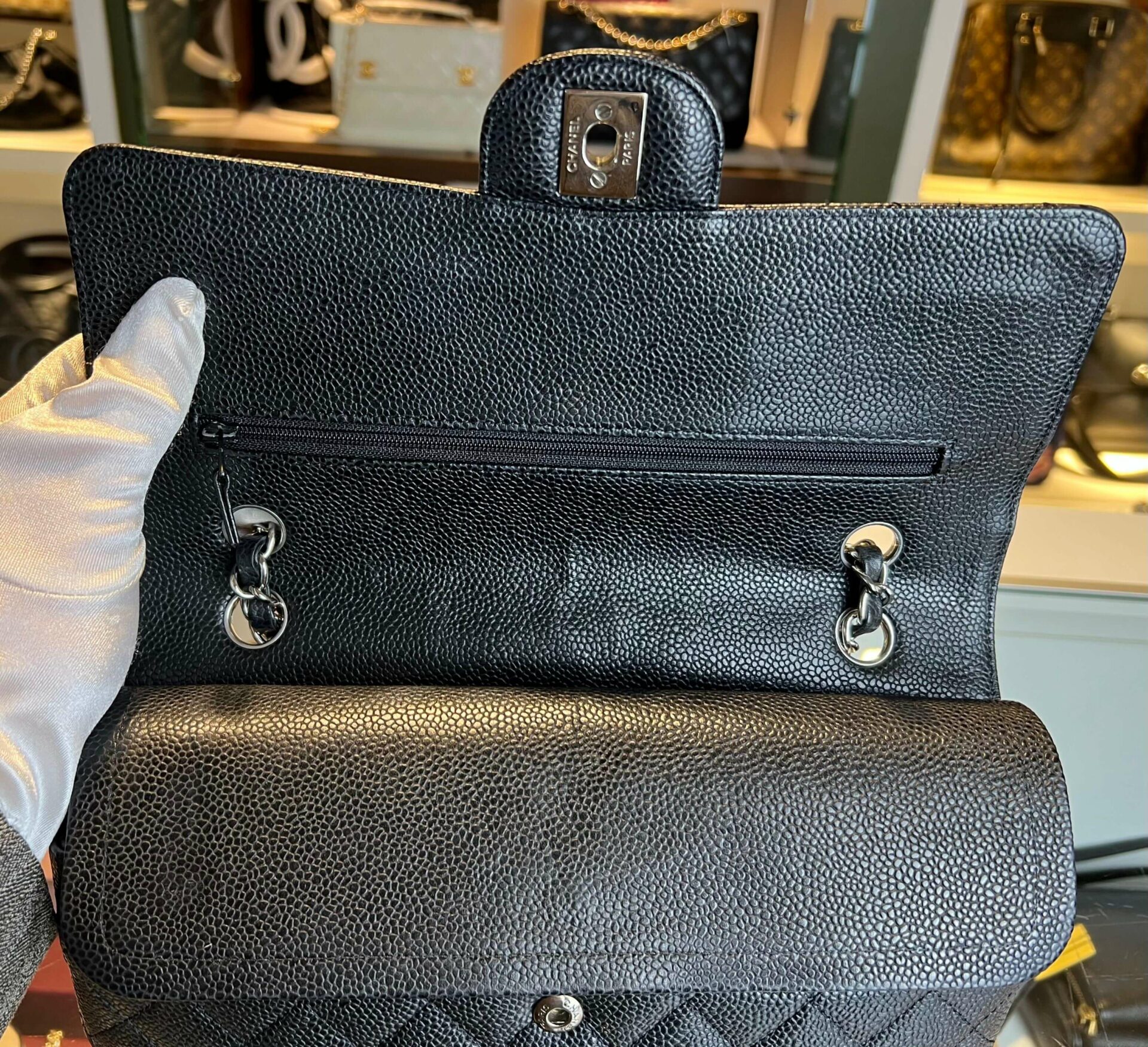 Chanel Classic Double Flap Bag Medium, in zwart kaviaarleder met zilveren hardware een zwart lederen interieur. Ze is een 13 serie wat betekent dat ze uit het jaartal 2009/2010 komt. Ze komt met de authenticiteit kaart en Entrupy certificaat. Het serienummer is aanwezig en leesbaar. Ze is in een zeer goede staat. Dit model tas is nog met de ‘old caviar’ leder. Dit betekent dat de tas nog het dikke, stevige kaviaar leder heeft met een matte korrel. De Chanel past crossbody, maar is ook prachtig als schoudertas.