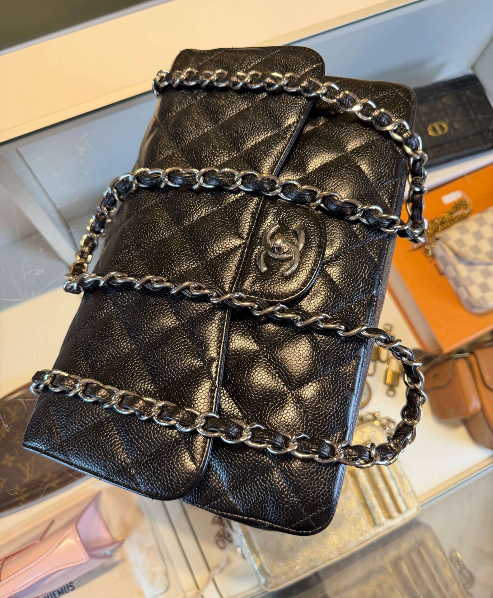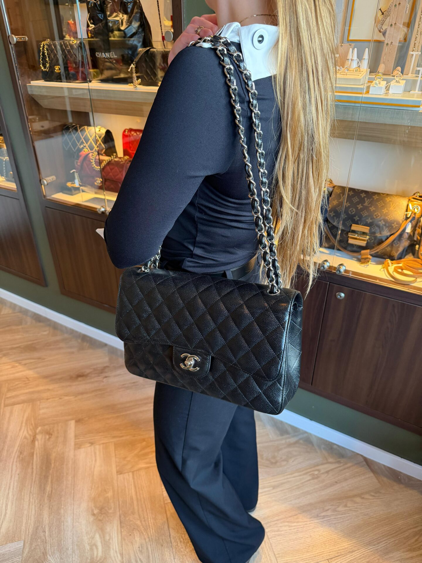 Chanel Classic Jumbo Double Flap Bag (Caviar) in het zwart met kaviaarleder en zilveren hardware. Ze betreft een volledig set uit 2010-2011, een 29 serie en is in een zeer goede staat. Ze heeft geen beschadigingen. Een leuk feitje: Dit jaartal was de overgangsperiode waarin Chanel de “Single Flap” verving door de “Double Flap” voor het Jumbo formaat. De Double Flap is zwaarder maar behoudt zijn vorm beter.