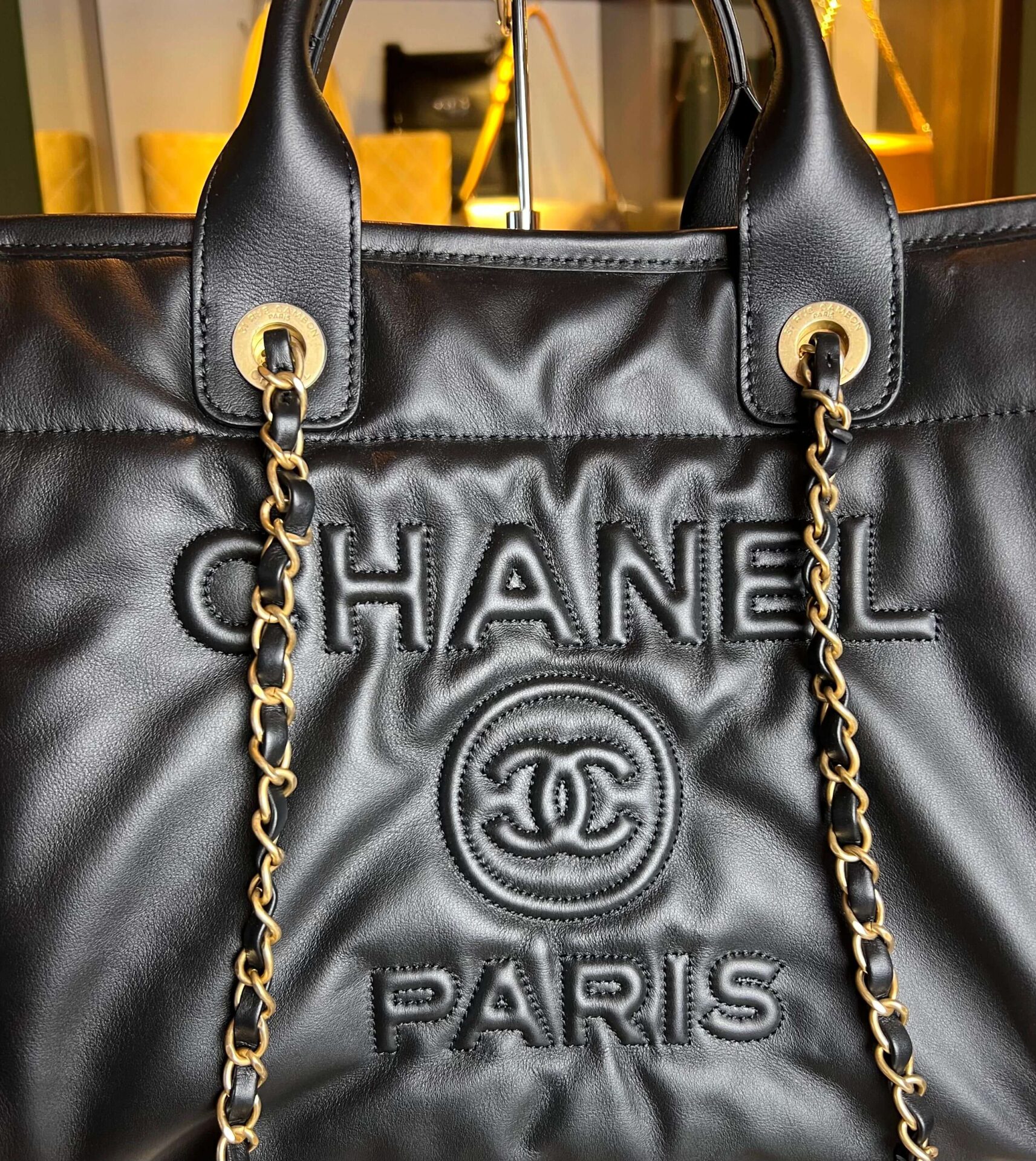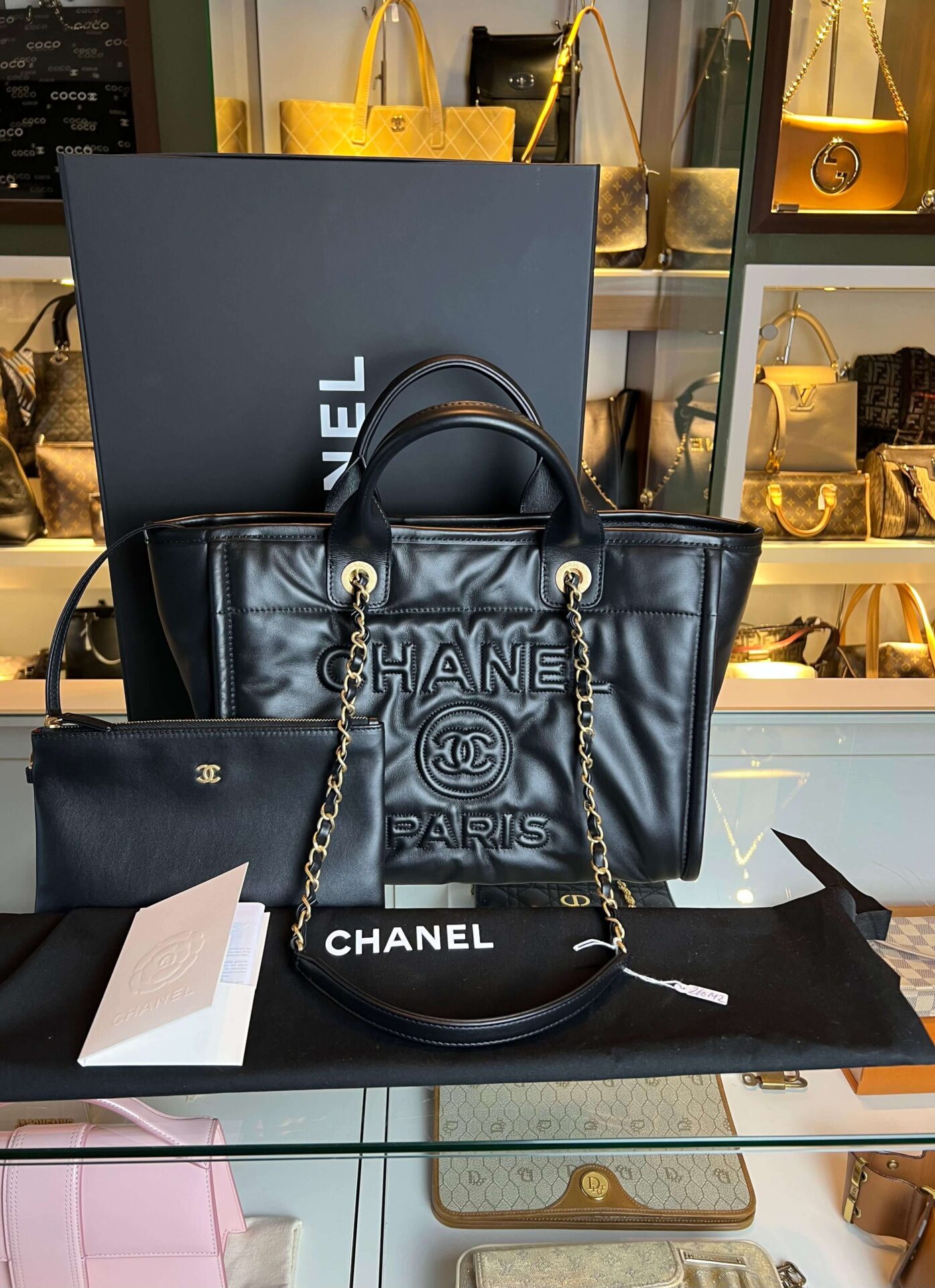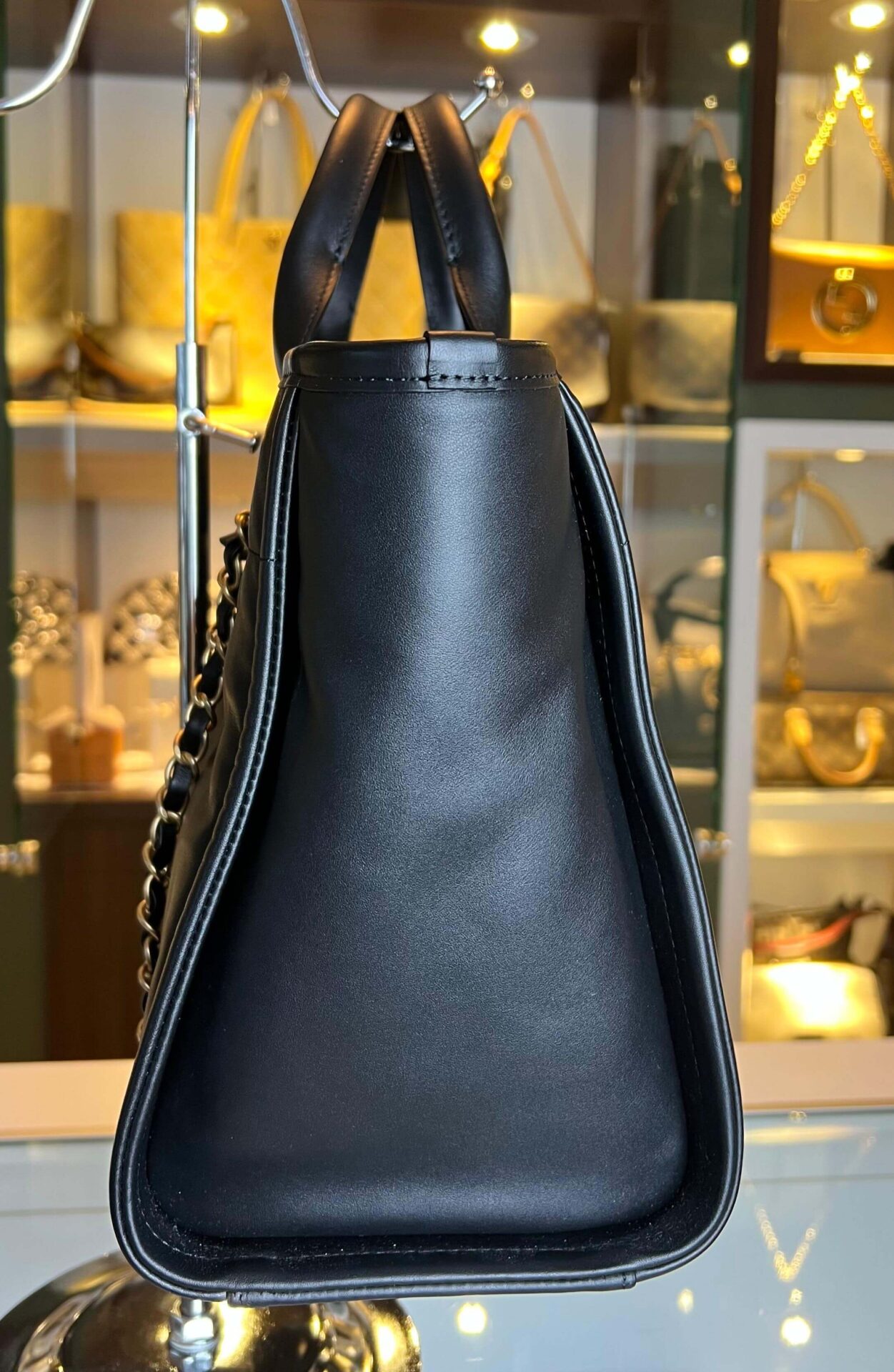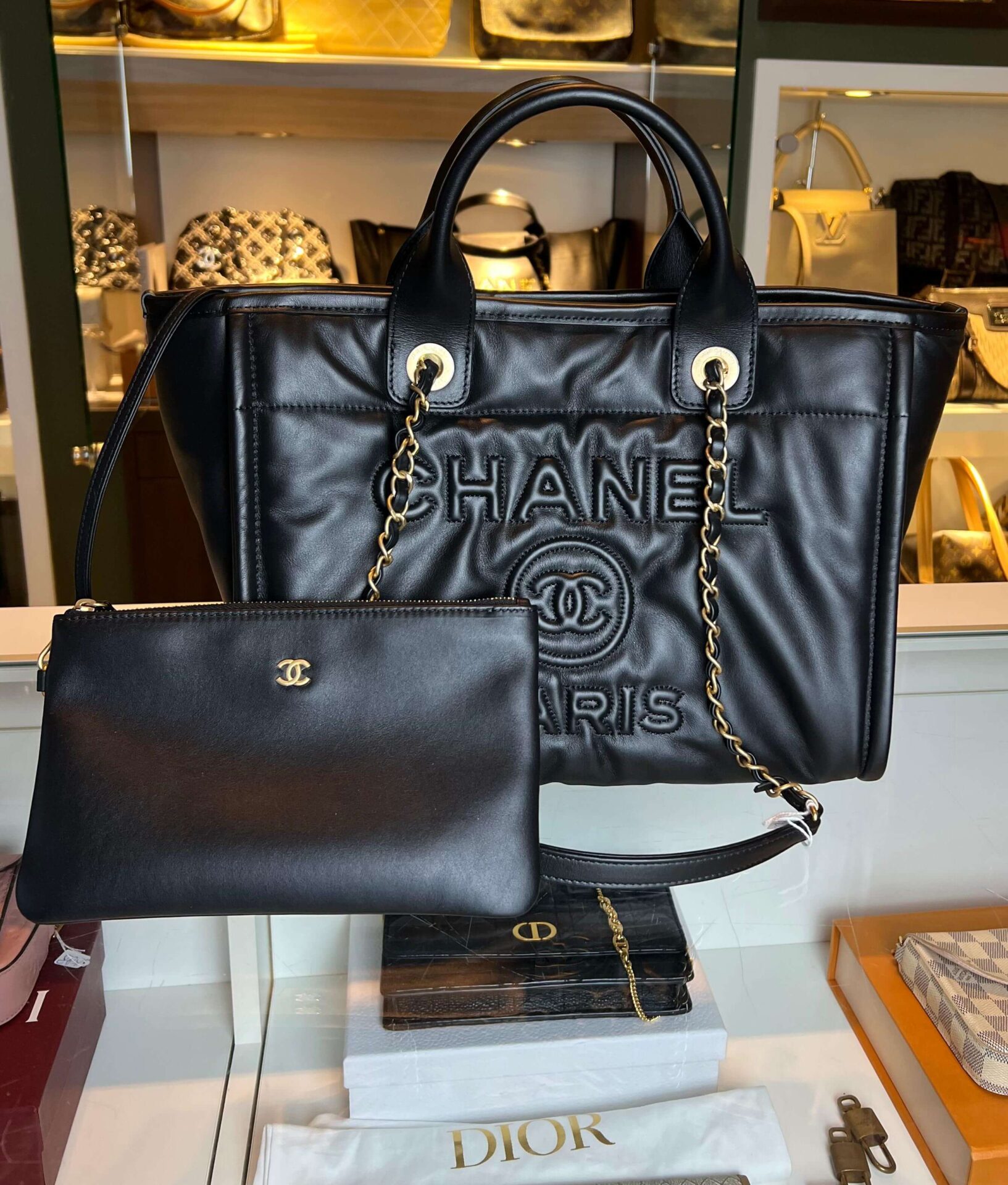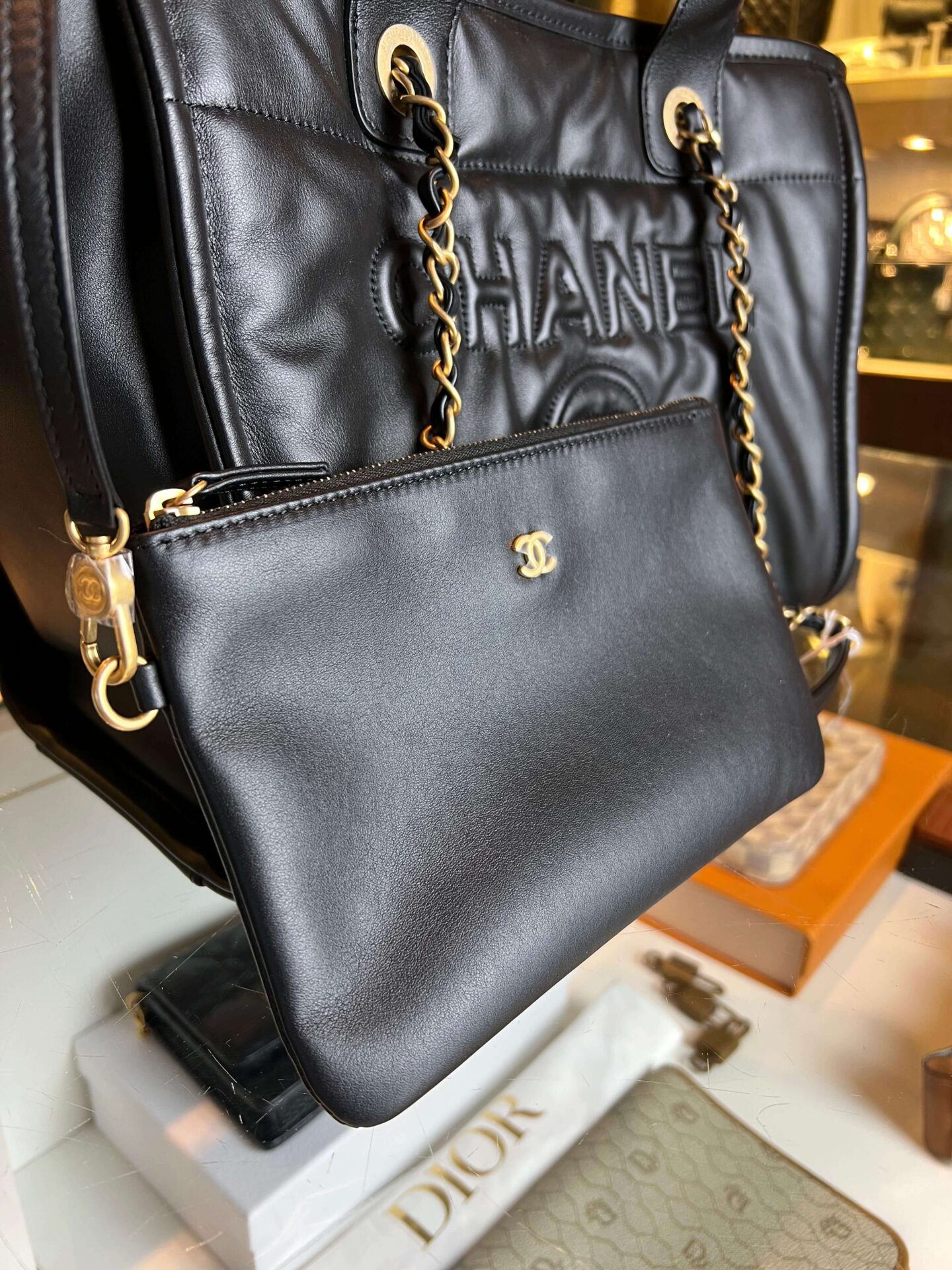 Een full set van deze prachtige Chanel Deauville in volledig zwart lamsleder met gouden hardware. De hardware zit nog in de stickers, de tas verkeerd in nieuwstaat. Ze komt uit 2023.