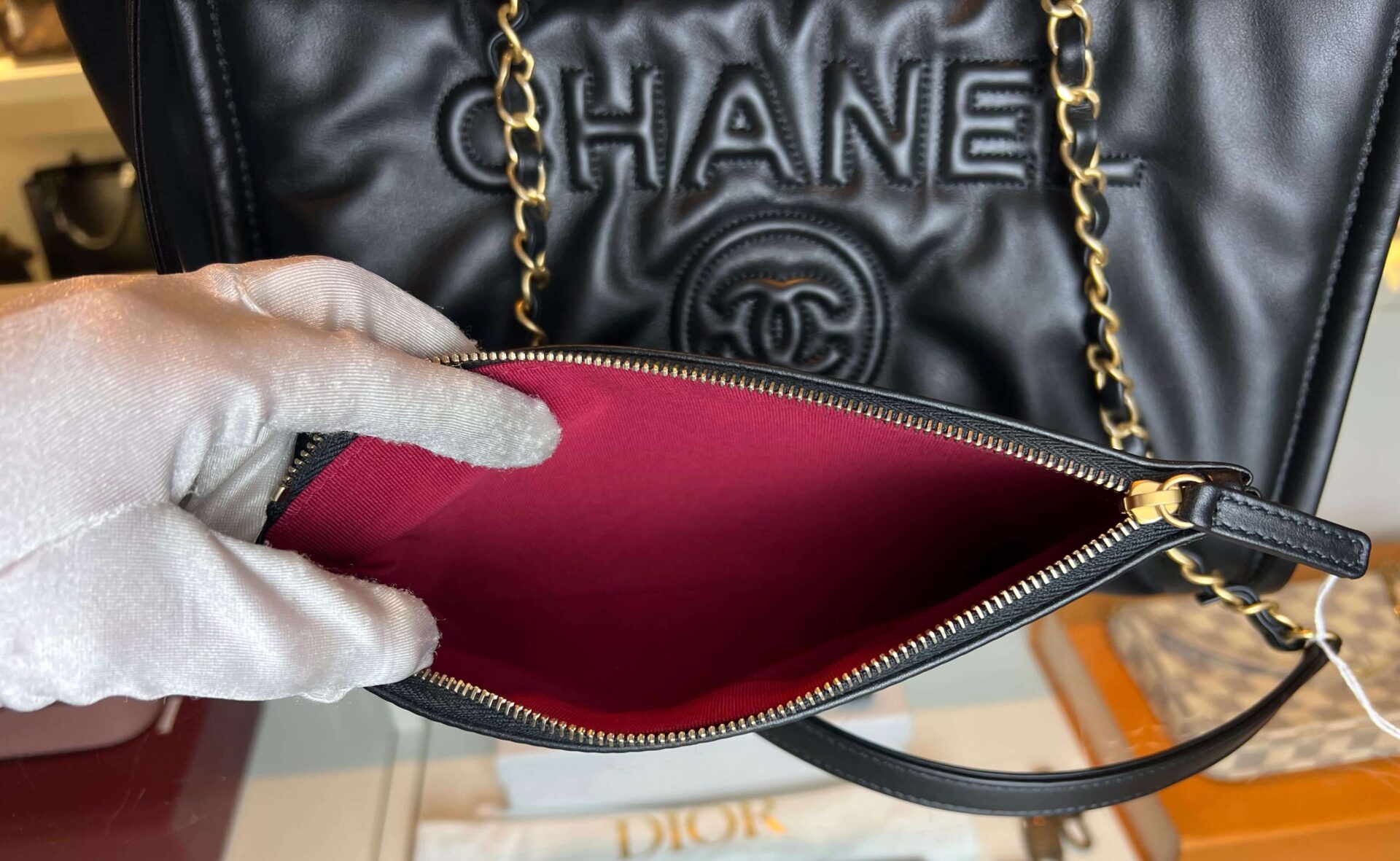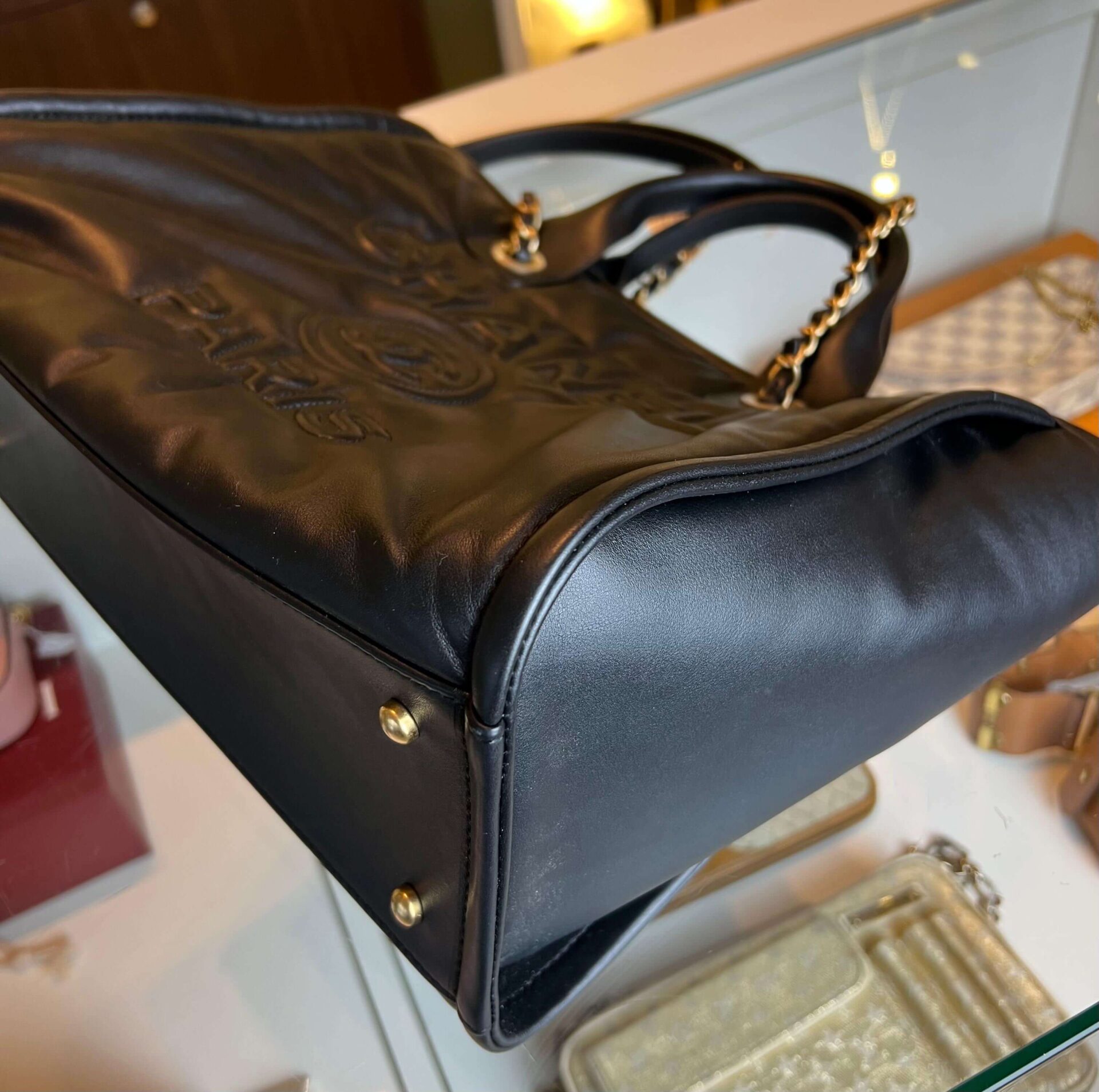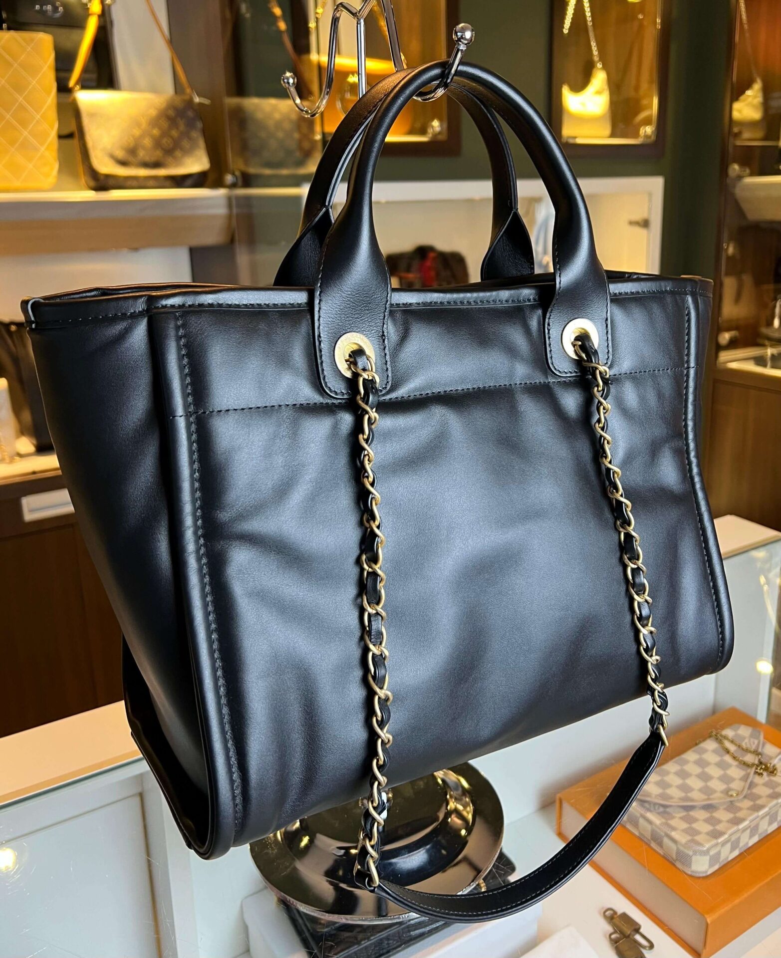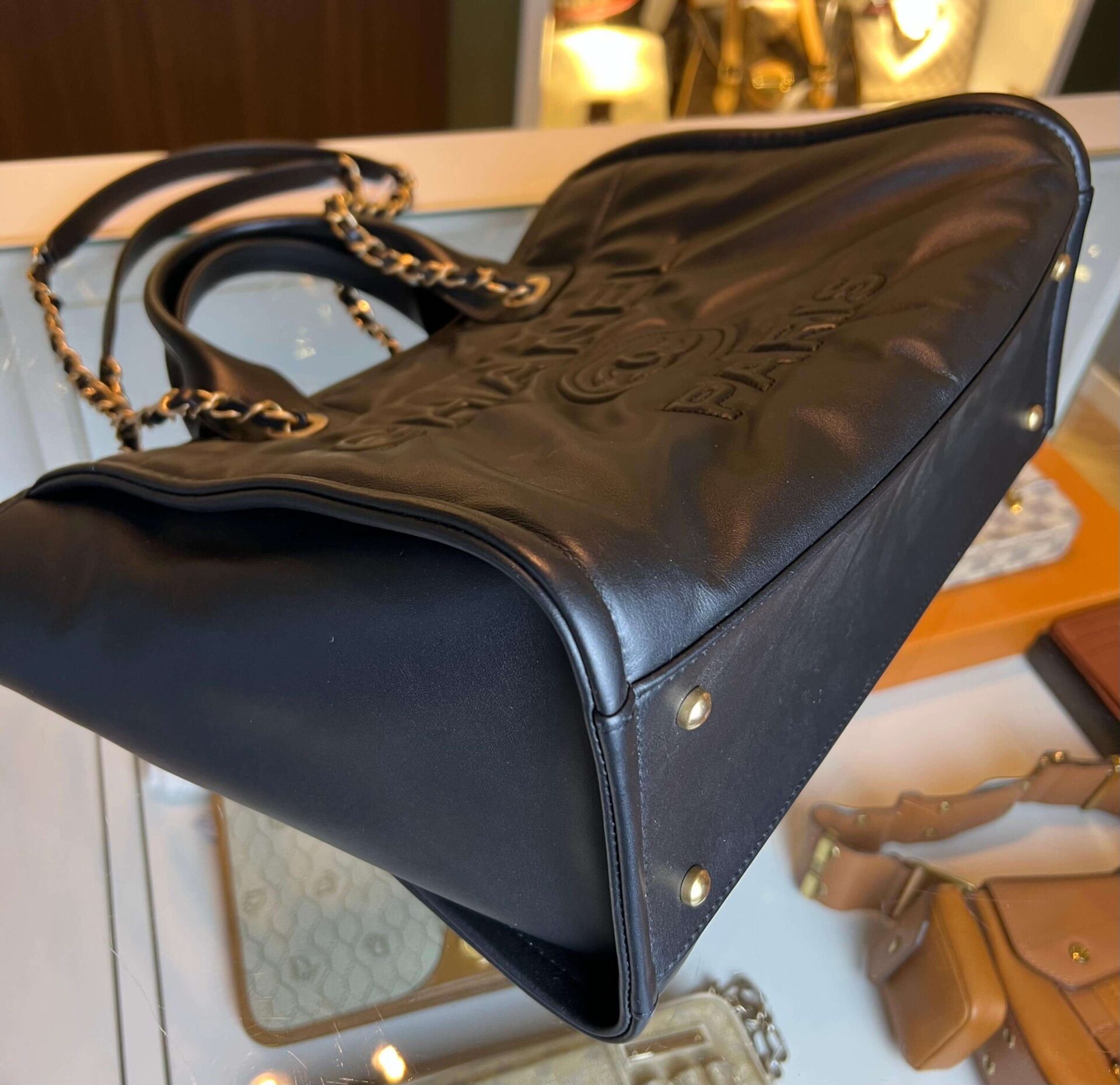 Een full set van deze prachtige Chanel Deauville in volledig zwart lamsleder met gouden hardware. De hardware zit nog in de stickers, de tas verkeerd in nieuwstaat. Ze komt uit 2023.