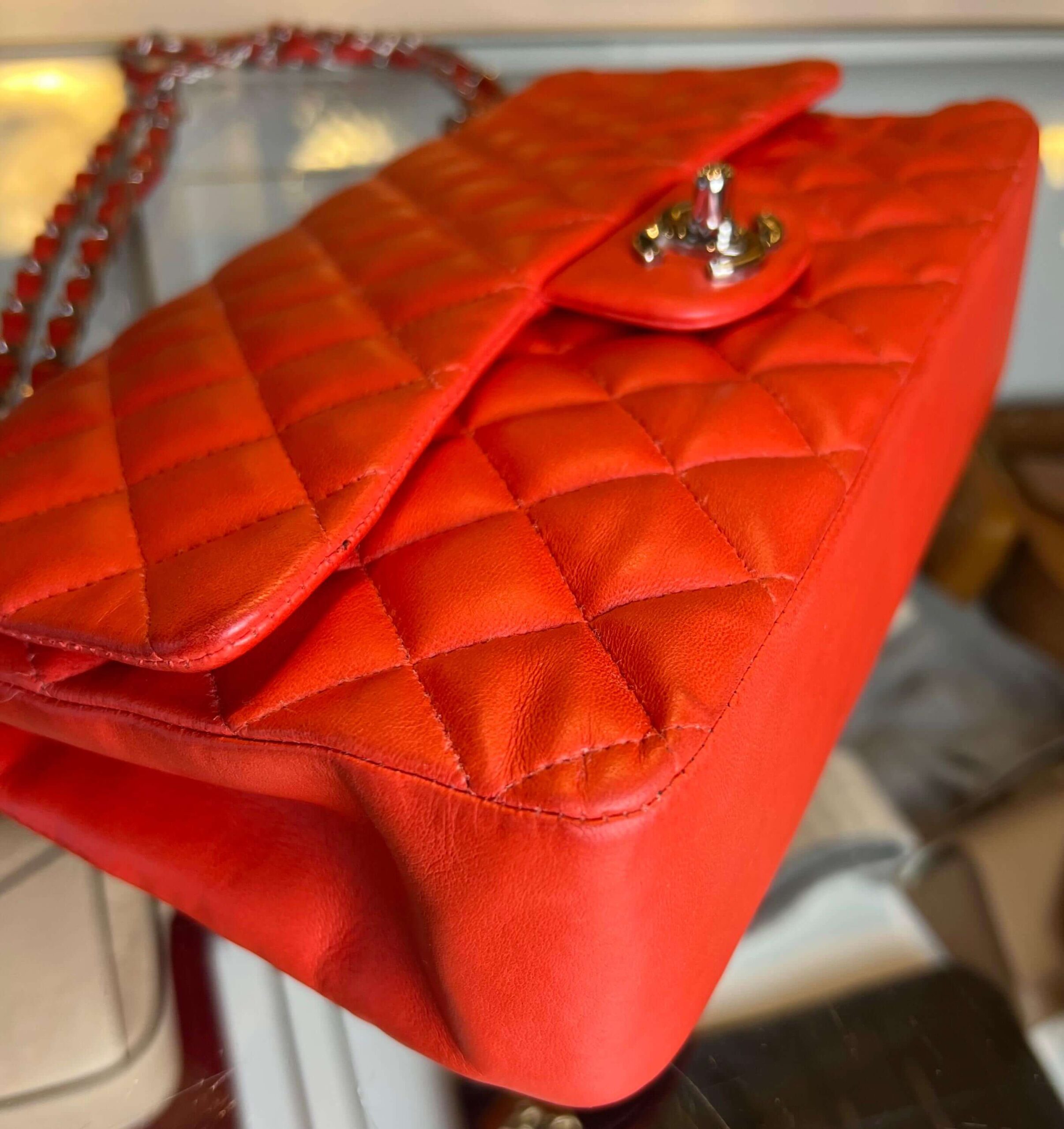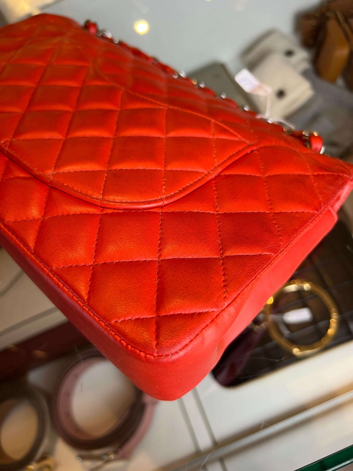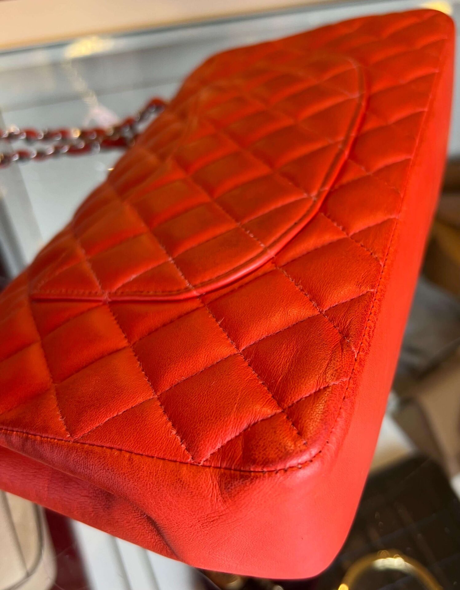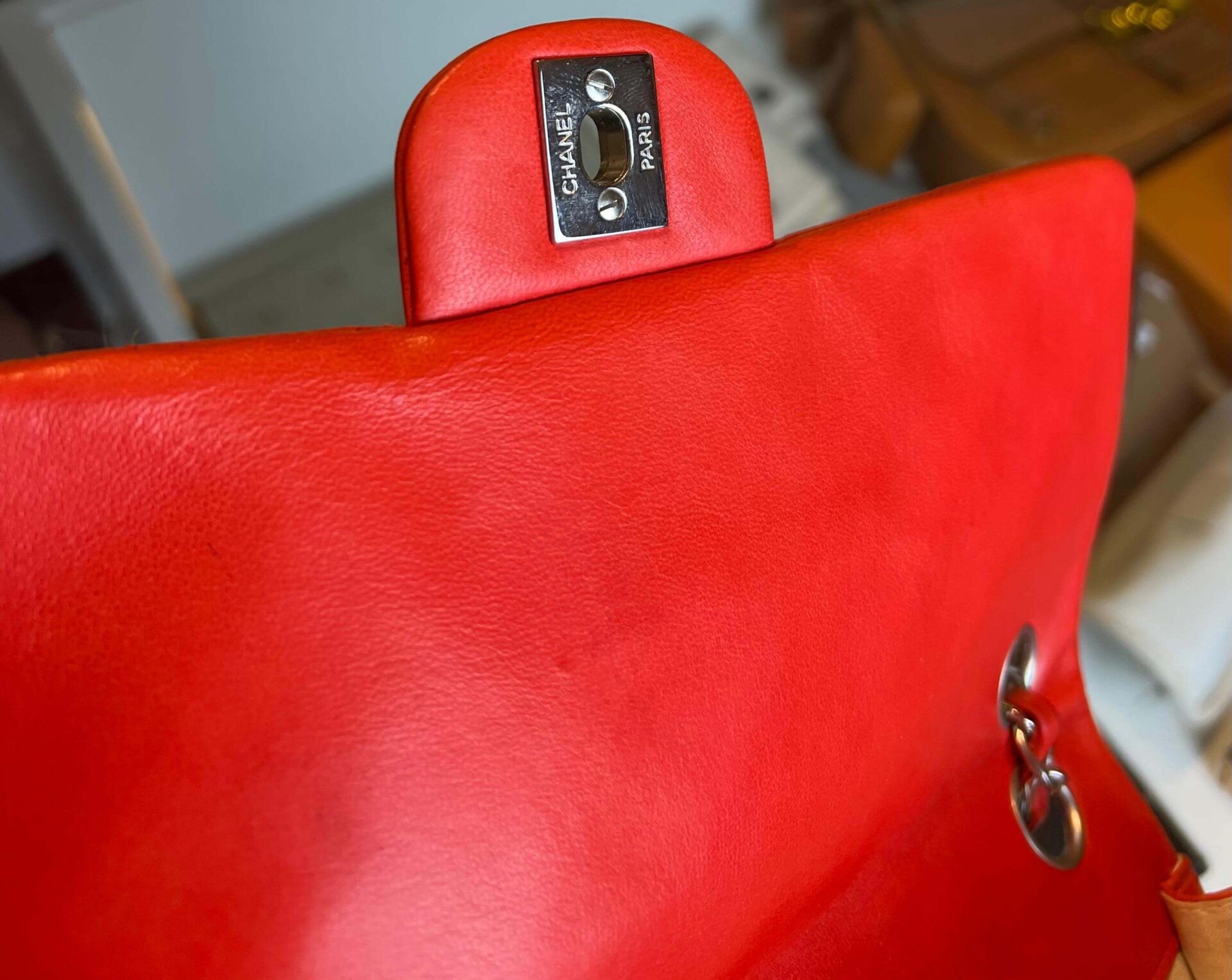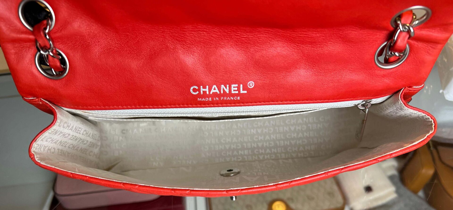 Chanel Single Flap Bag Resort Collection uit het jaartal 2003-2004. Ze is een 8 serie en het serienummer is aanwezig. Ze verkeerd in een goede staat met gebruikerssporen. Ze kan met een dubbele ketting worden gedragen of crossbody.