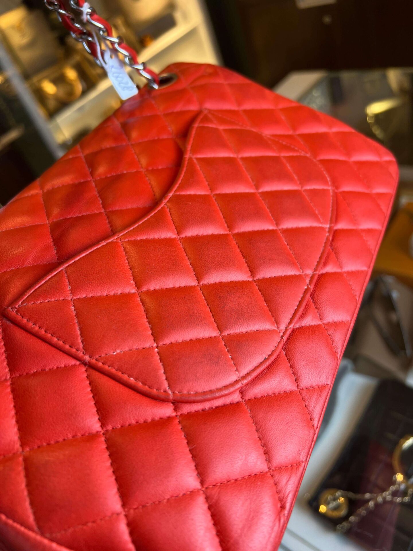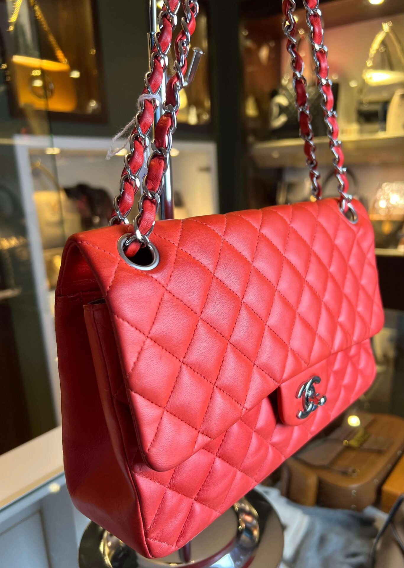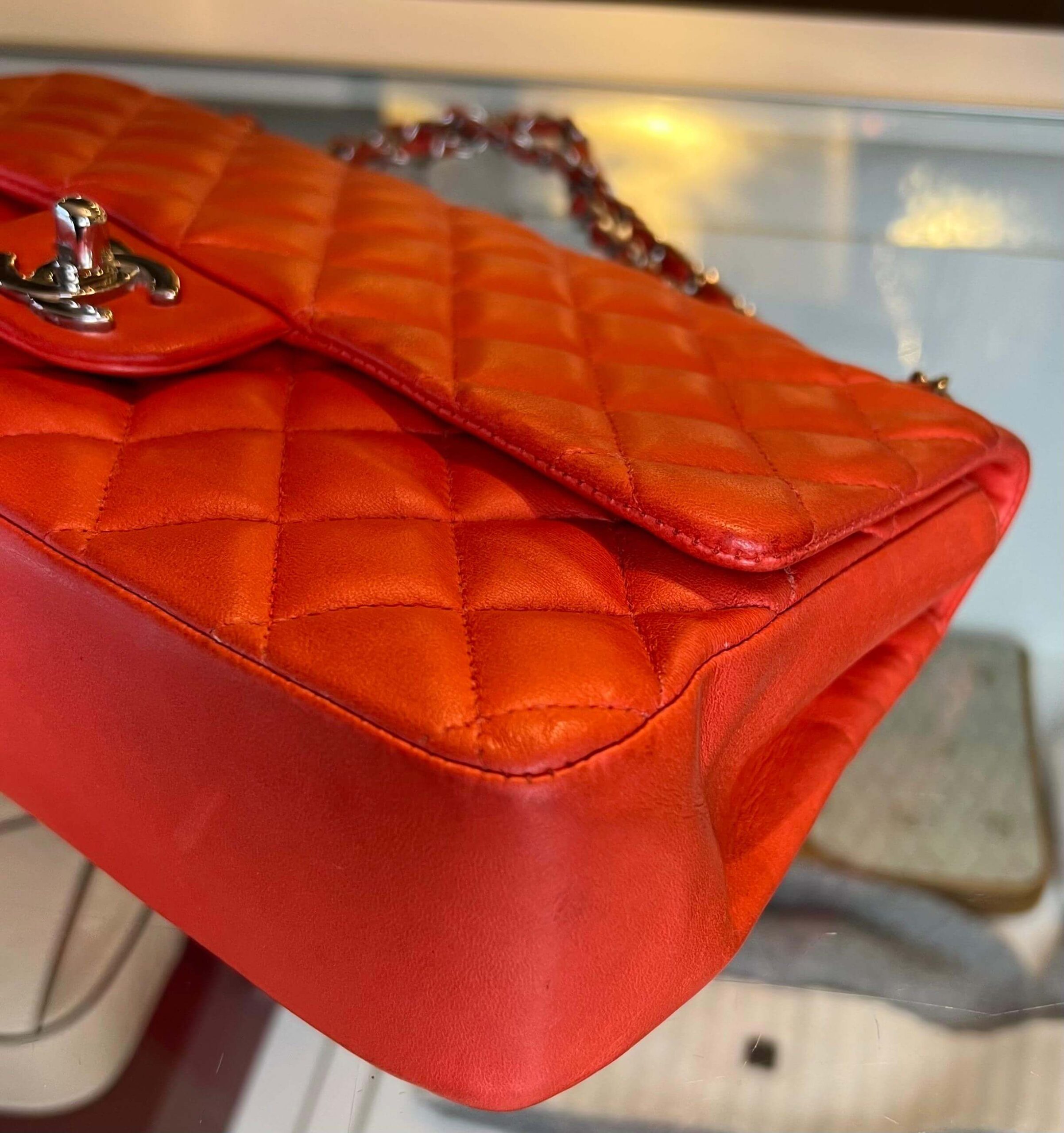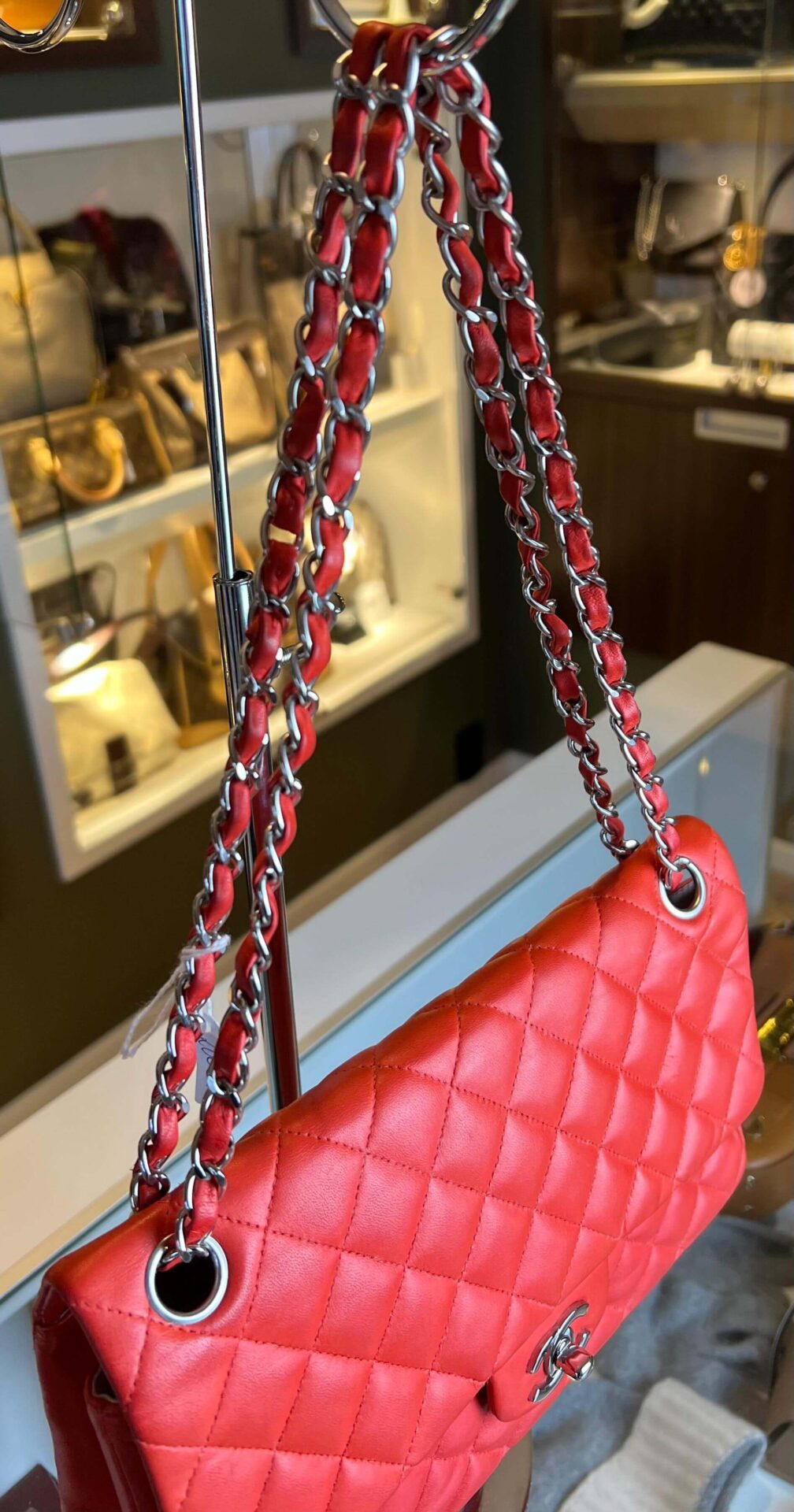Chanel Single Flap Bag Resort Collection uit het jaartal 2003-2004. Ze is een 8 serie en het serienummer is aanwezig. Ze verkeerd in een goede staat met gebruikerssporen. Ze kan met een dubbele ketting worden gedragen of crossbody.