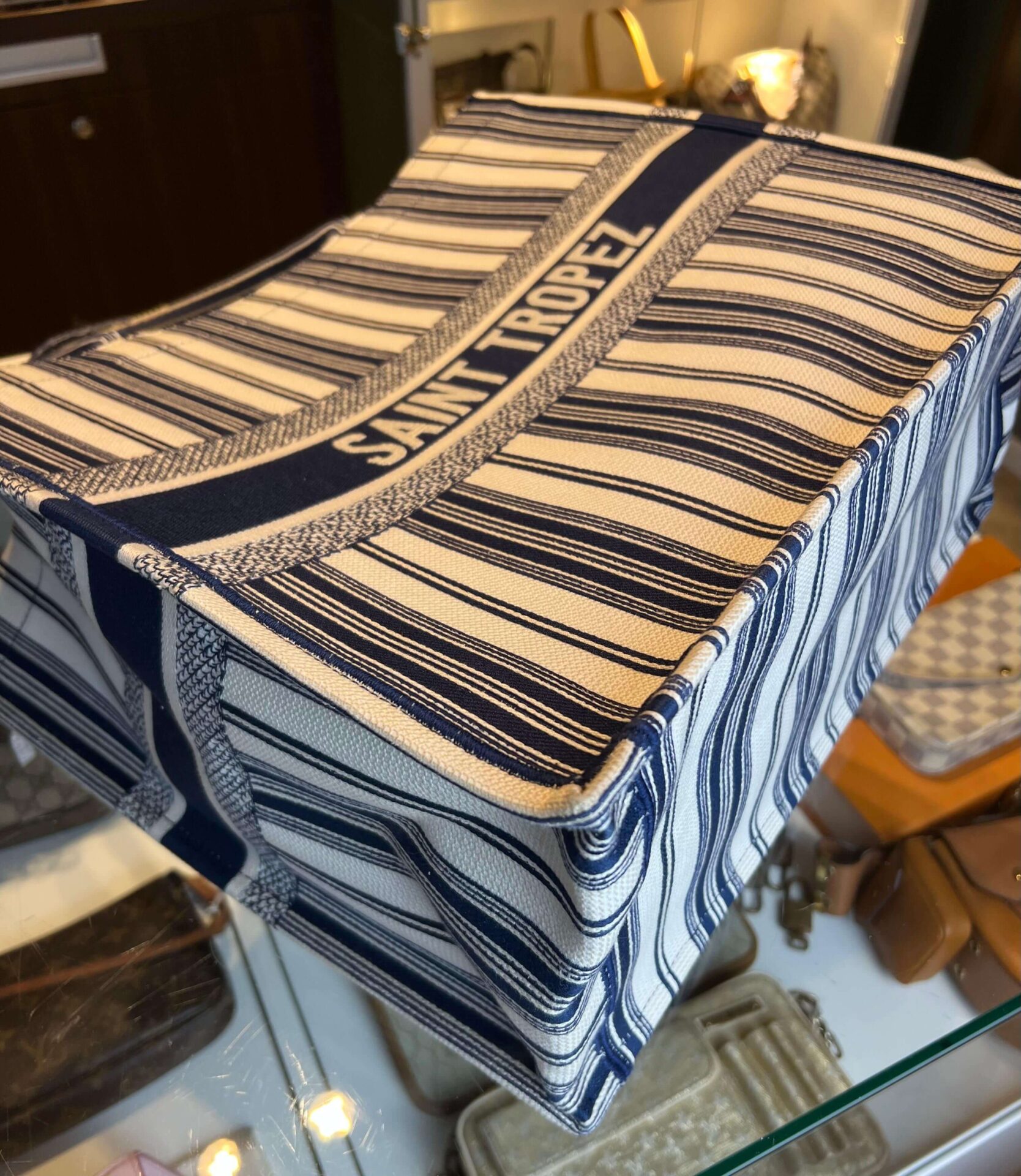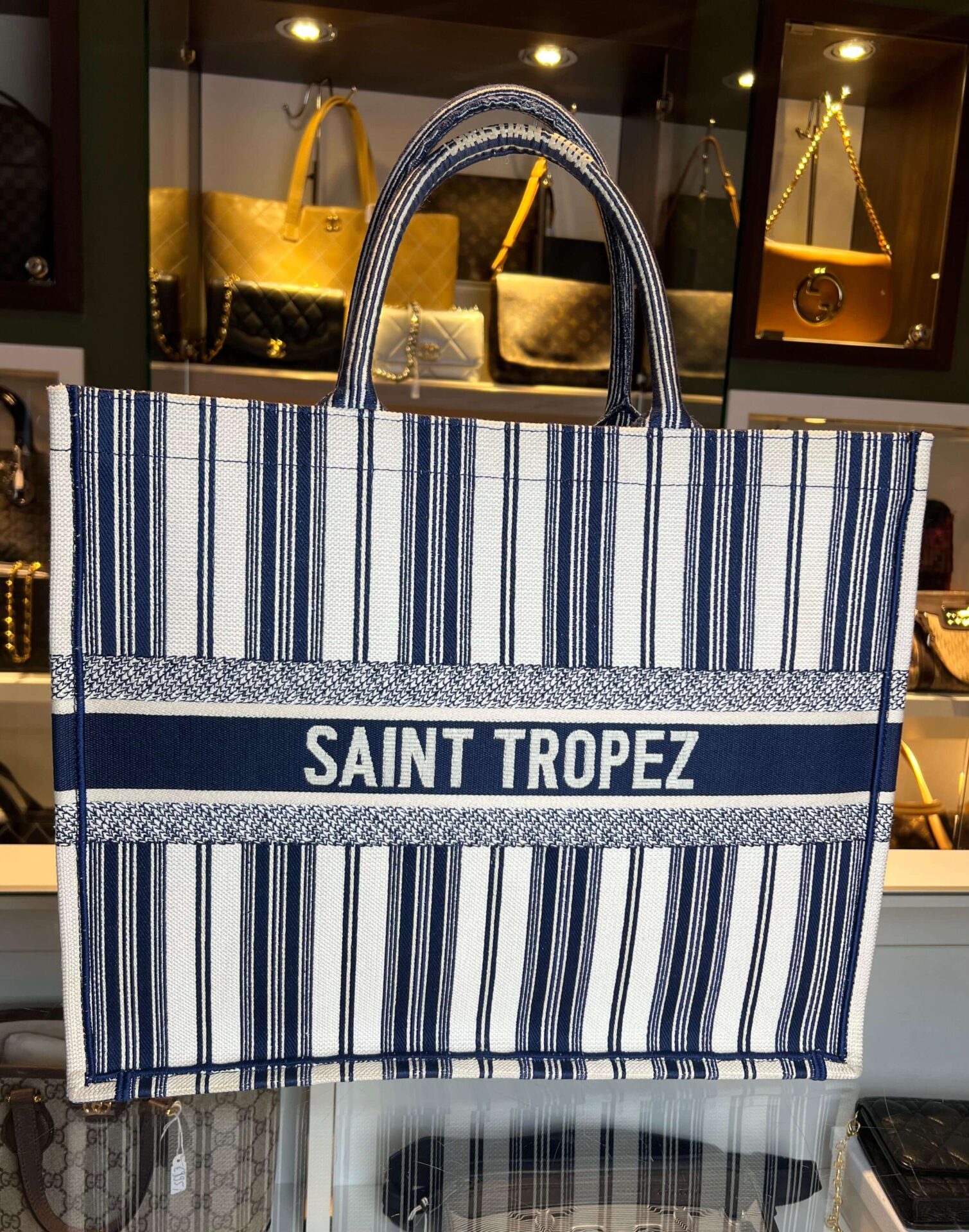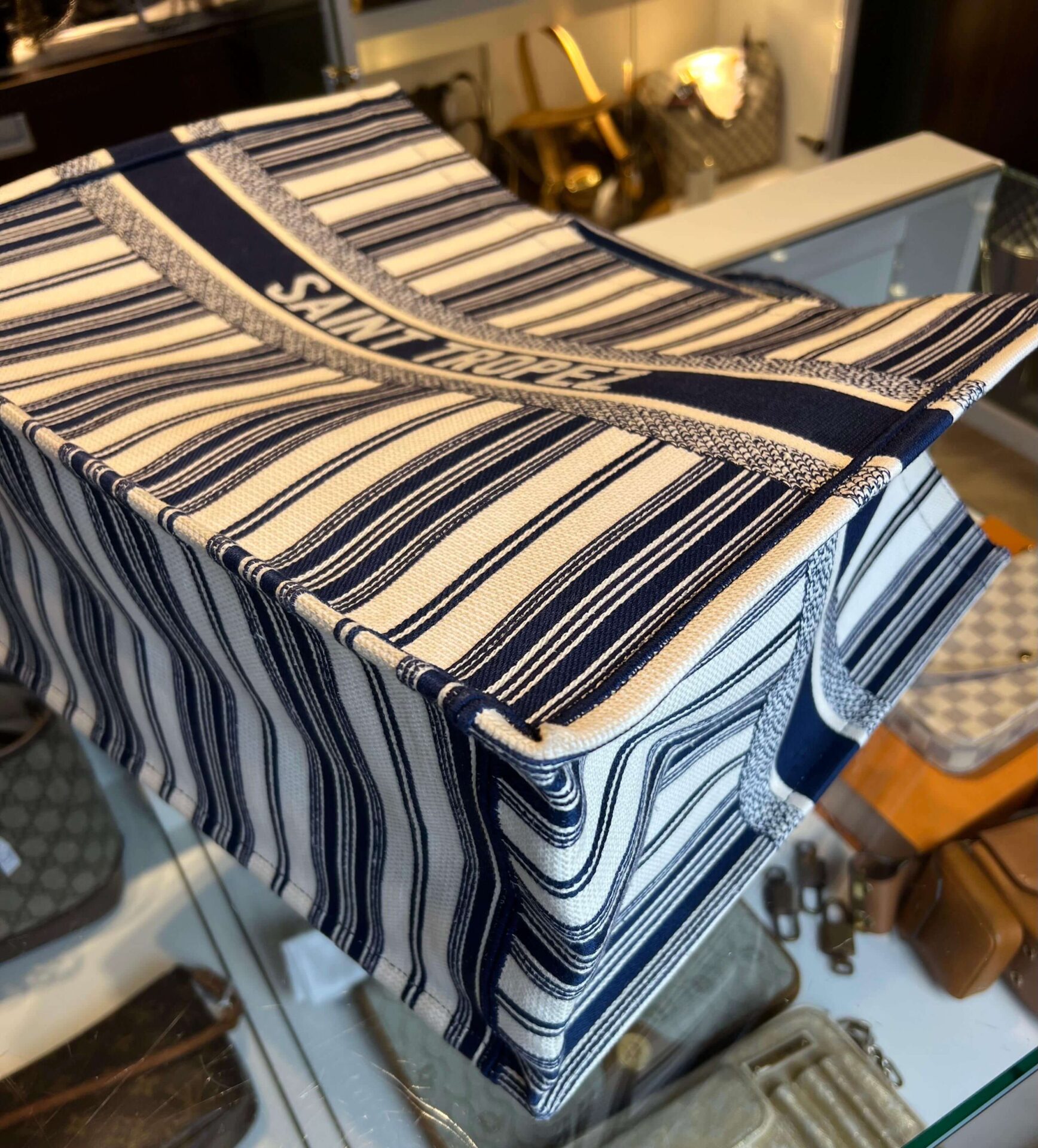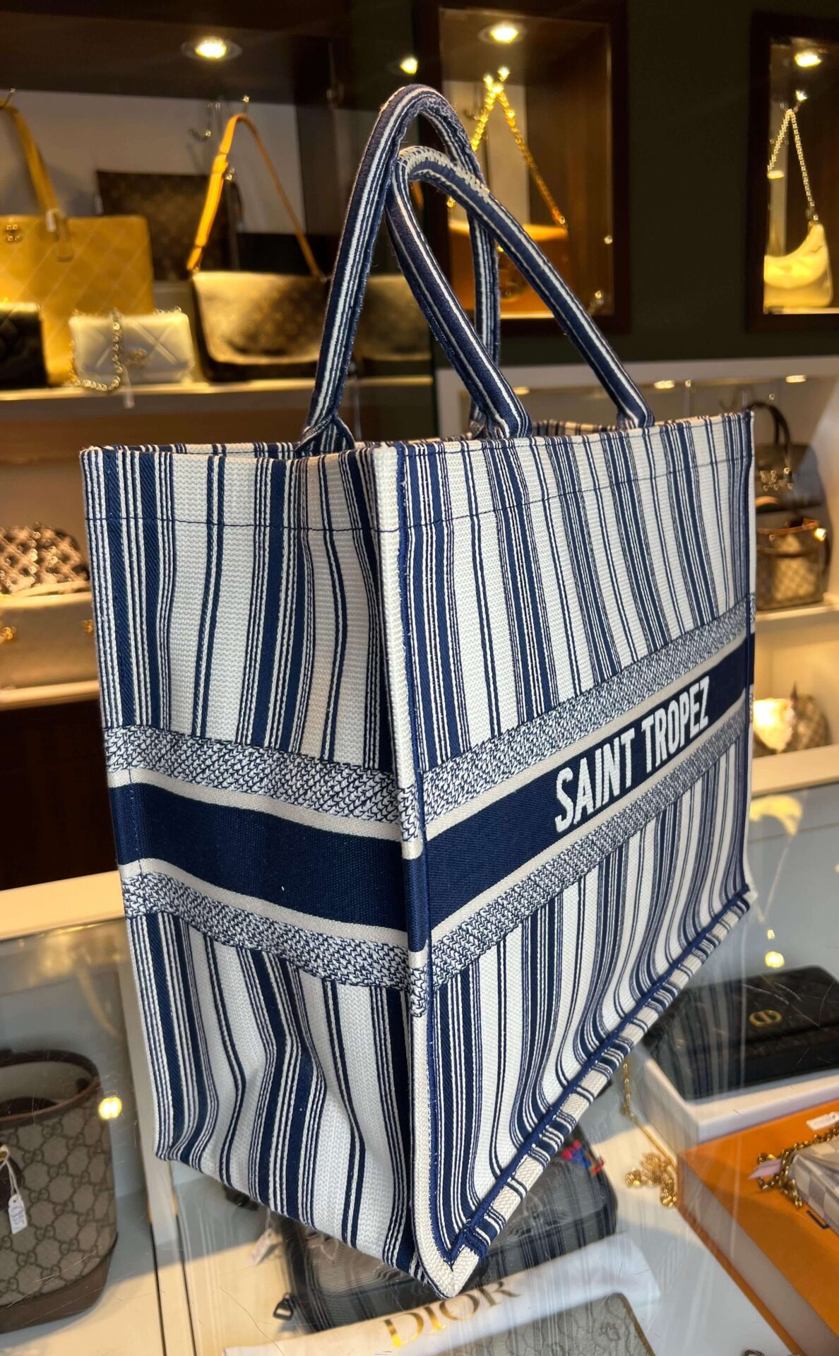 Dior Large Book Tote in de uitvoering Saint Tropez. Ze is dan ook aangekocht in Saint Tropez! Ze komt uit het jaartal 2021 met alle toebehoren, behalve de doos. Ze is een zeer goede staat, enkel de handvatten zie je ietwat gebruikerssporen.