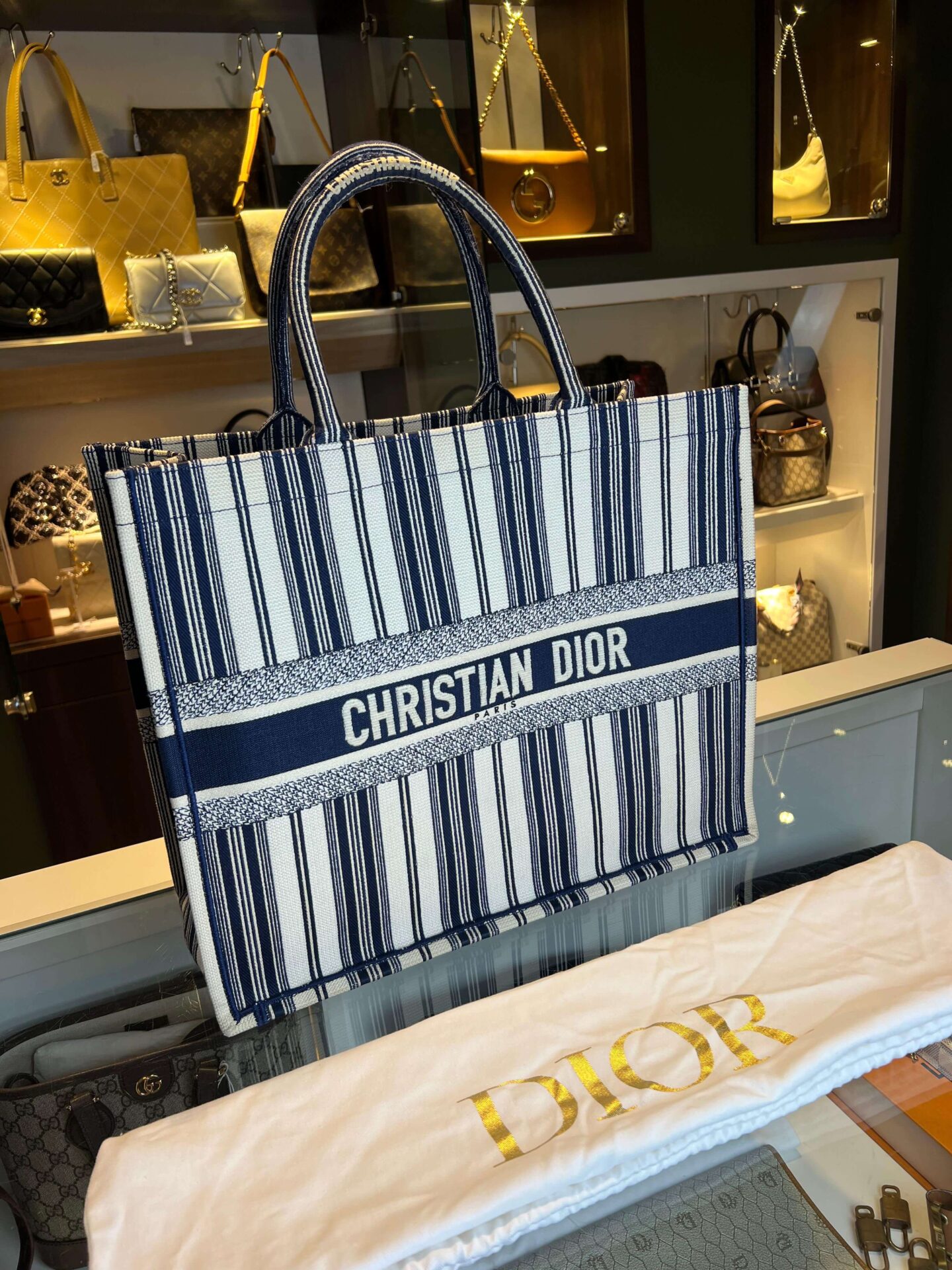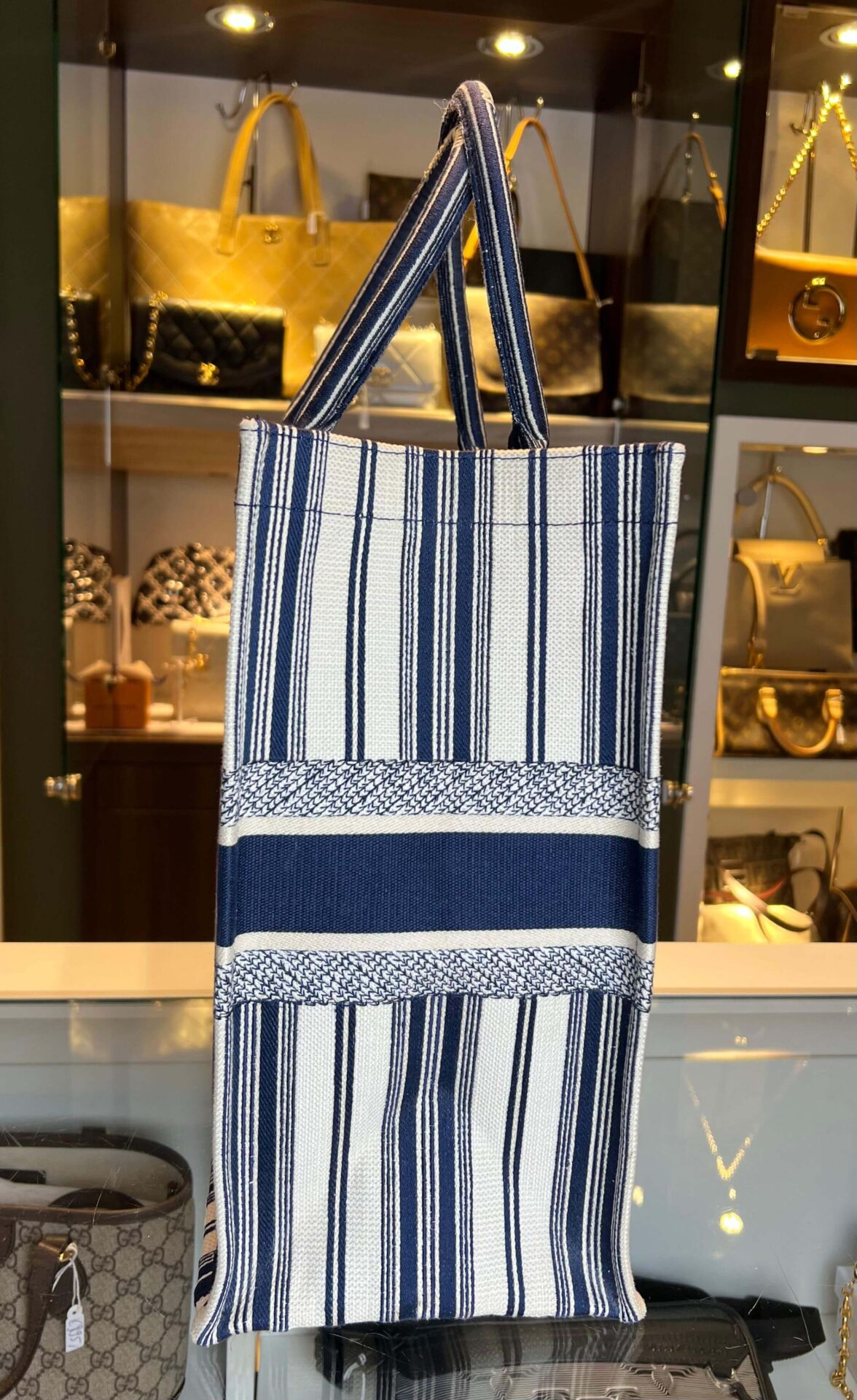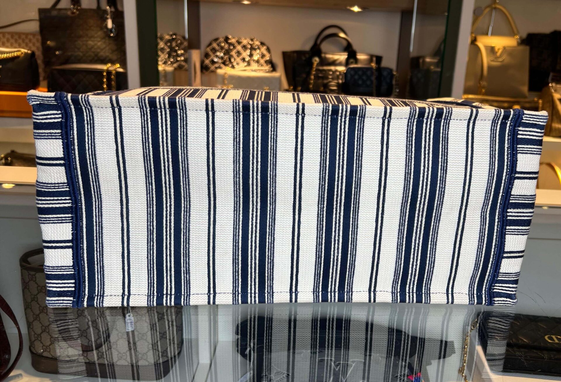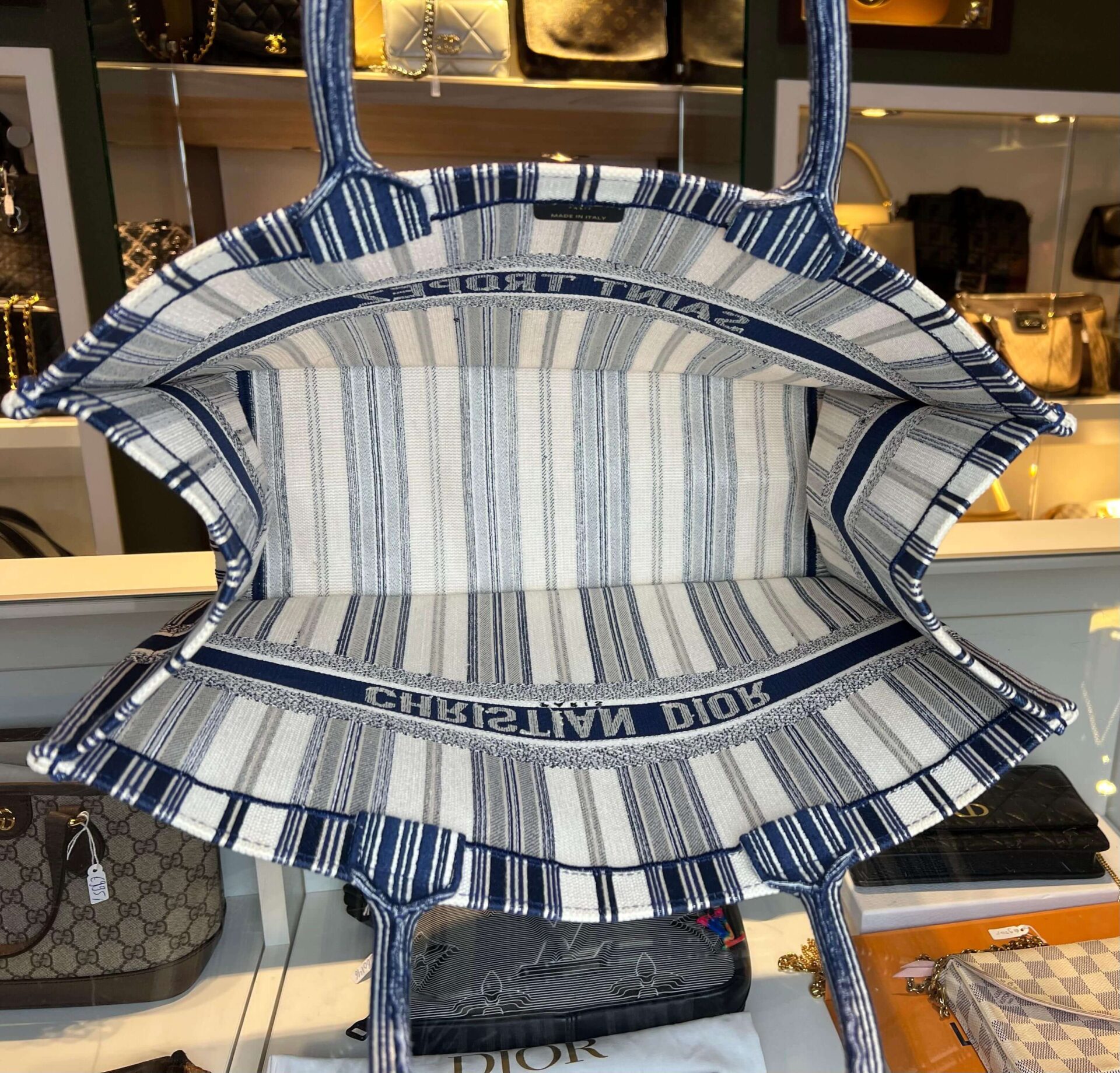 Dior Large Book Tote in de uitvoering Saint Tropez. Ze is dan ook aangekocht in Saint Tropez! Ze komt uit het jaartal 2021 met alle toebehoren, behalve de doos. Ze is een zeer goede staat, enkel de handvatten zie je ietwat gebruikerssporen.