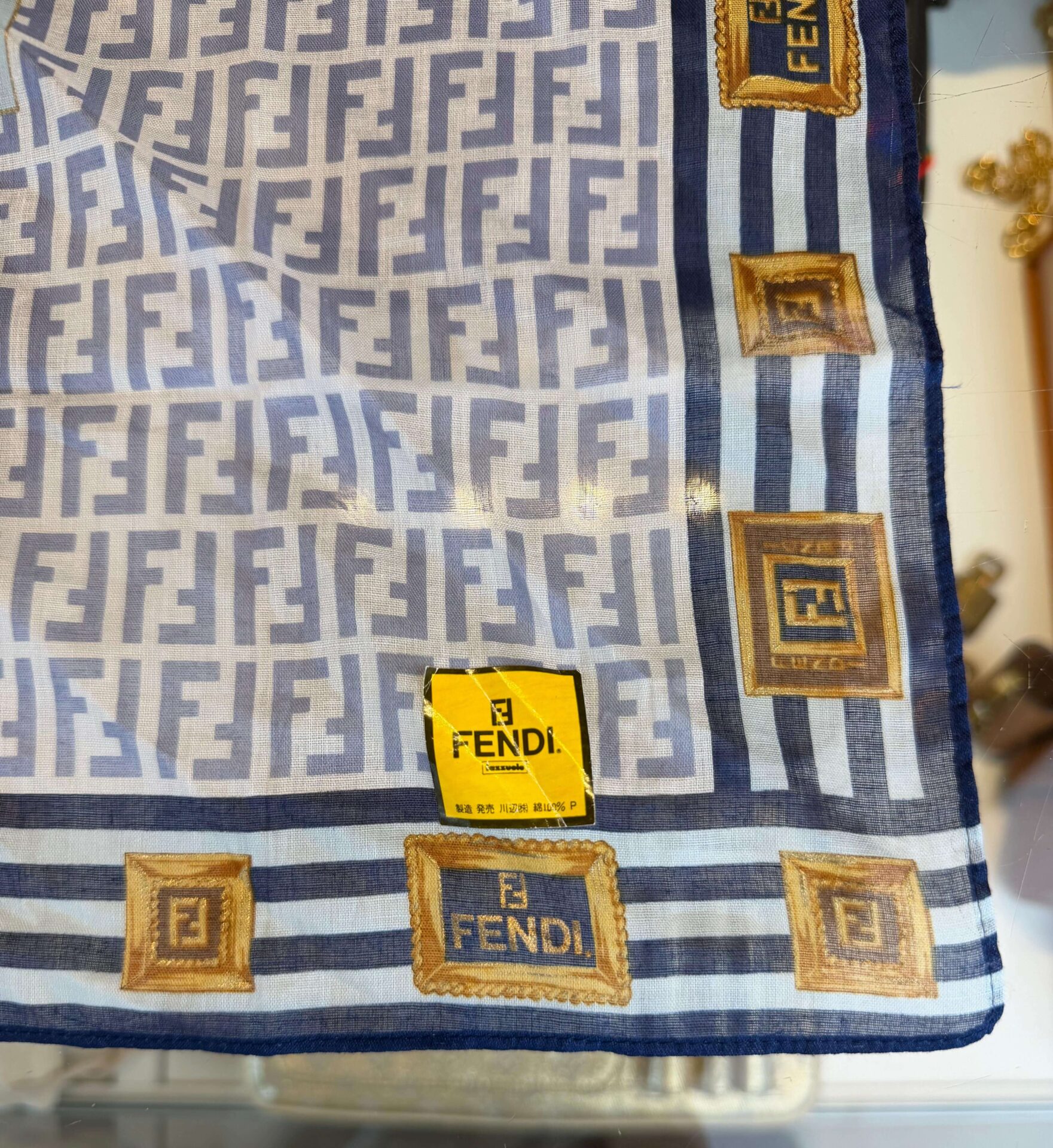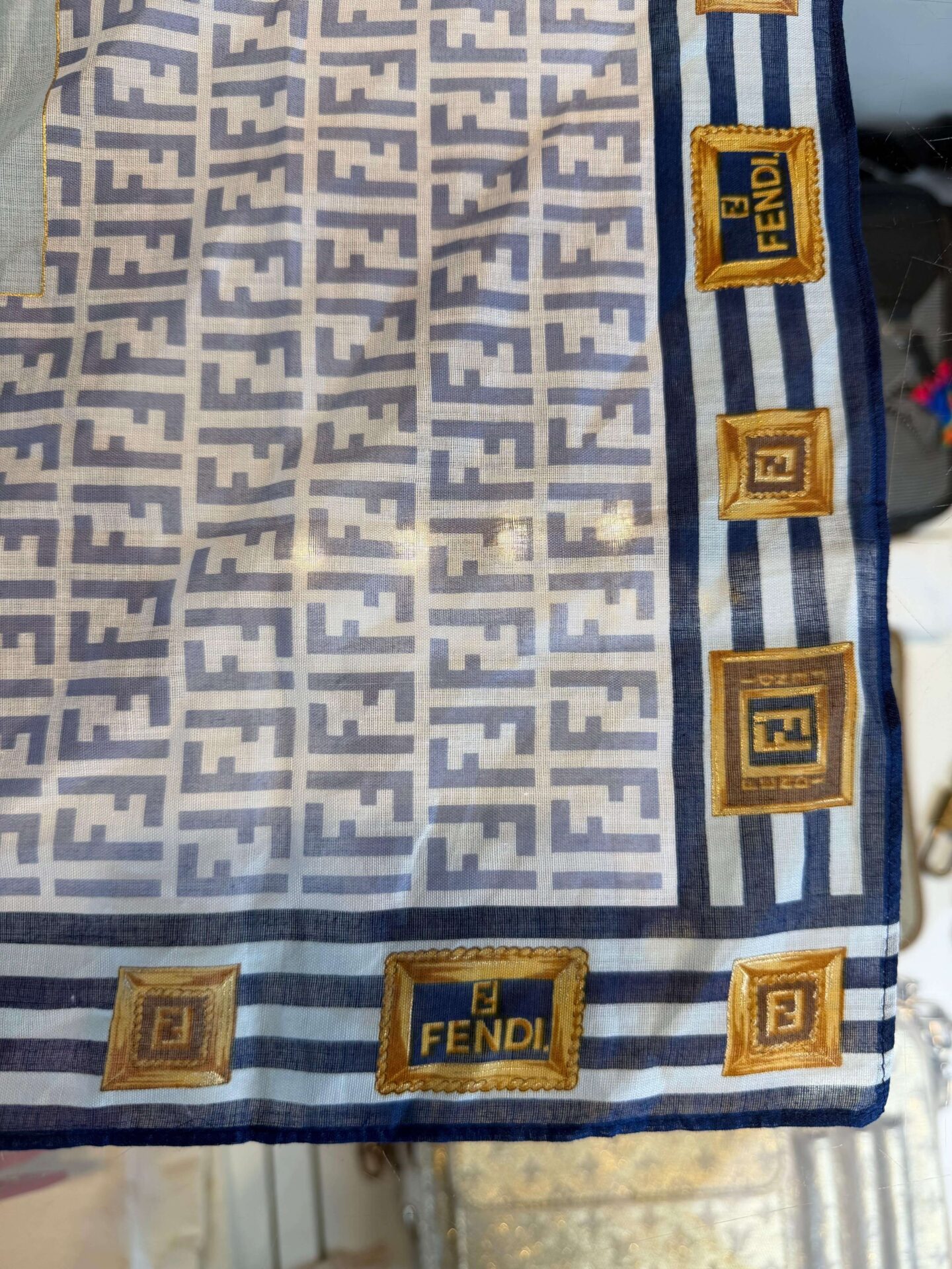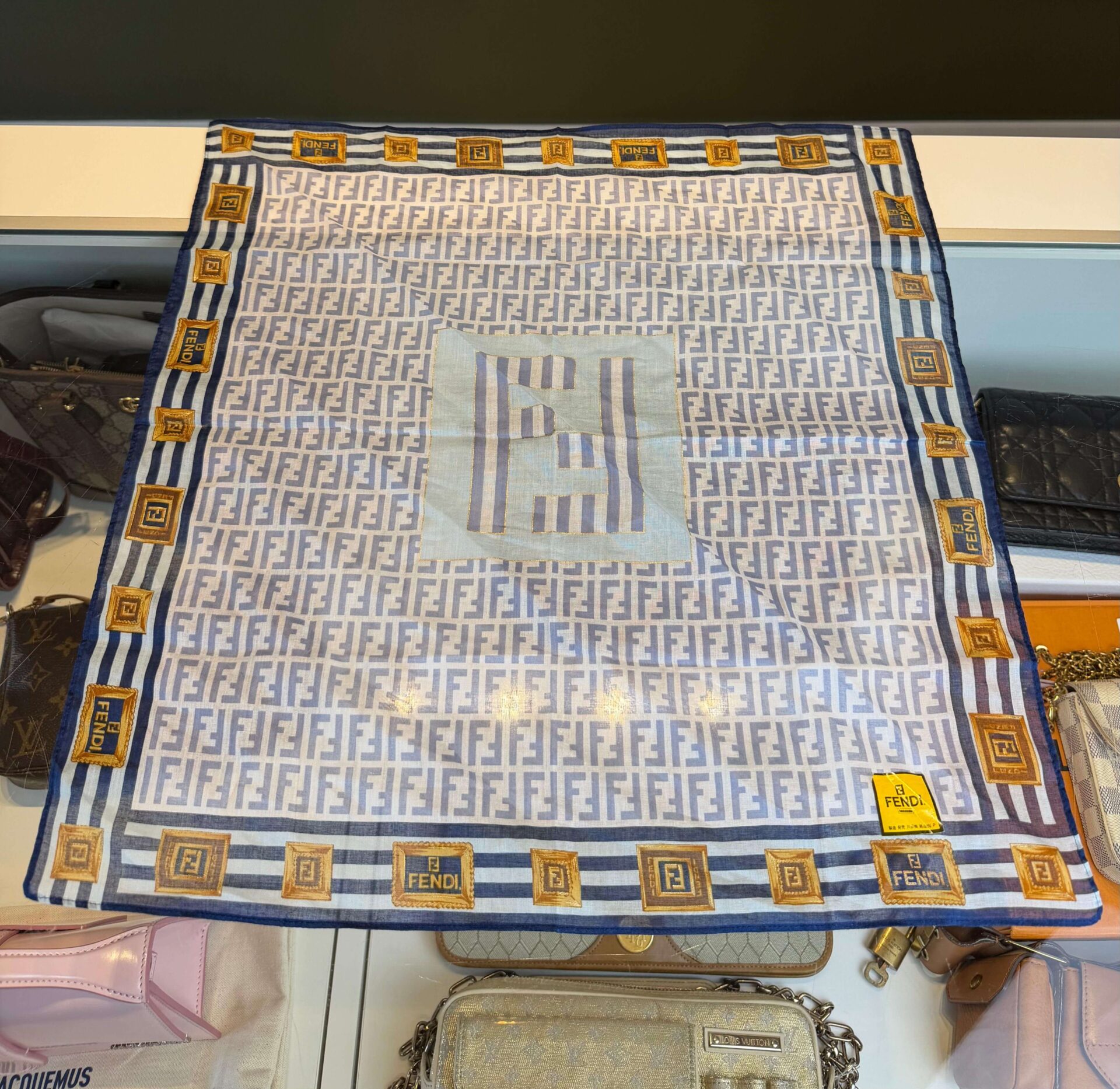Fendi Scarf/Bandana/Twilly in de FF Monogram. Ze is bruikbaar voor meerdere opties. De kleur is blauw/wit en de Fendi authenticiteit sticker is aanwezig. Ze is vintage. Let op: Shawls kunnen niet geretourneerd worden.