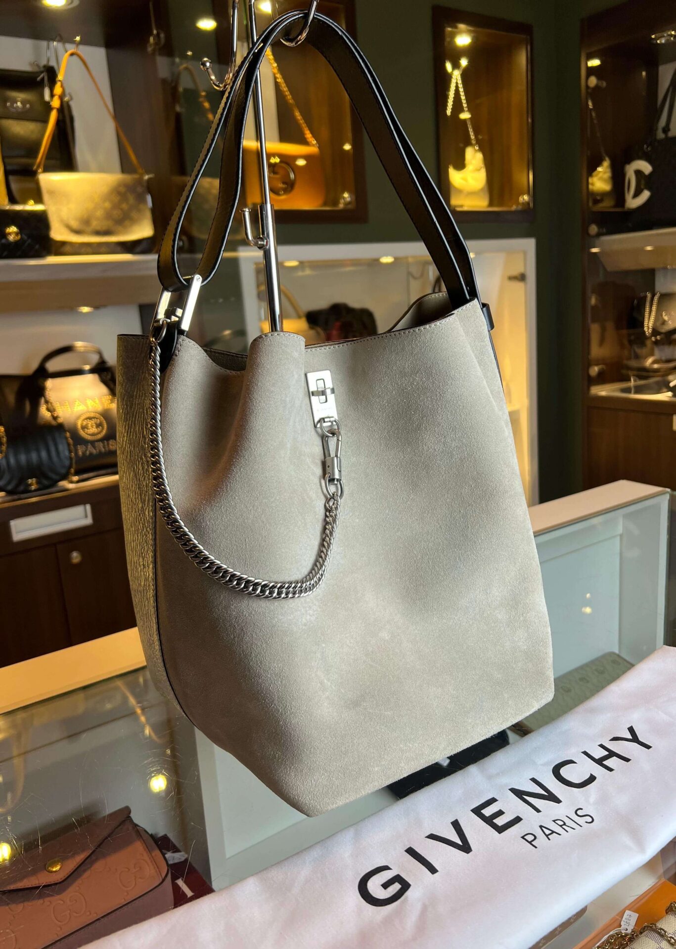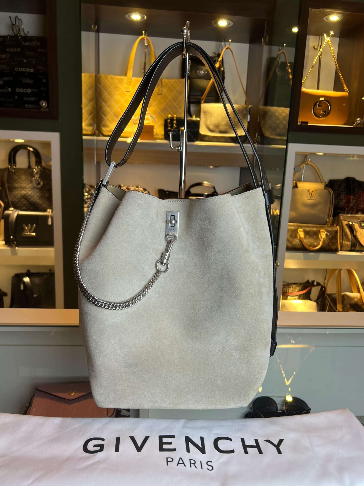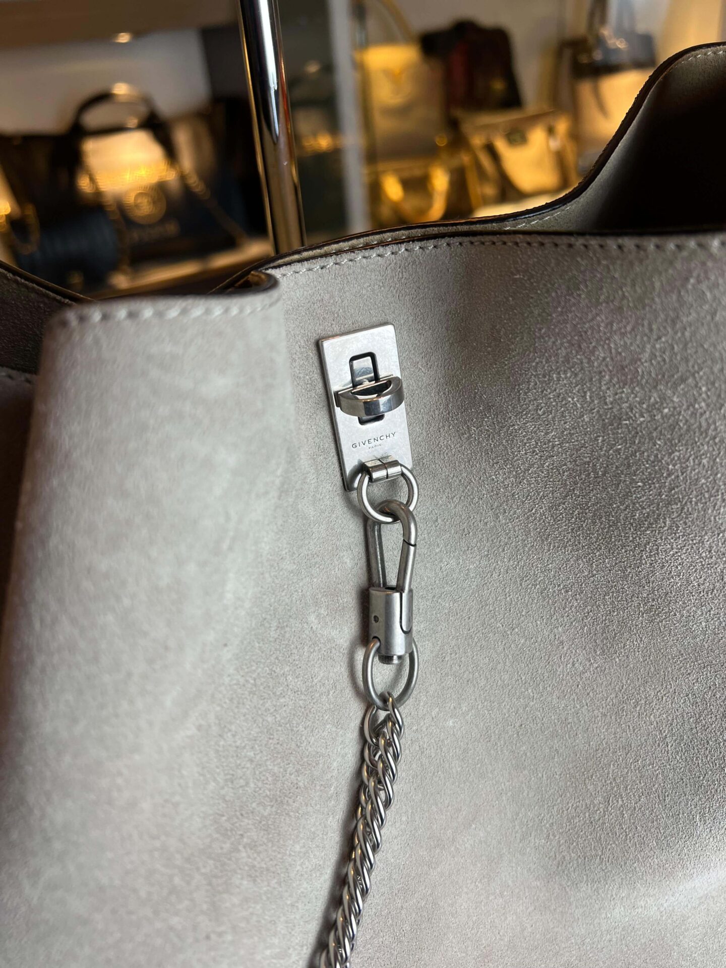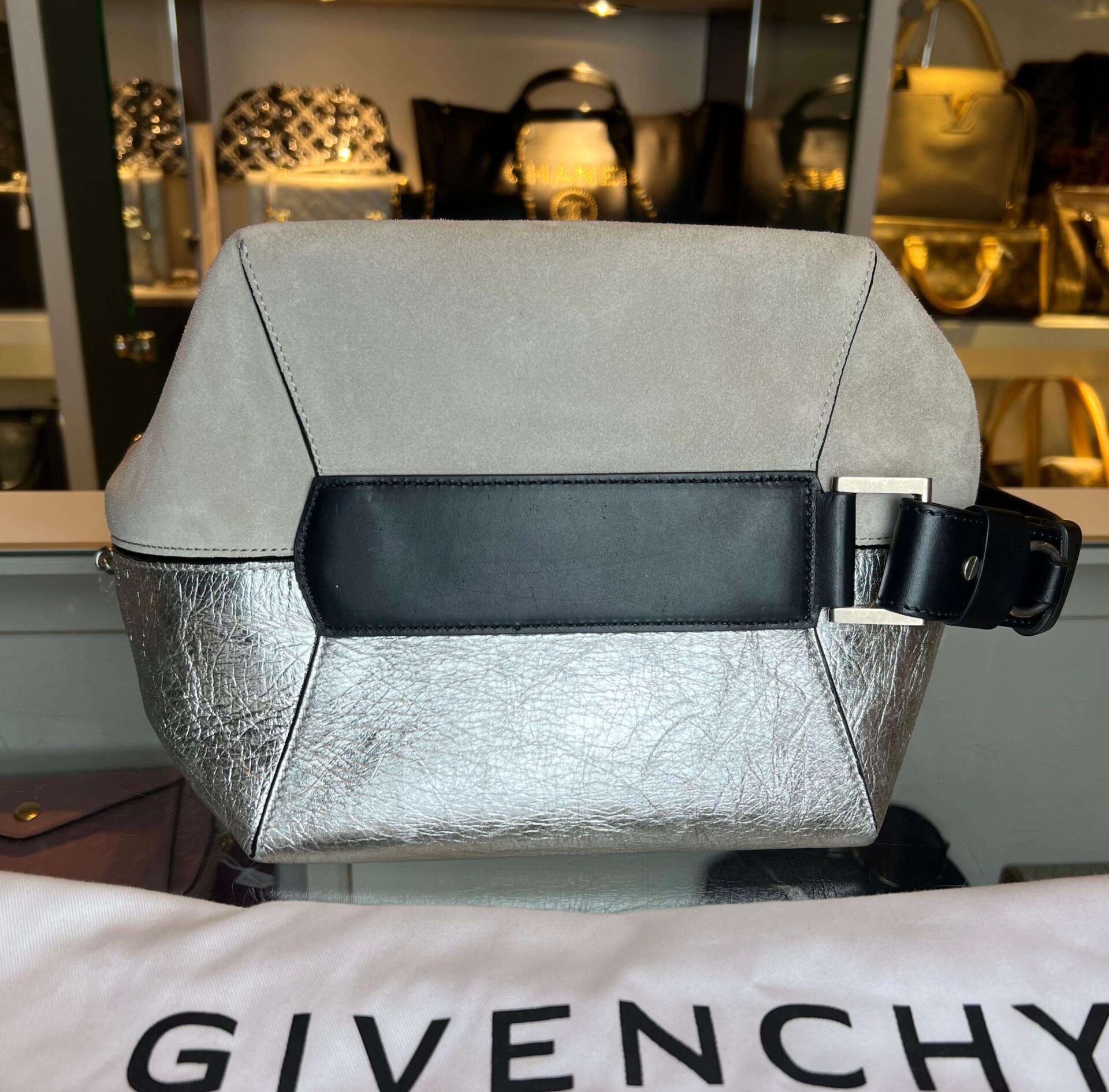 Givenchy Bucket Bag medium met suede, zwart leder en een zilveren lederen achterkant. Aan de binnenkant van het interieur zitten enkele penstrepen. Een hele leuke bucket bag met dustbag.