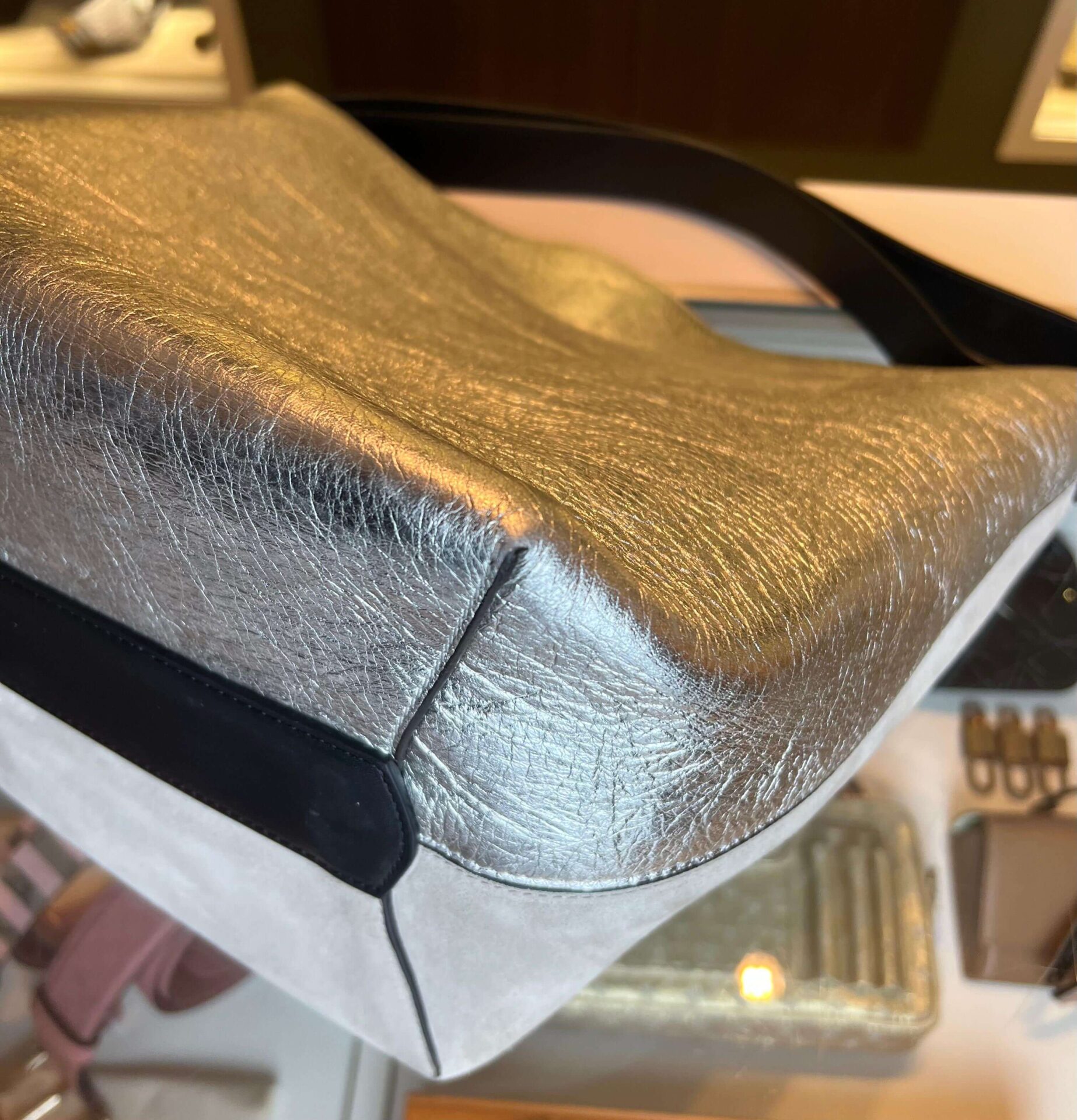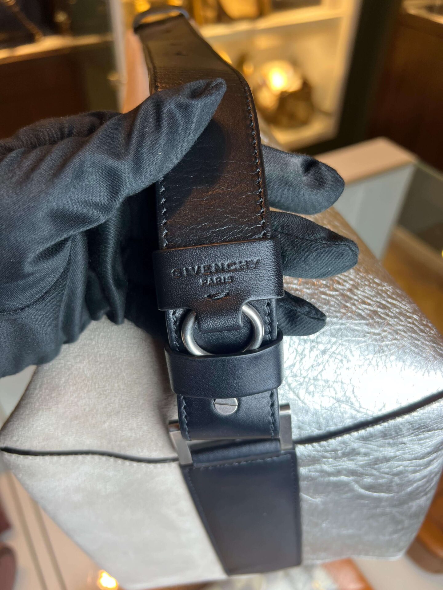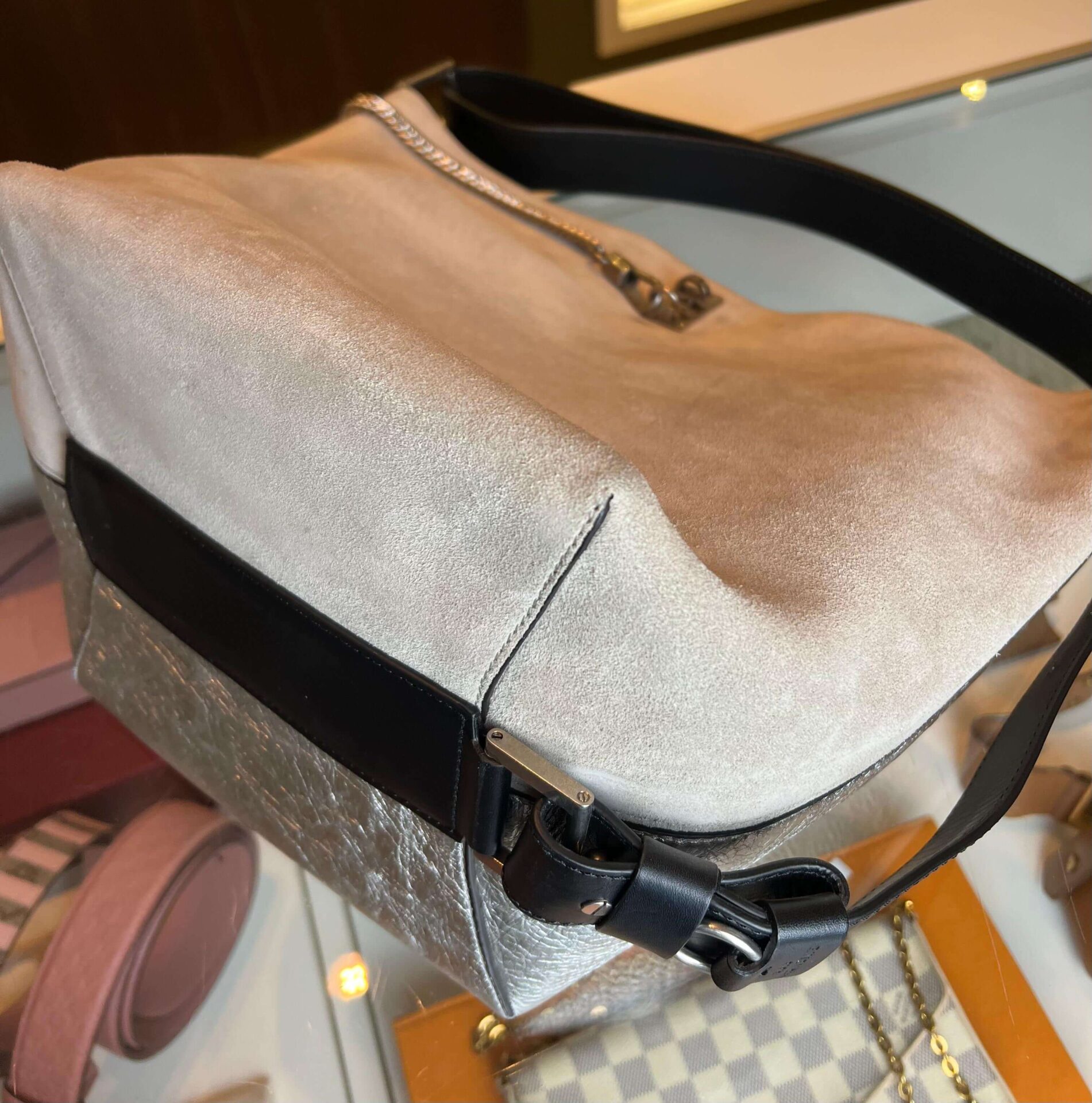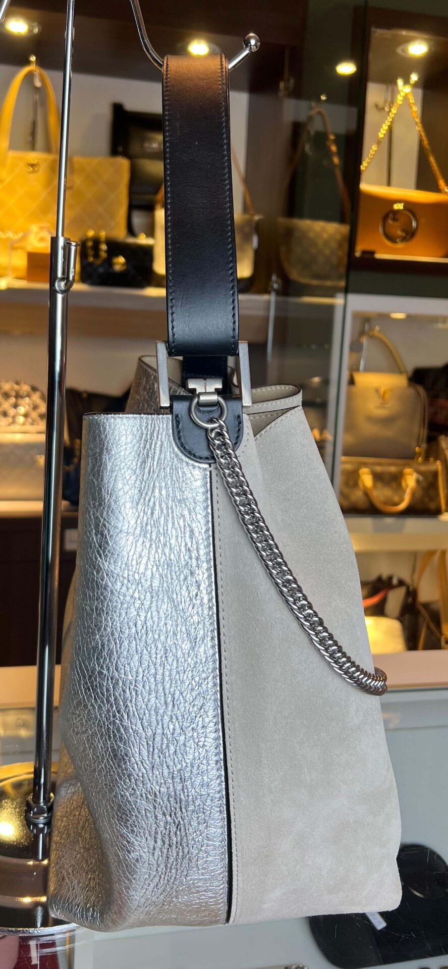 Givenchy Bucket Bag medium met suede, zwart leder en een zilveren lederen achterkant. Aan de binnenkant van het interieur zitten enkele penstrepen. Een hele leuke bucket bag met dustbag.