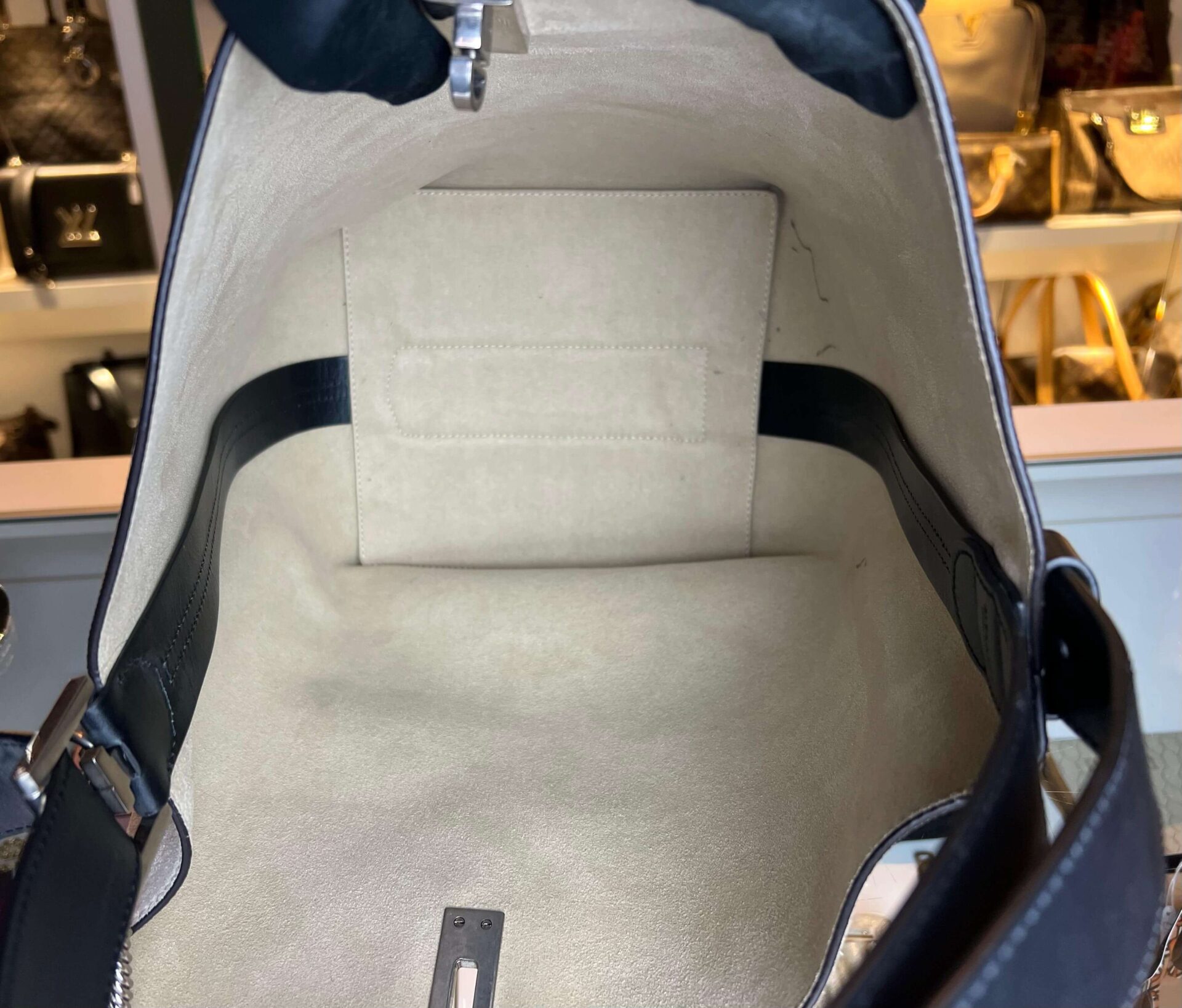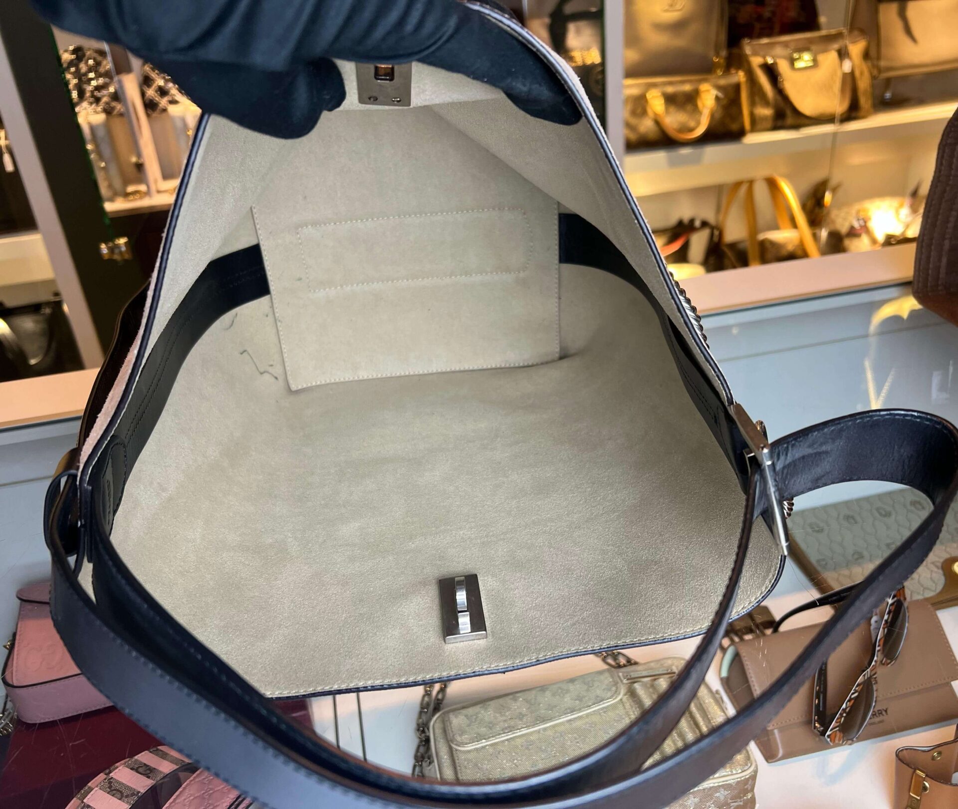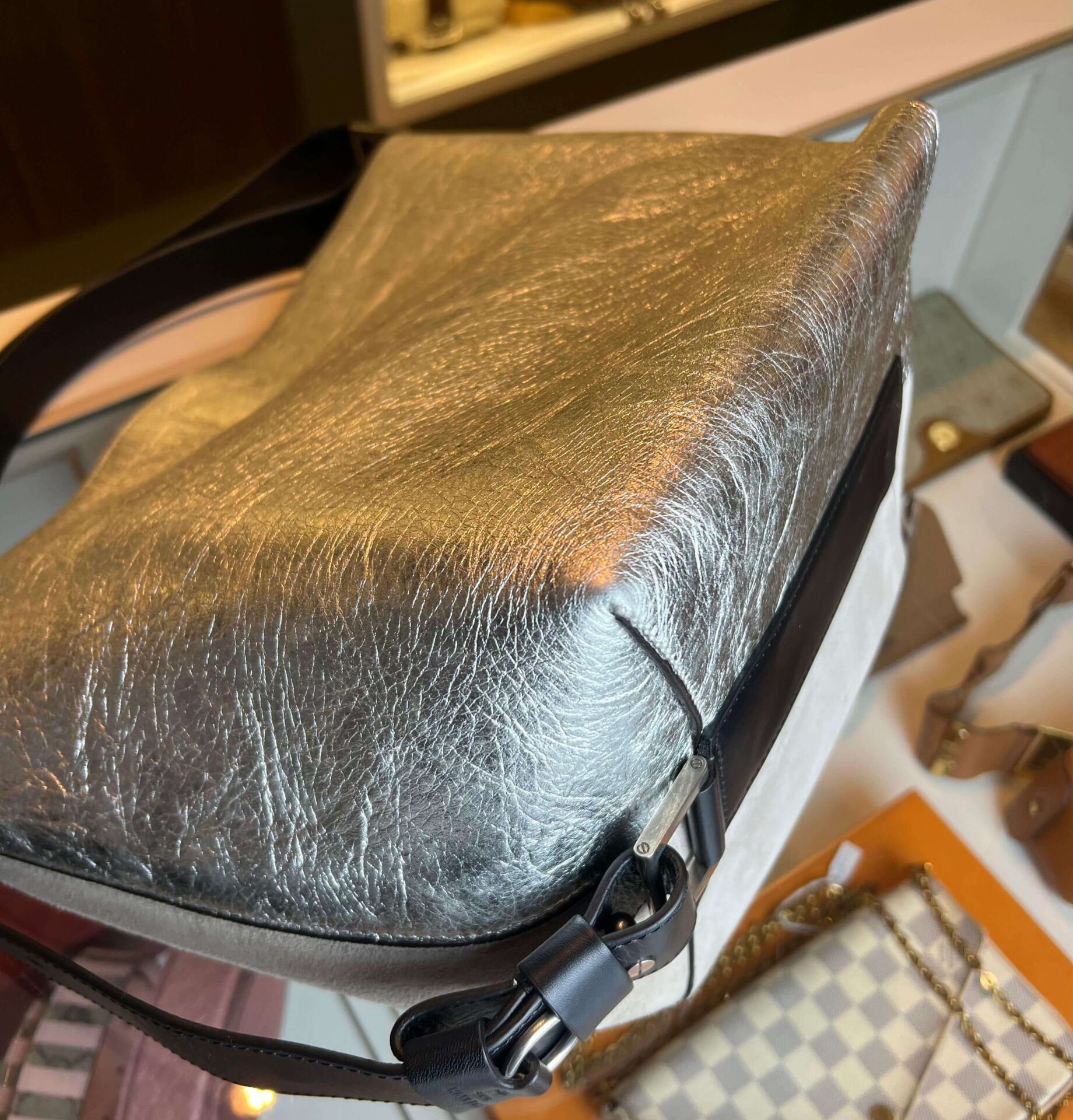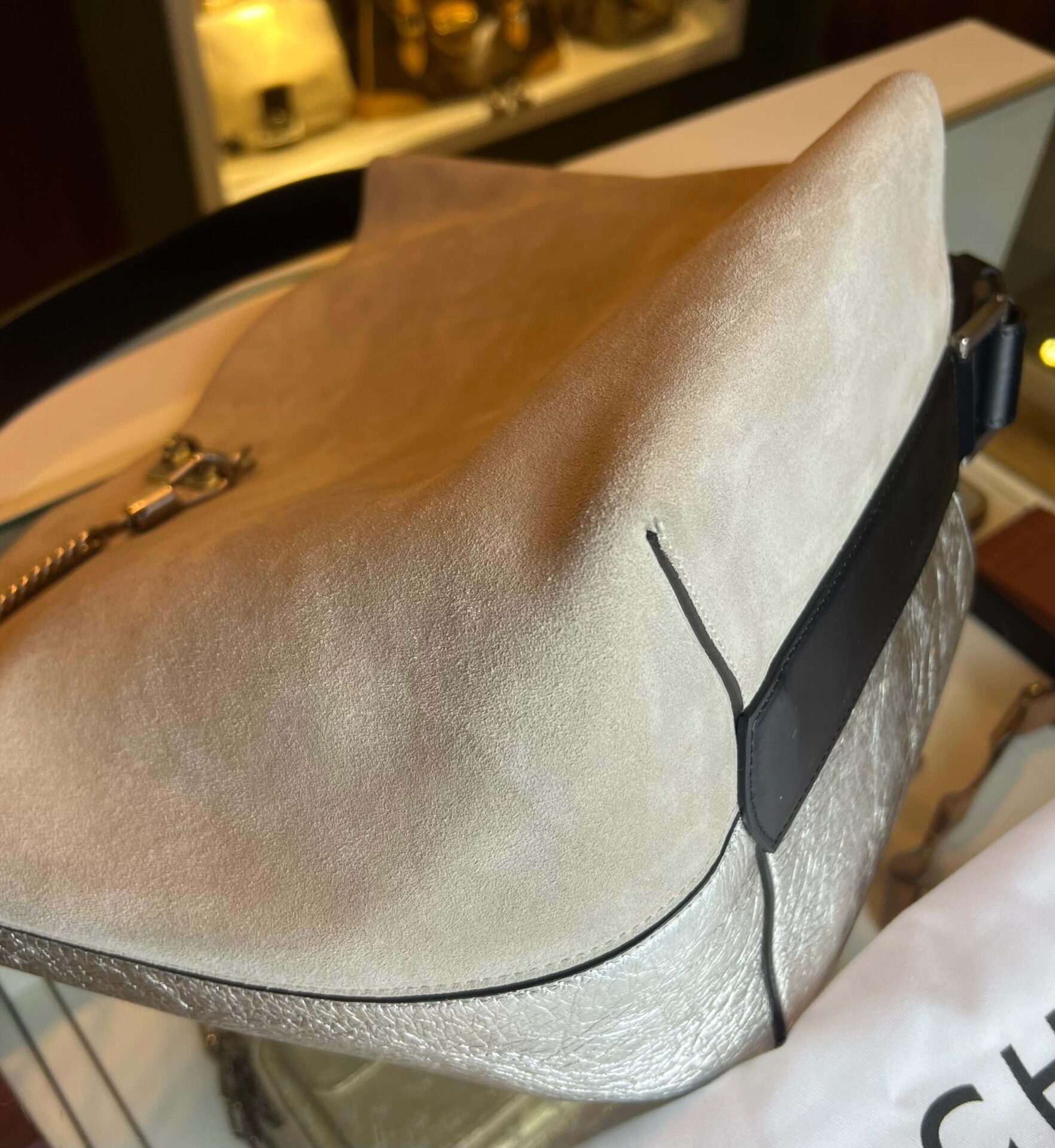 Givenchy Bucket Bag medium met suede, zwart leder en een zilveren lederen achterkant. Aan de binnenkant van het interieur zitten enkele penstrepen. Een hele leuke bucket bag met dustbag.