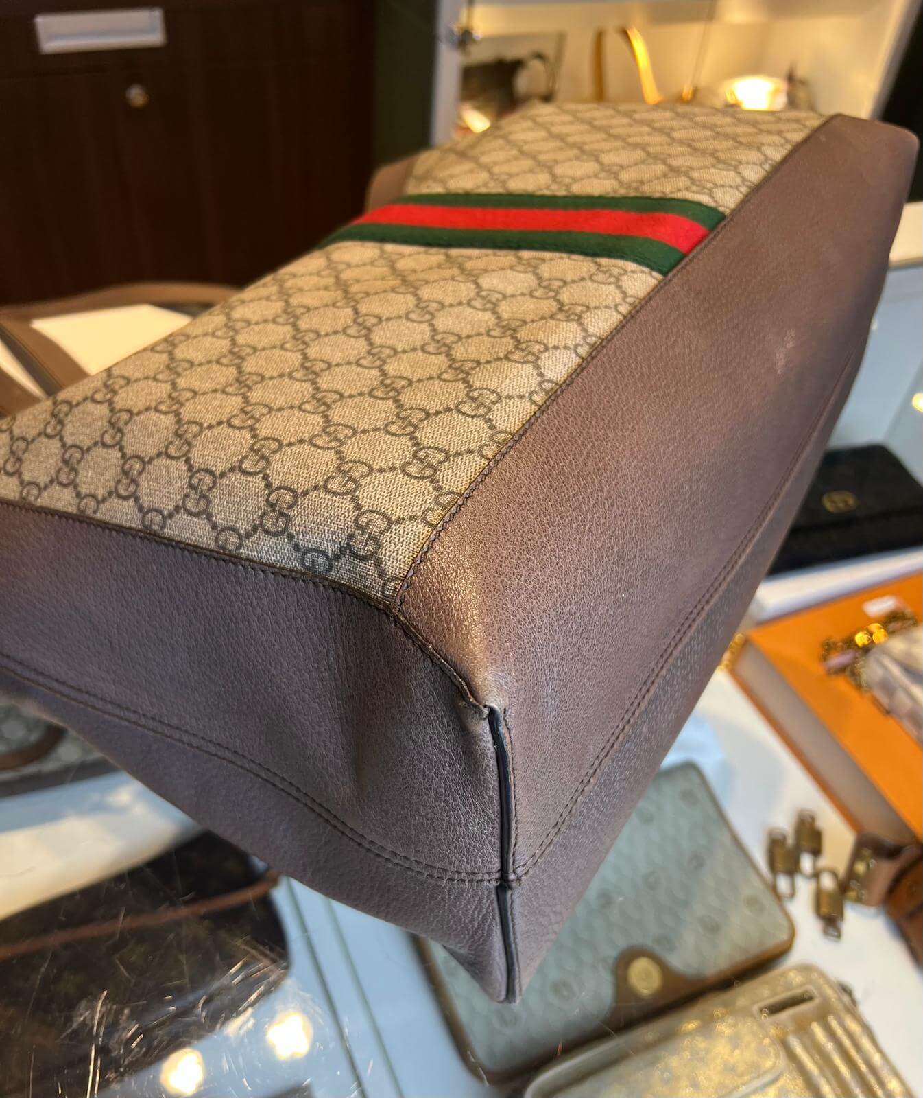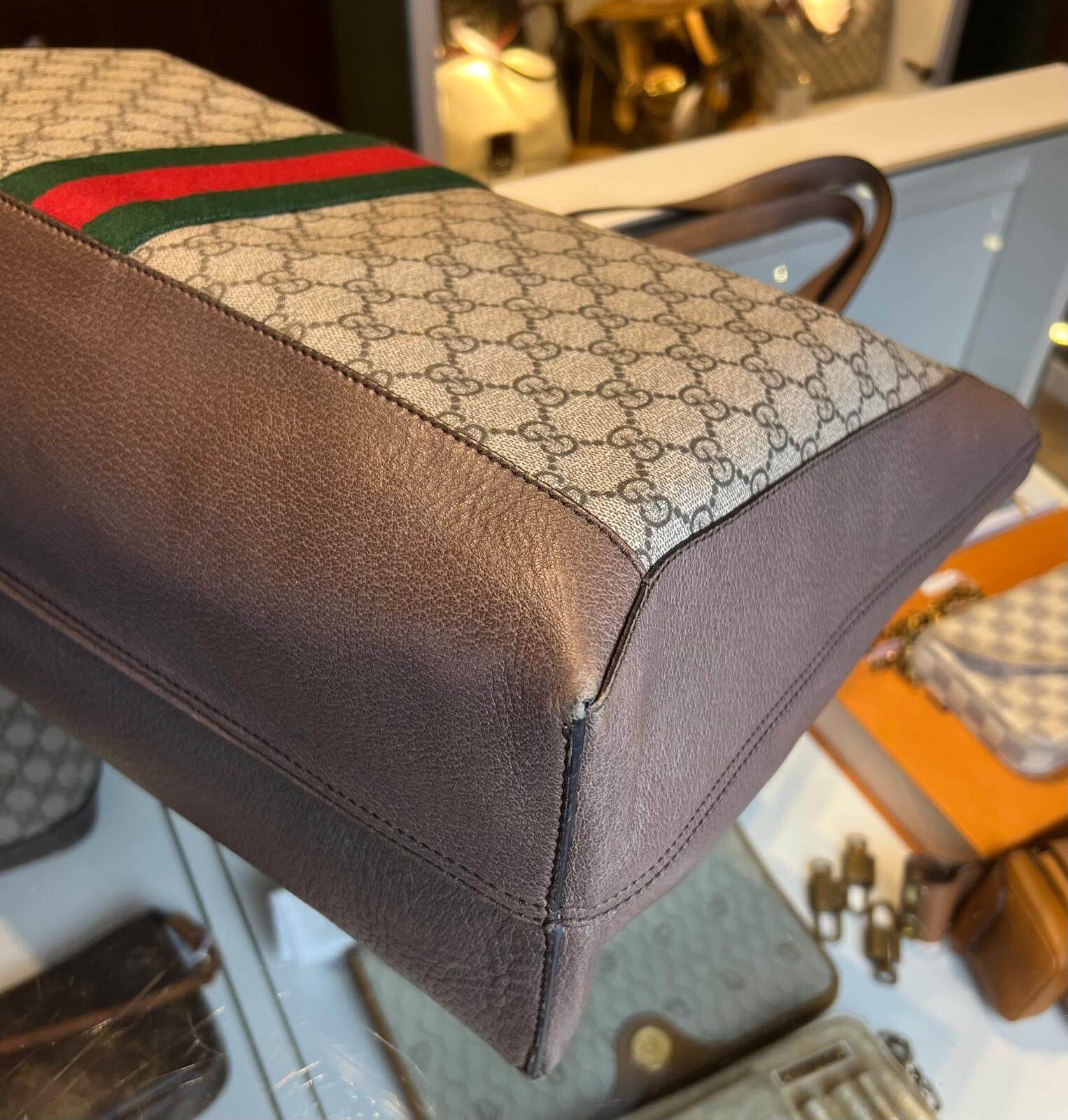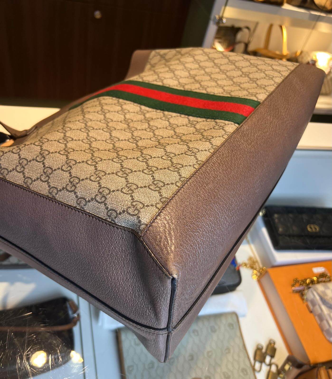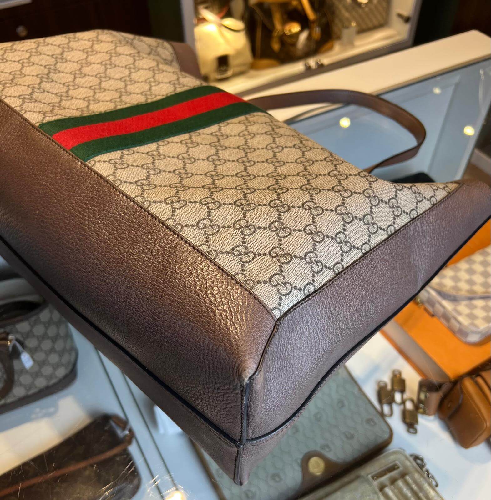 Gucci Medium Ophidia Tote Bag in de monogram kleuren van Gucci en de leuke streep! Het is een grote shopper, ideaal met een bag insert voor stevigheid en vakken. Het interieur is gebruikt. Exterior is netjes.