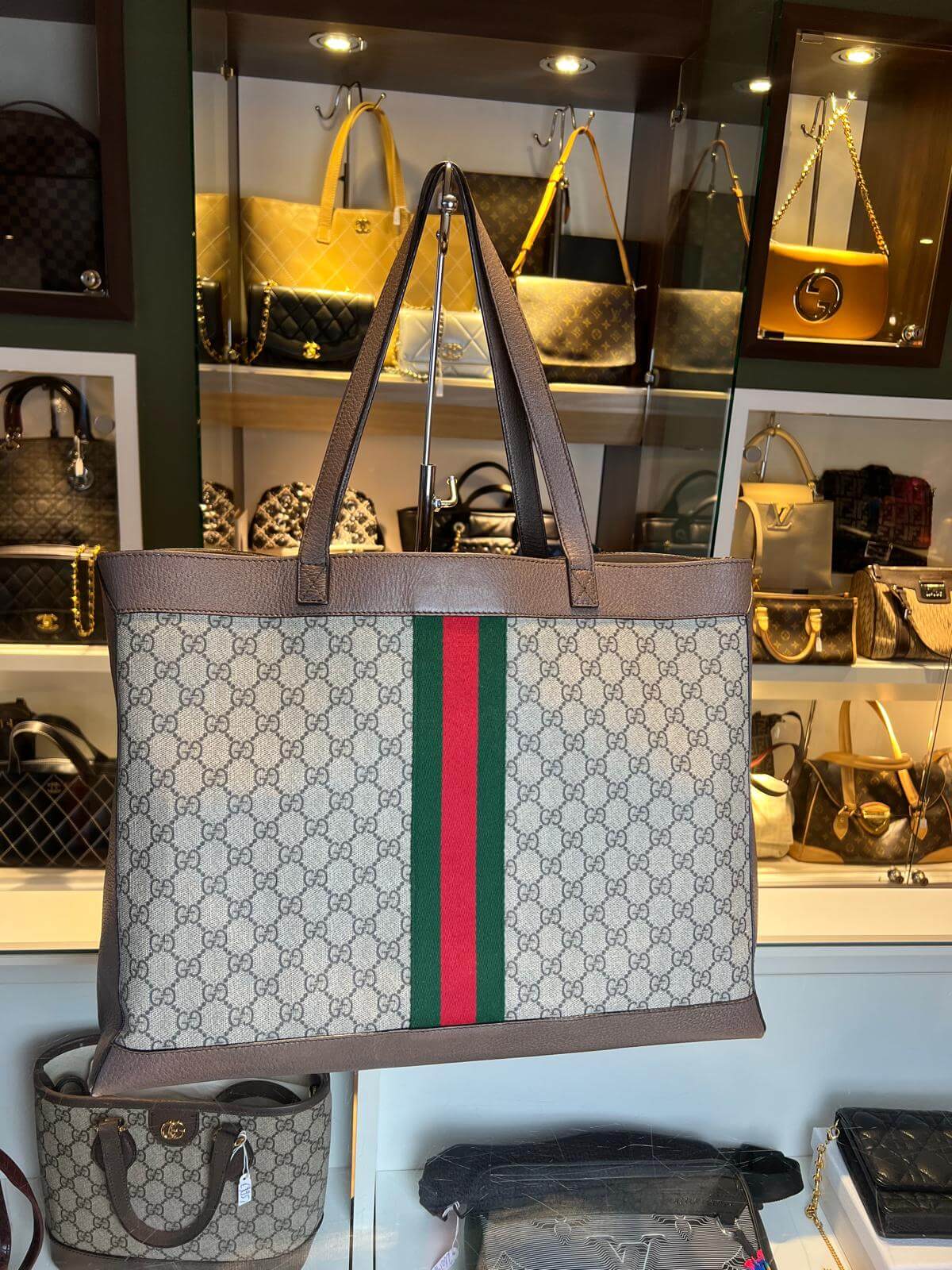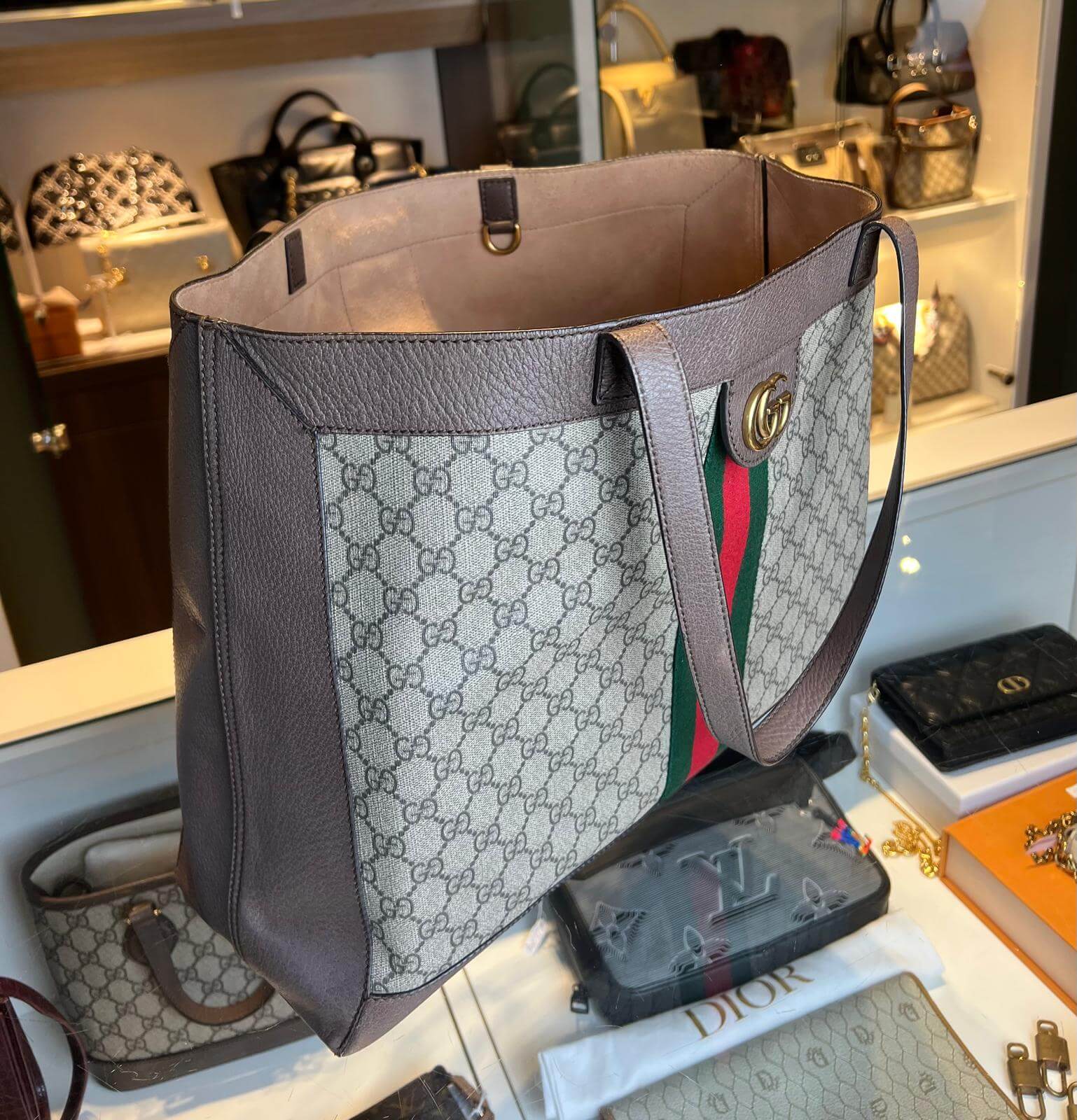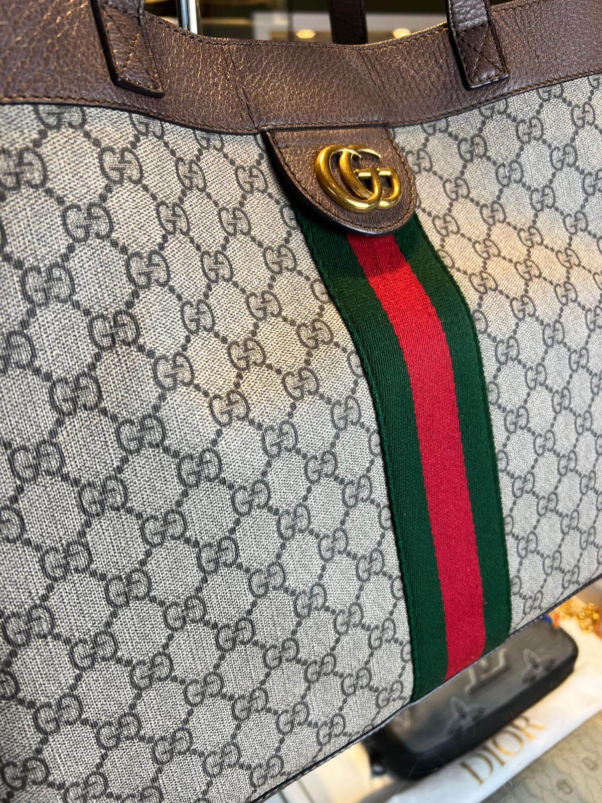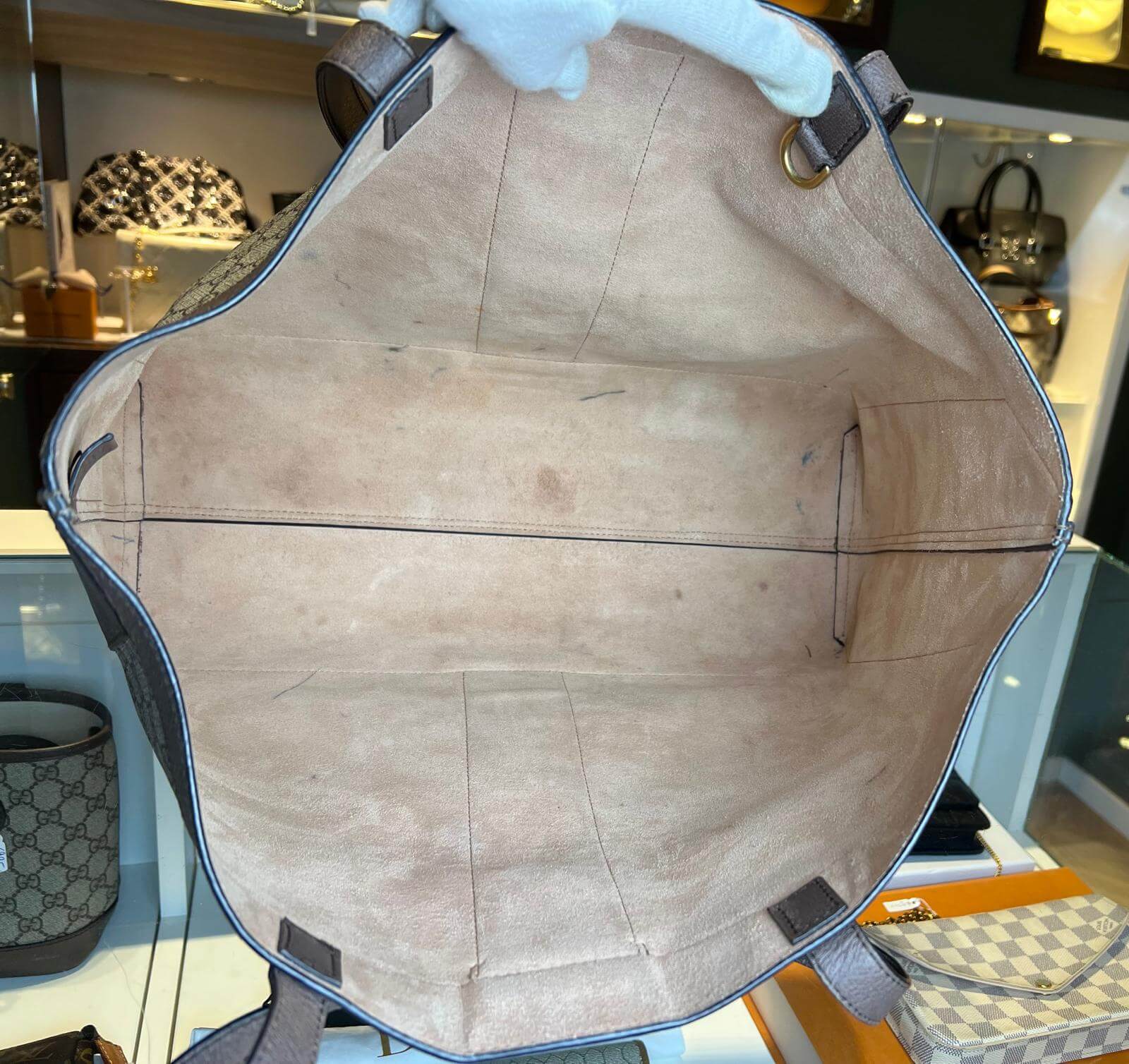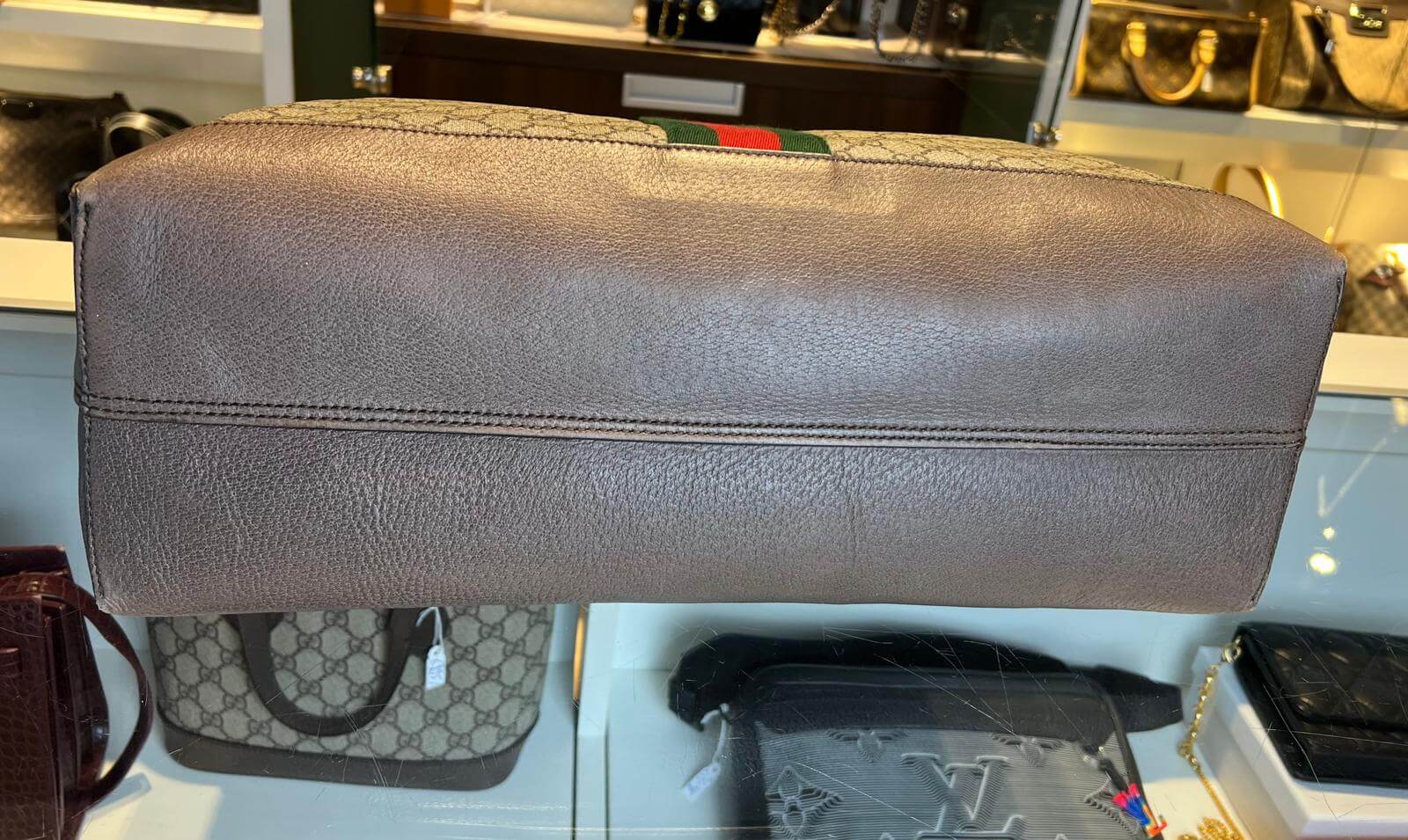 Gucci Medium Ophidia Tote Bag in de monogram kleuren van Gucci en de leuke streep! Het is een grote shopper, ideaal met een bag insert voor stevigheid en vakken. Het interieur is gebruikt. Exterior is netjes.