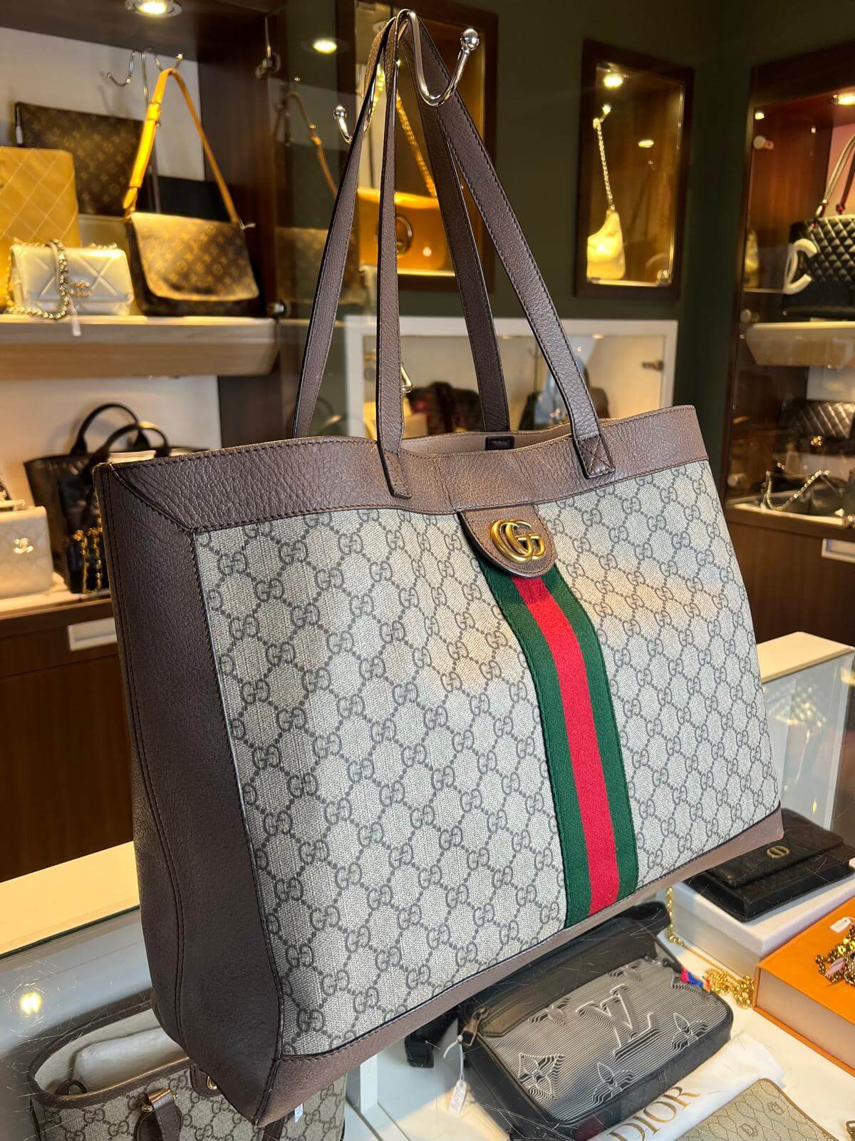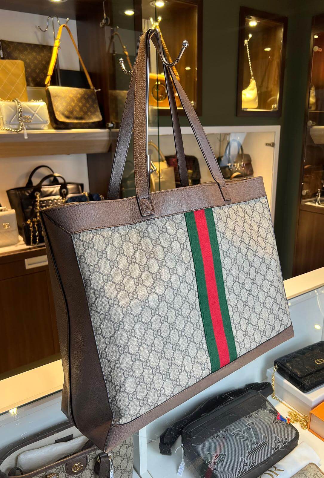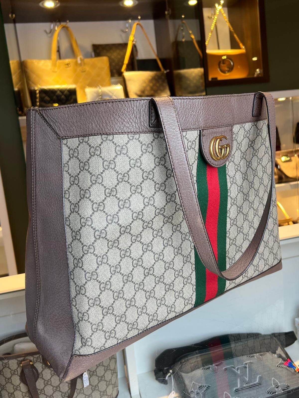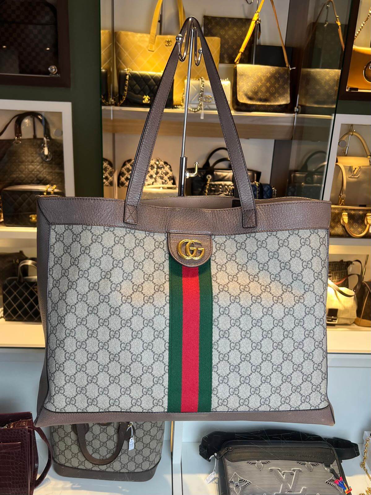 Gucci Medium Ophidia Tote Bag in de monogram kleuren van Gucci en de leuke streep! Het is een grote shopper, ideaal met een bag insert voor stevigheid en vakken. Het interieur is gebruikt. Exterior is netjes.