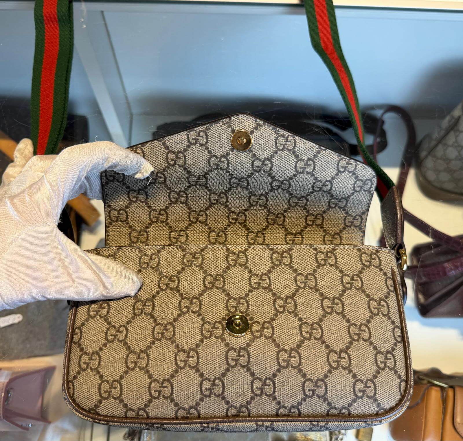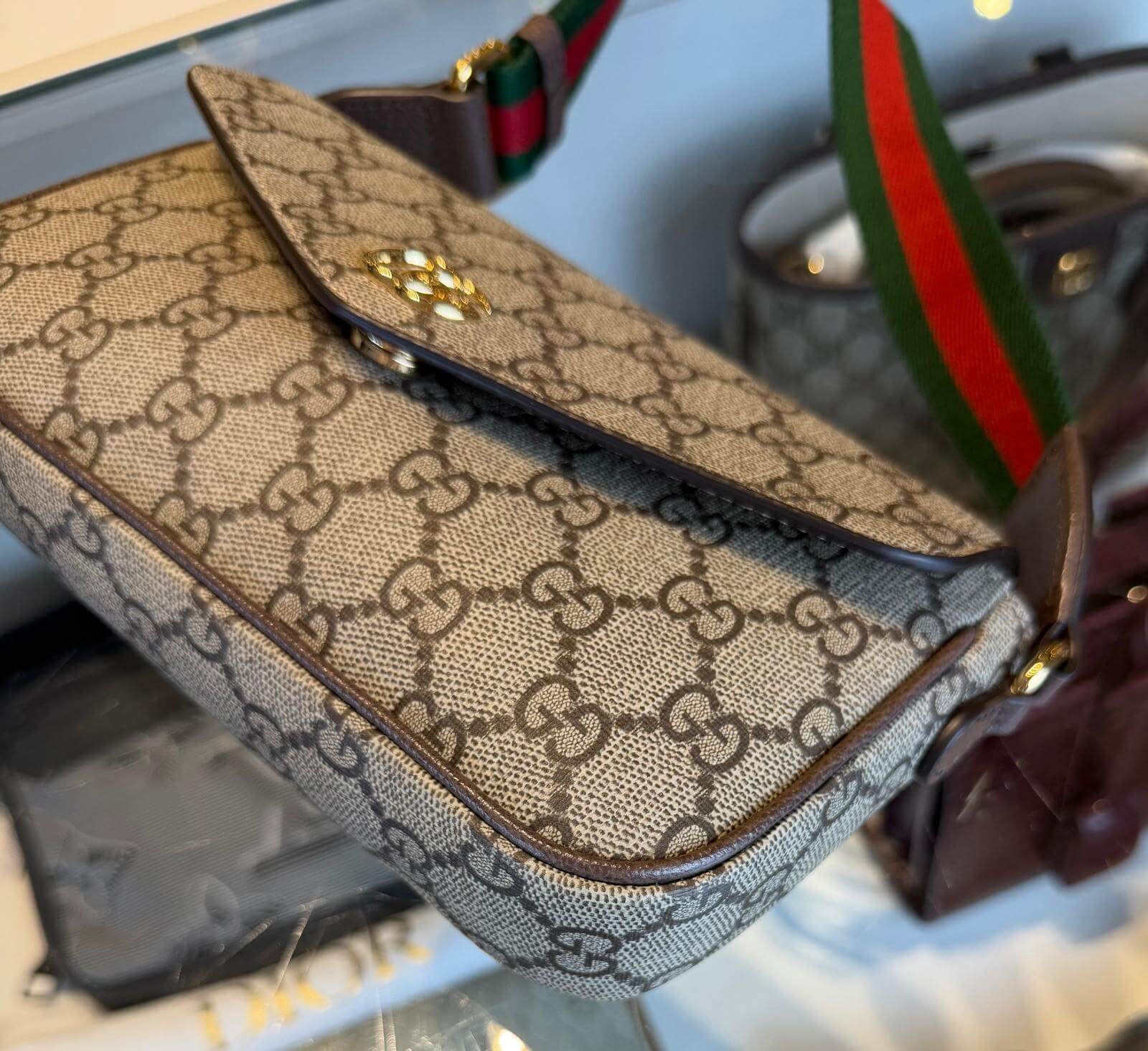 Gucci Ophidia Pochette in de GG monogram kleur, met verstelbare rood/groene band. De pochette verkeerd in een zeer goede staat (nieuwstaat) en komt als een full set.