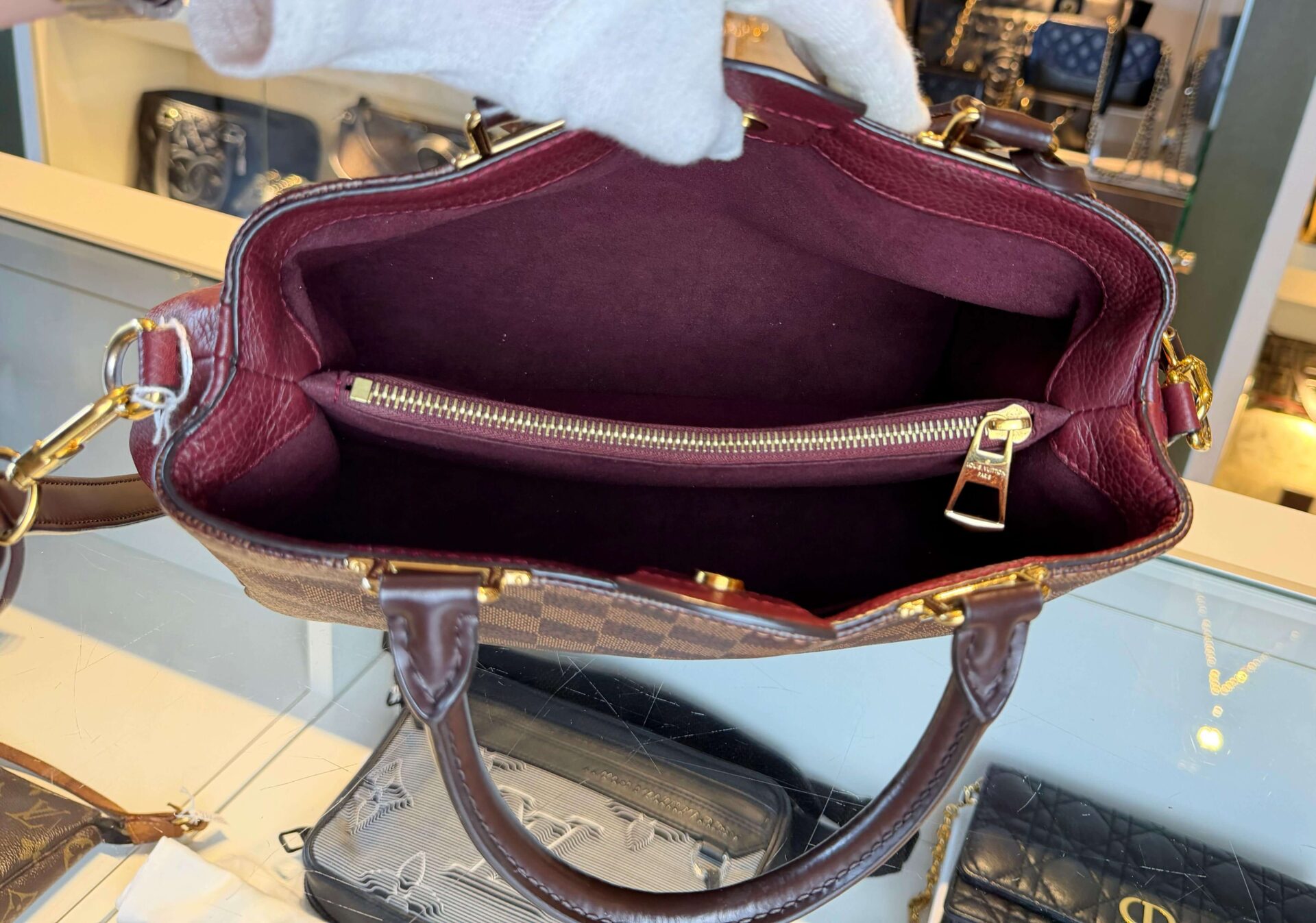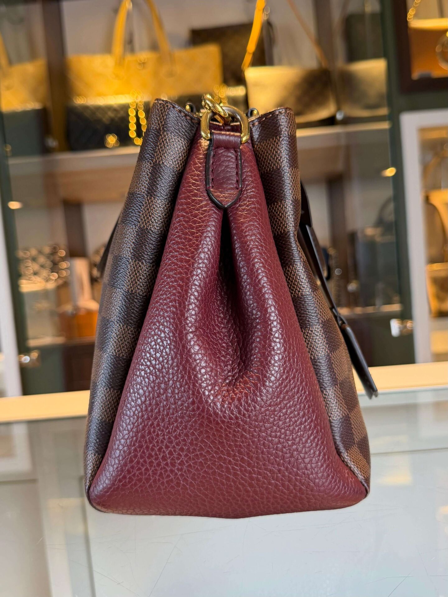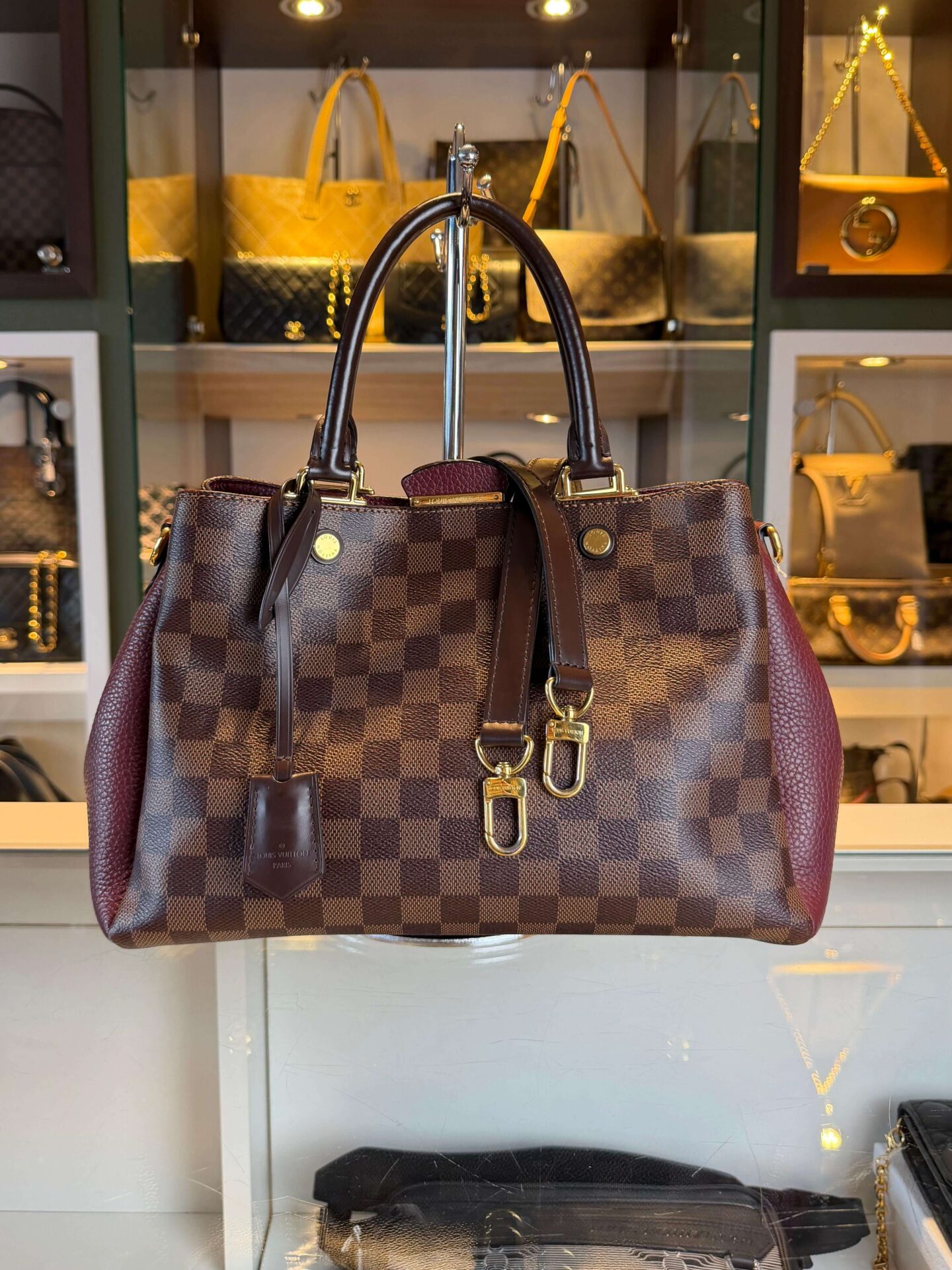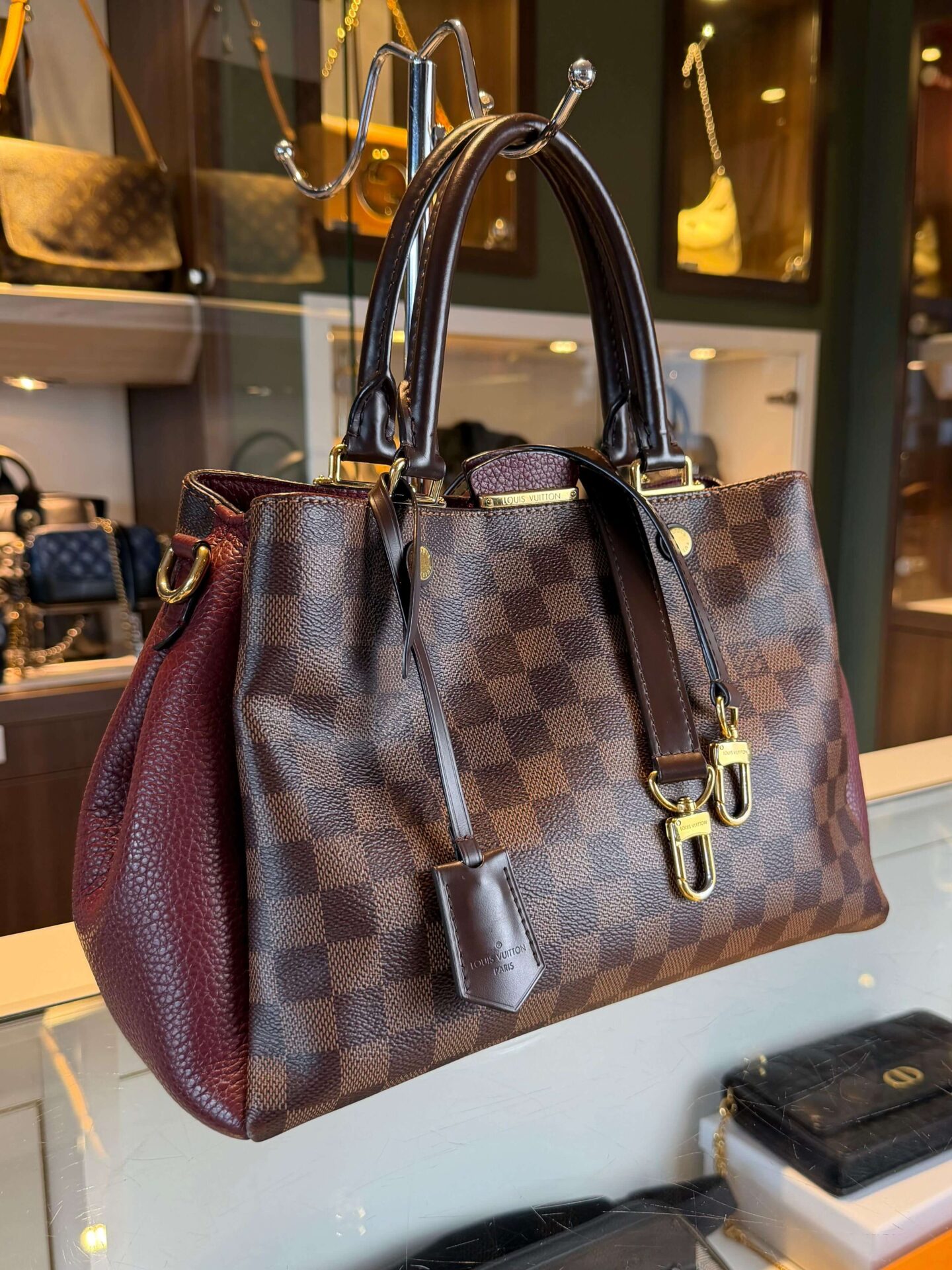 Louis Vuitton Brittany PM in de kleur damier ebene met bordeaux rood taurillon lederen stukken. Ze heeft een schouderband welk afneembaar is en gouden hardware. Een erg leuke handtas met 2 grote compartimenten, en 1 vak met ritssluiting.