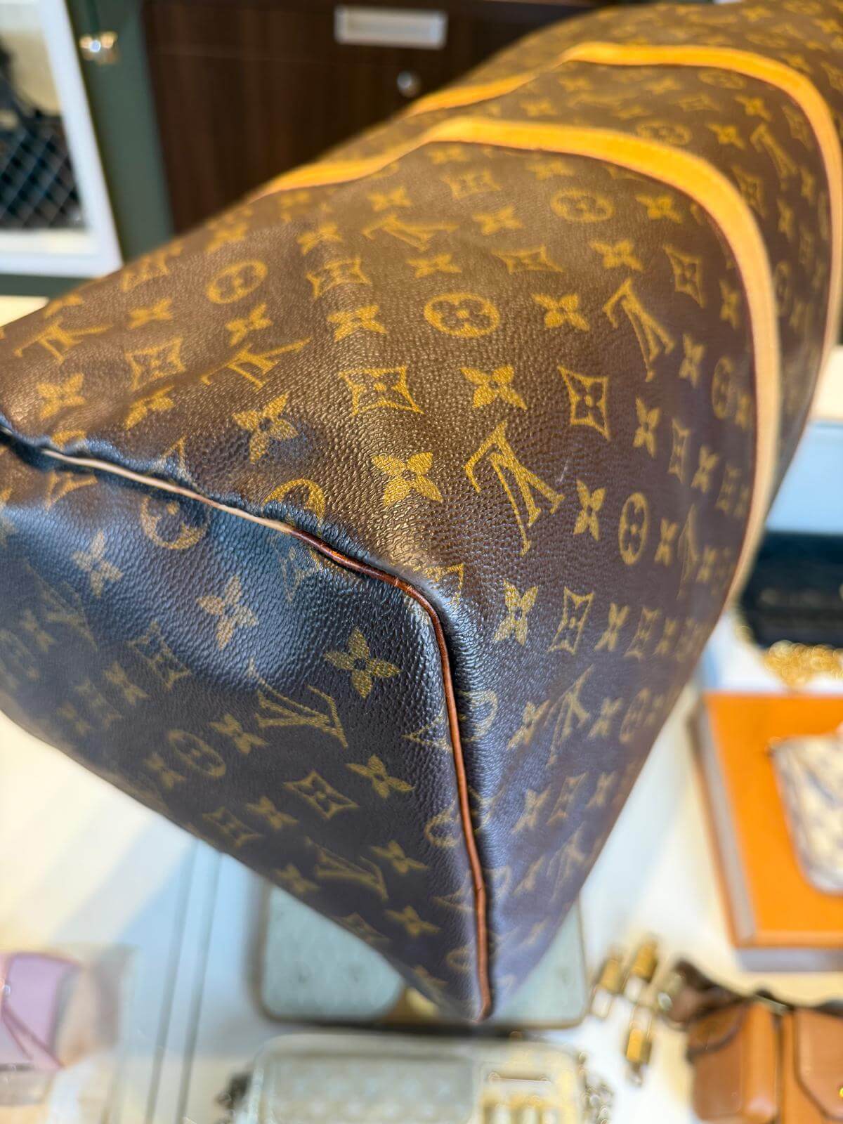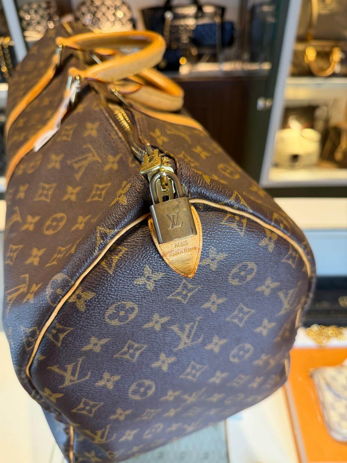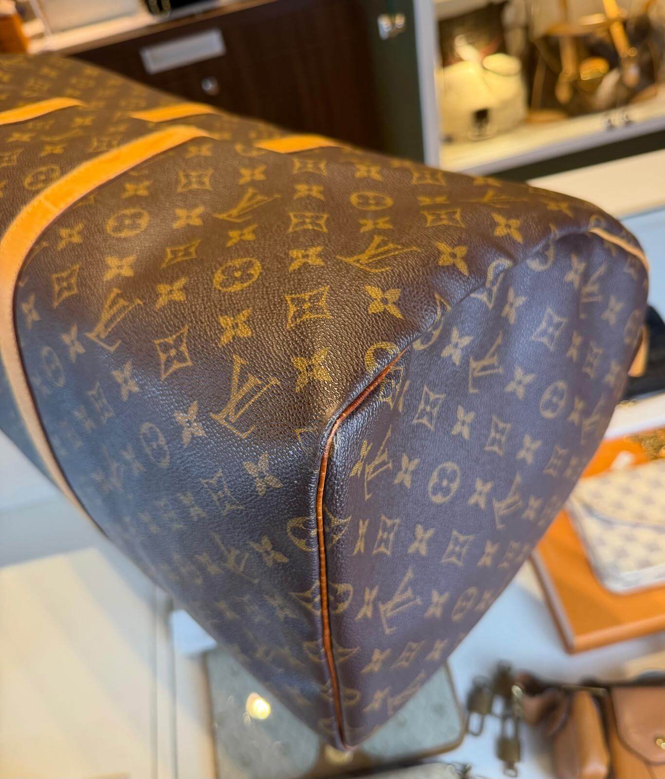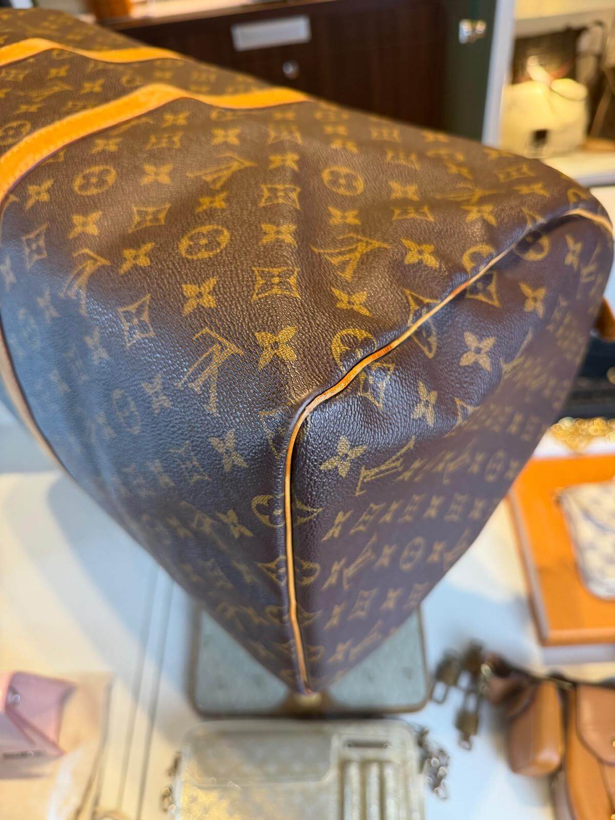 De handige en leukste weekendtas: Louis Vuitton Keepall 50. Interieur is ook volledig schoon en het slotje is aanwezig (sleutels niet meer). Ze heeft wat gebruikers vlekjes op het vachetta leder. Naarmate de tas vaker wordt gebruikt verkleurd het leder vanzelf naar een honingkleur, en wordt het dus minder zichtbaar.
