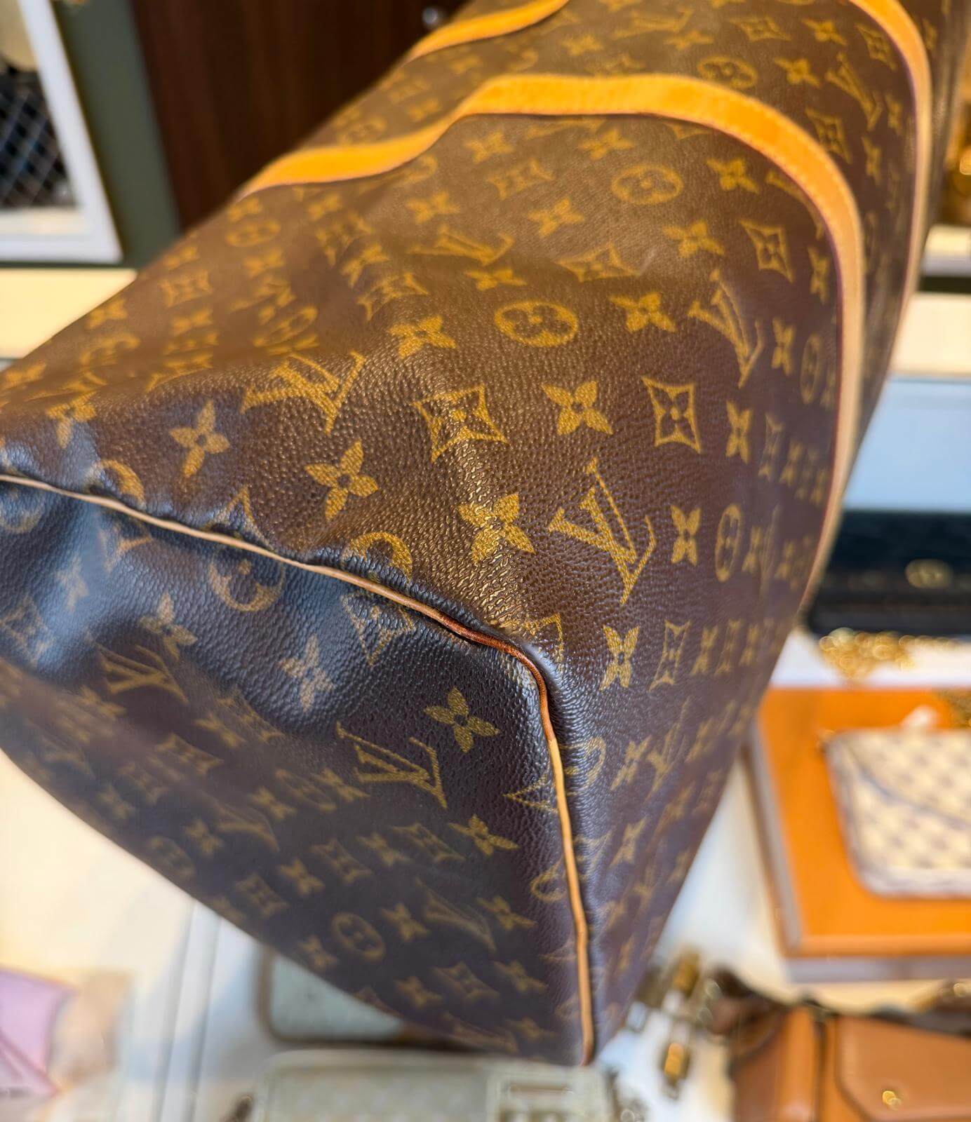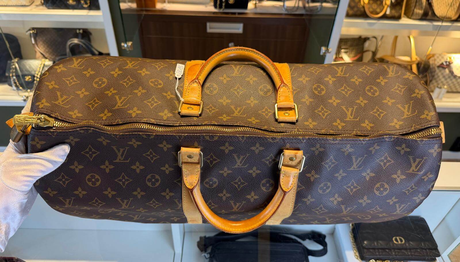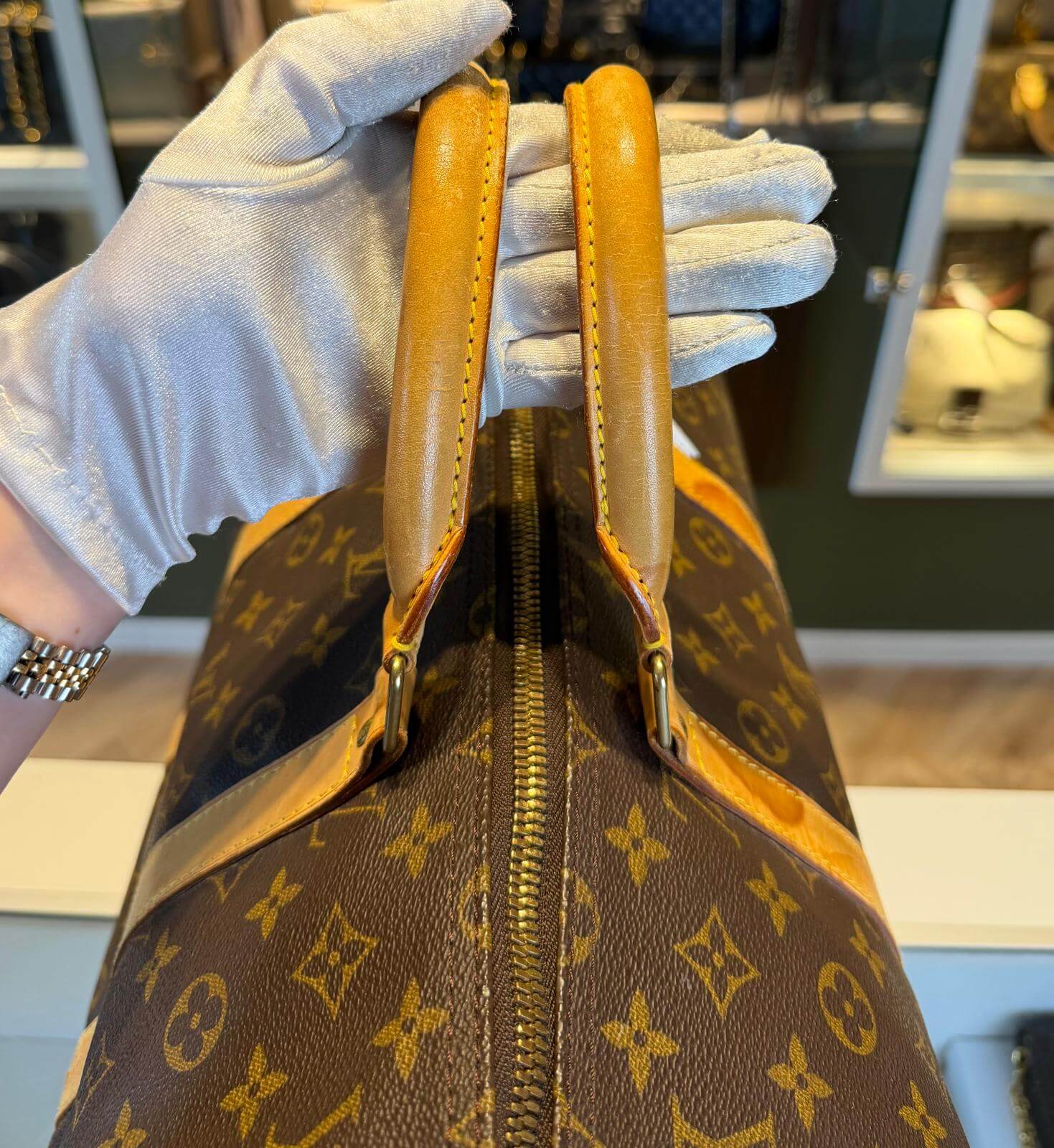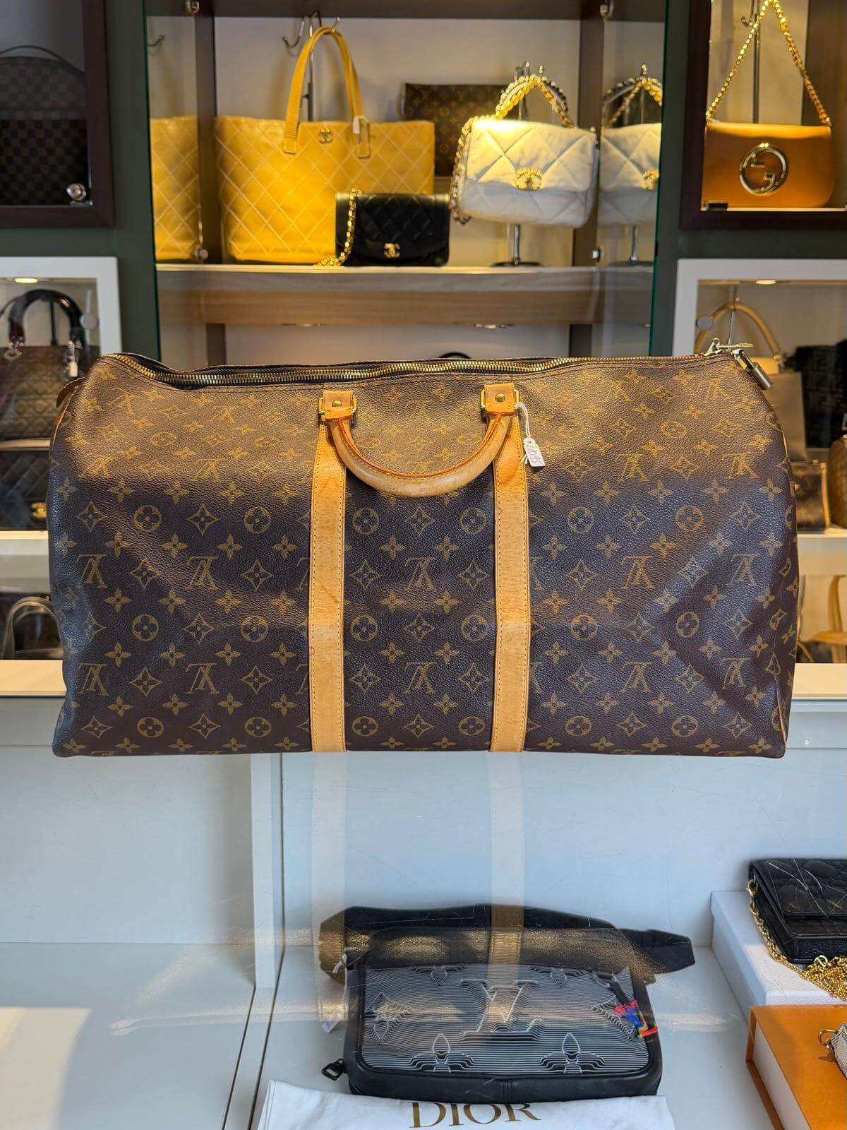 De handige en leukste weekendtas: Louis Vuitton Keepall 50. Interieur is ook volledig schoon en het slotje is aanwezig (sleutels niet meer). Ze heeft wat gebruikers vlekjes op het vachetta leder. Naarmate de tas vaker wordt gebruikt verkleurd het leder vanzelf naar een honingkleur, en wordt het dus minder zichtbaar.