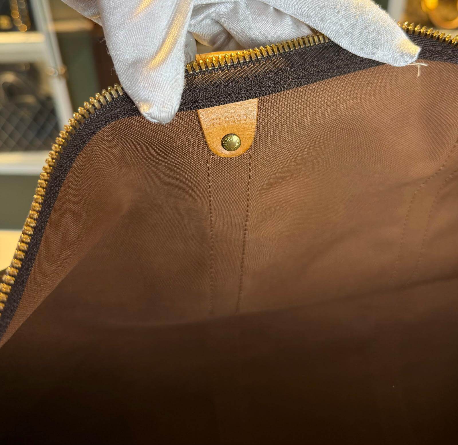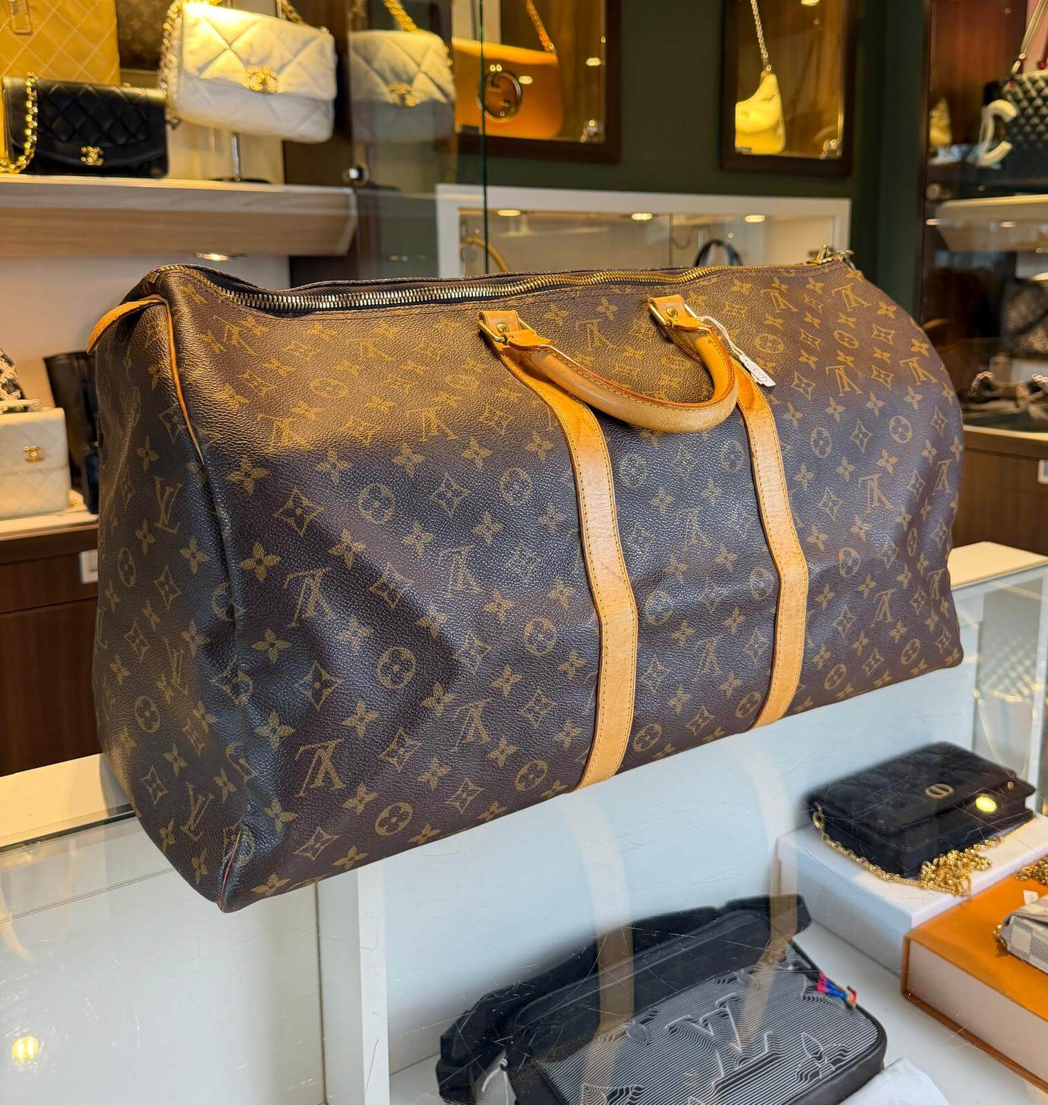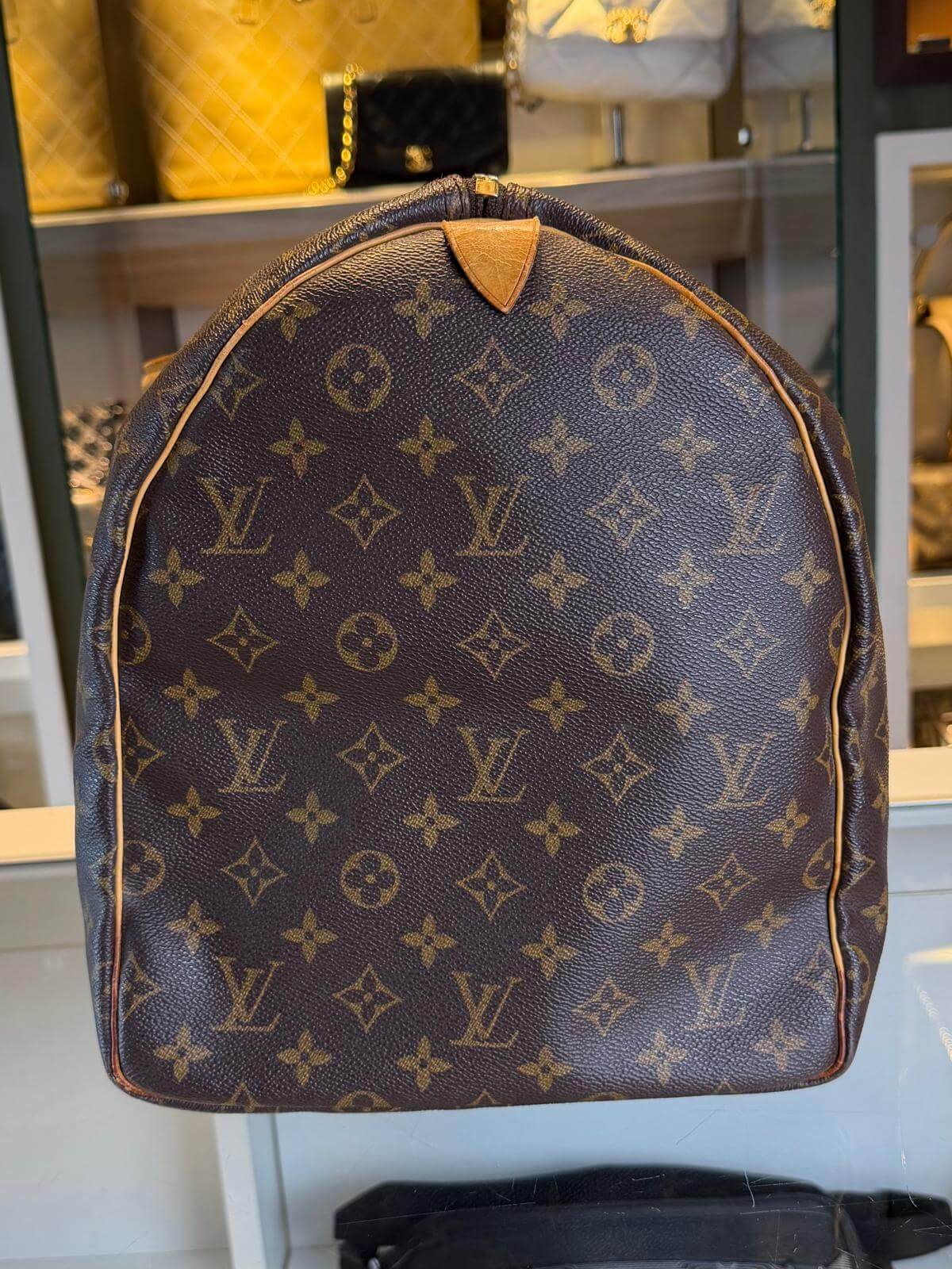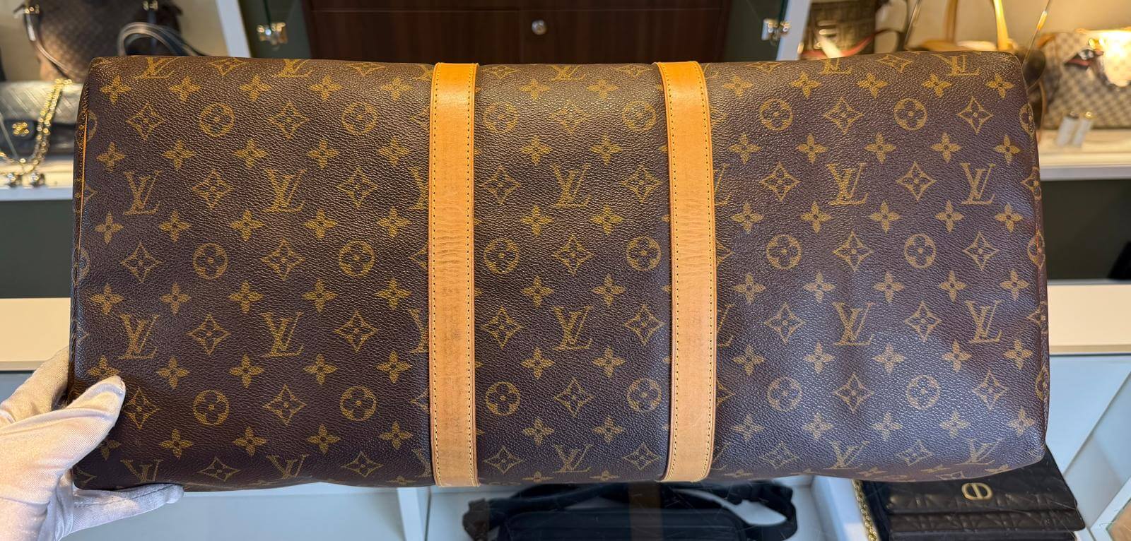 De handige en leukste weekendtas: Louis Vuitton Keepall 50. Interieur is ook volledig schoon en het slotje is aanwezig (sleutels niet meer). Ze heeft wat gebruikers vlekjes op het vachetta leder. Naarmate de tas vaker wordt gebruikt verkleurd het leder vanzelf naar een honingkleur, en wordt het dus minder zichtbaar.