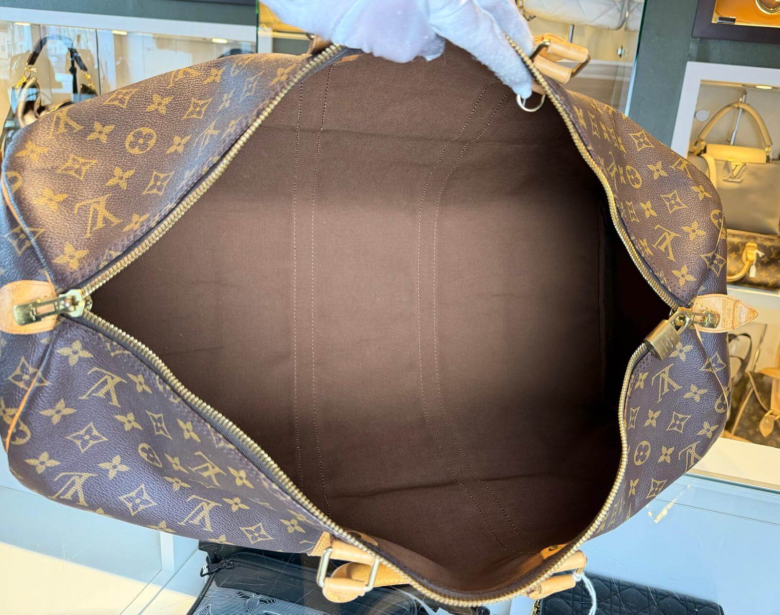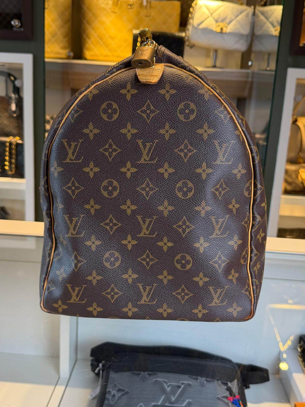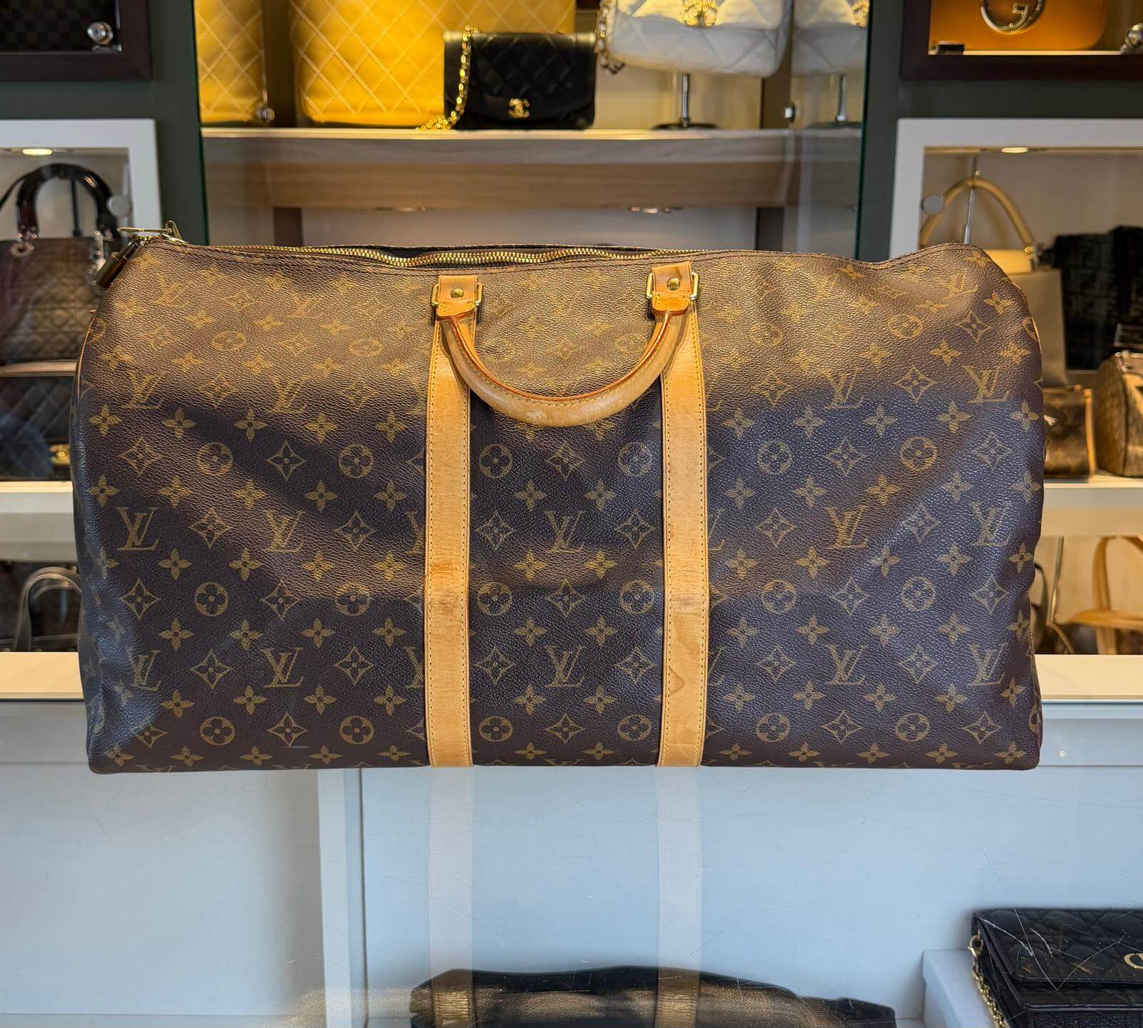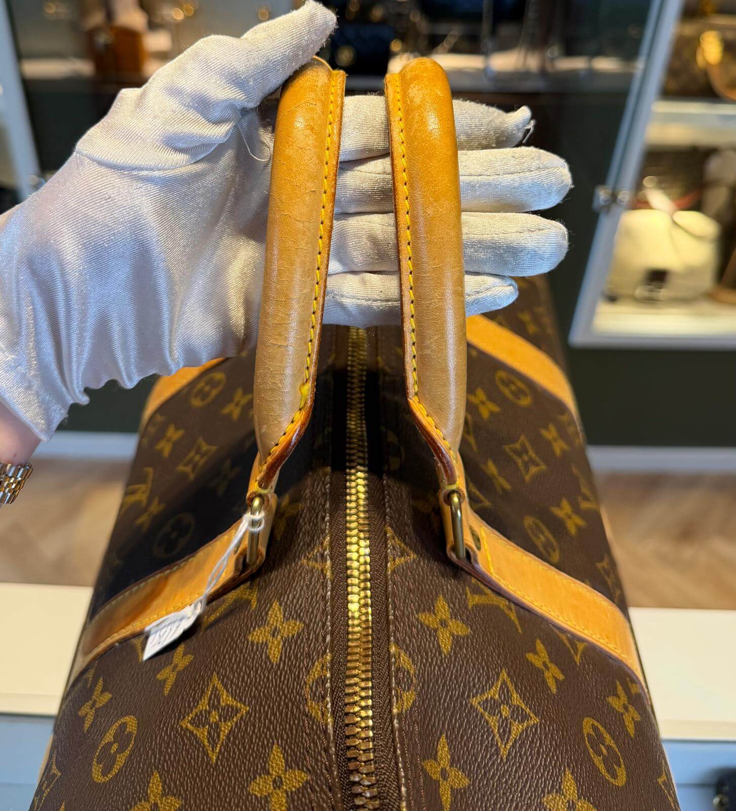 De handige en leukste weekendtas: Louis Vuitton Keepall 50. Interieur is ook volledig schoon en het slotje is aanwezig (sleutels niet meer). Ze heeft wat gebruikers vlekjes op het vachetta leder. Naarmate de tas vaker wordt gebruikt verkleurd het leder vanzelf naar een honingkleur, en wordt het dus minder zichtbaar.