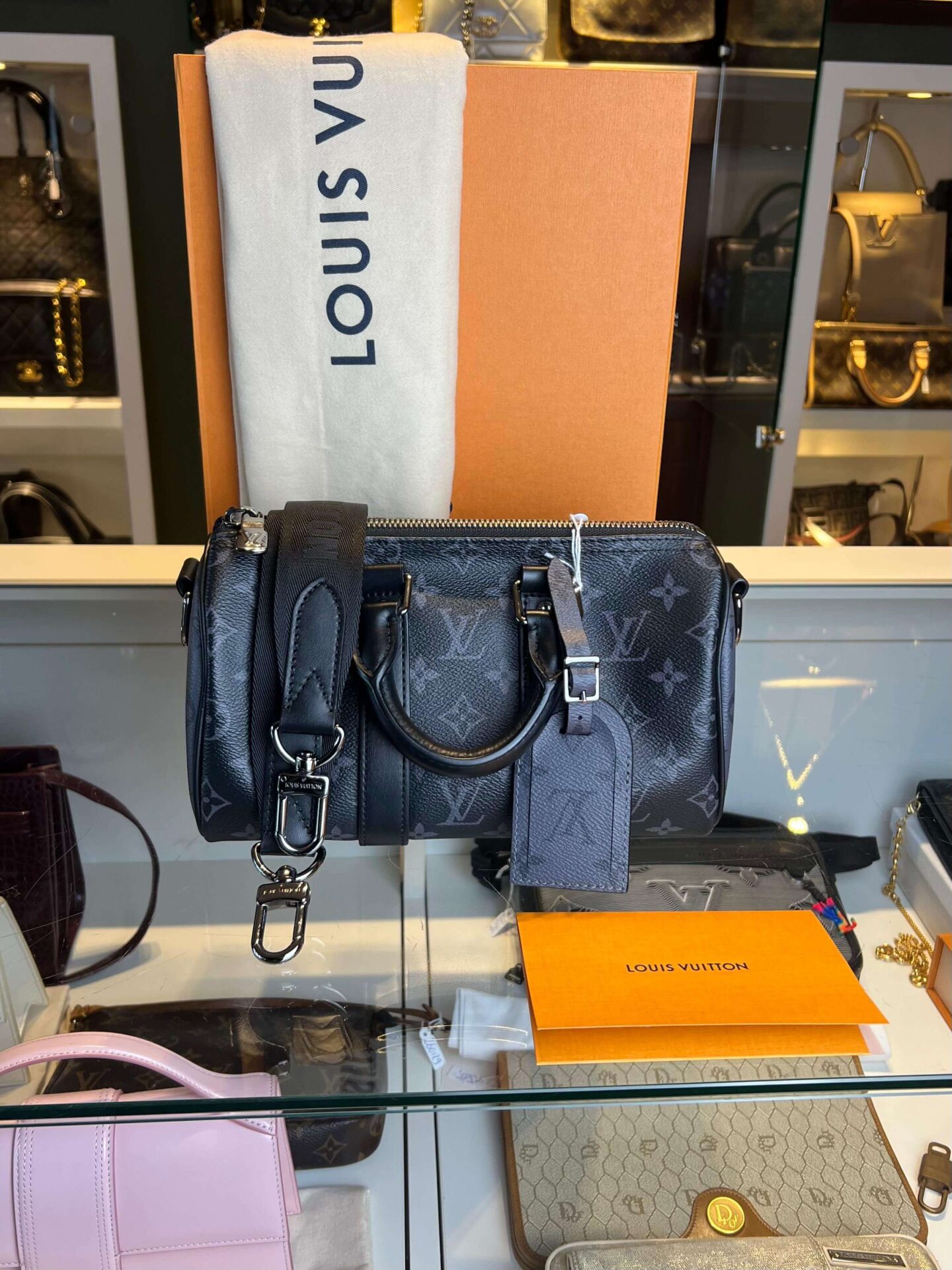 Louis Vuitton Keepall Bandoulière 25 Monogram Eclipse, full set uit 2022! Doos, dustbag en bon. Het betreft een superleuke crossbody en handtas, origine mannen collectie.